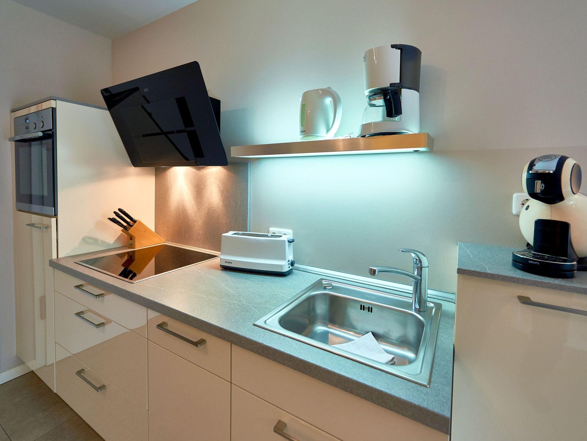 Die voll ausgestattete Küche überzeugt mit einem Ceranherd inkl. Abzugshaube, einem hochgestelltem Backofen, einem Kühlschrank mit Gefrierfach, einem Geschirrspülautomat sowie Kaffeemaschine, einer Dolce-Gusto Espressomaschine, Toaster, Wasserkocher etc. Der Esstisch bietet vier Personen Platz zum gemeinsamen Dinieren. Bis zum nächsten Bäcker für die frischen Frühstücksbrötchen sind es übrigens nur wenige Gehminuten.
