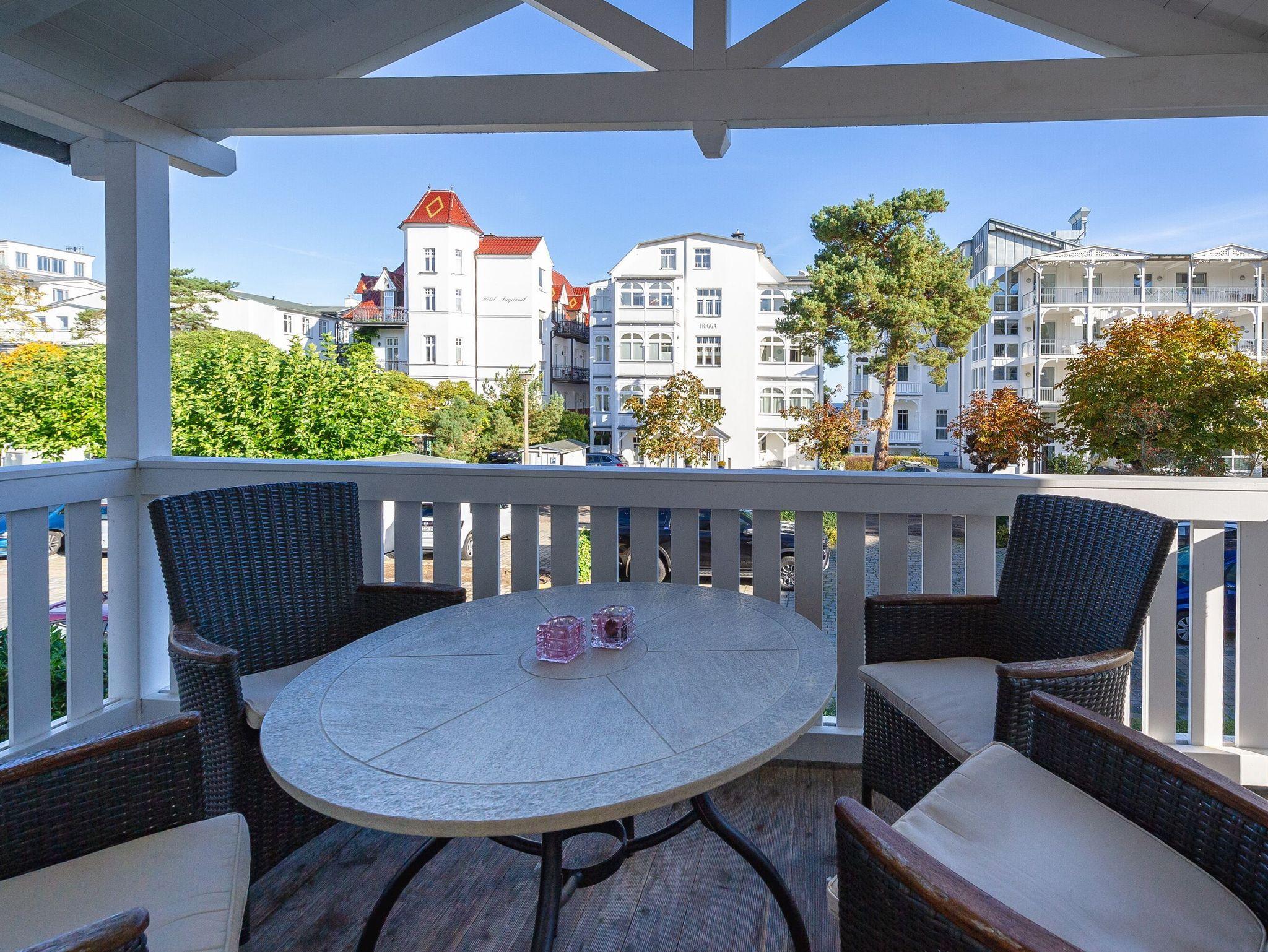 Vom Wohnbereich aus gelangen Sie durch eine breite Balkontür auf den großzügigen, überdachten Balkon mit Tisch und 4 Stühlen. Hier können Sie wind- und wettergeschützt an der frischen Seeluft relaxen und natürlich auch speisen.