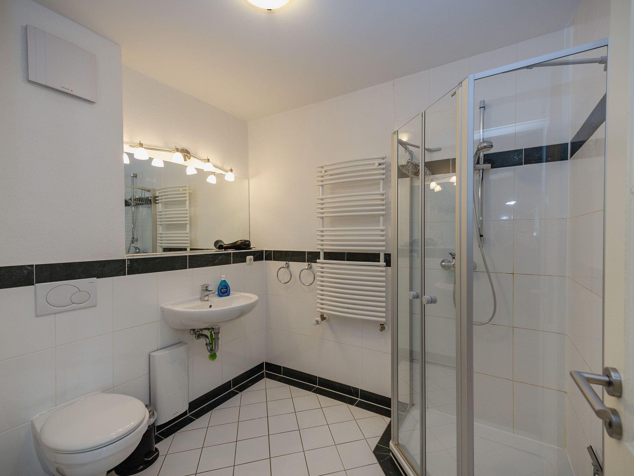 Das geräumige Badezimmer bietet Ihnen Dusche/WC, ein Waschbecken mit großem Spiegel und einen Fön. Genügend Ablageflächen für Ihre persönlichen Utensilien sind ebenfalls vorhanden.