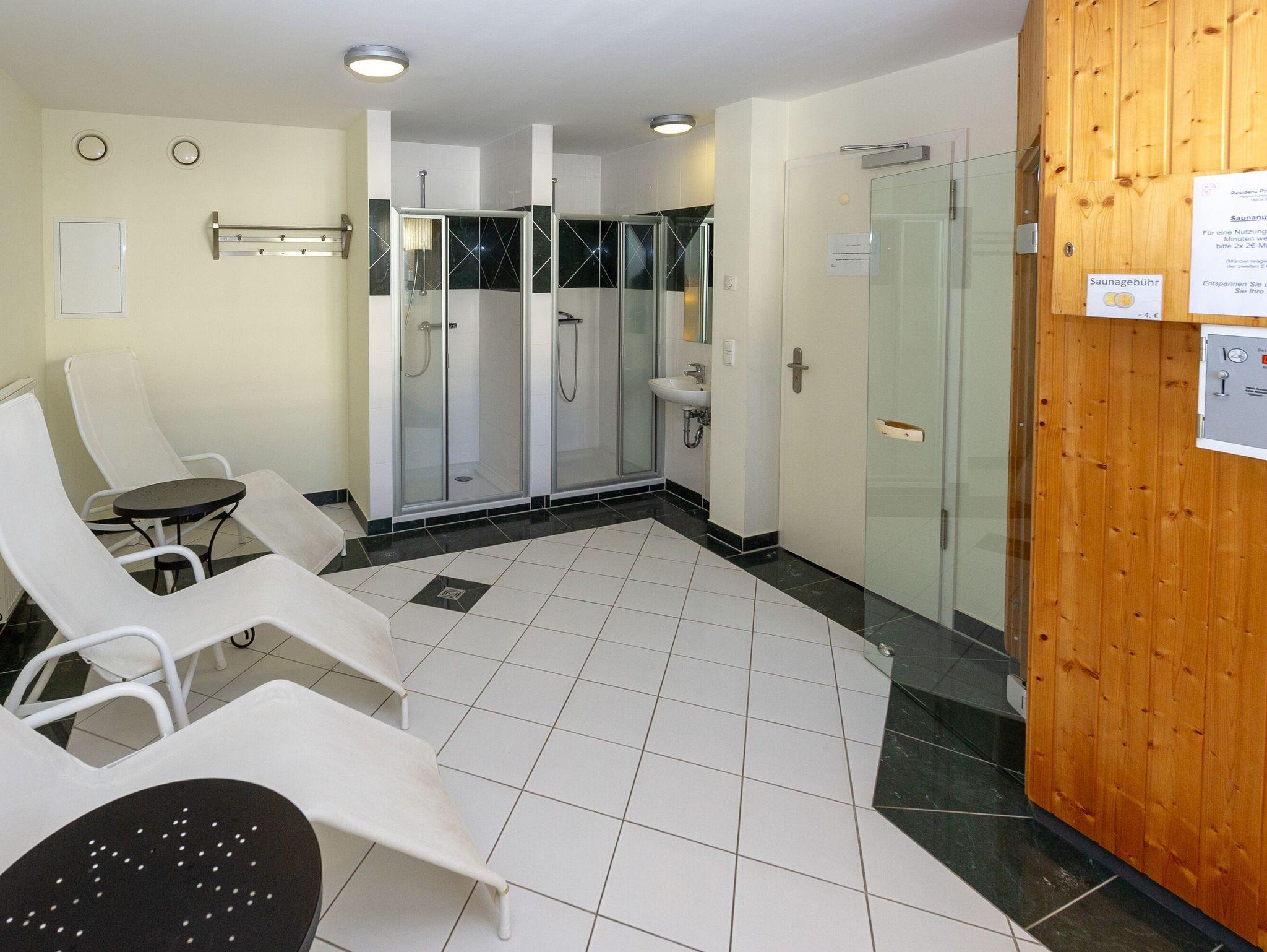 • gemeinschaftlich nutzbar für alle Hausgäste sind der Saunabereich sowie eine Waschmaschine und ein Trockner (jeweils Münzautomaten)