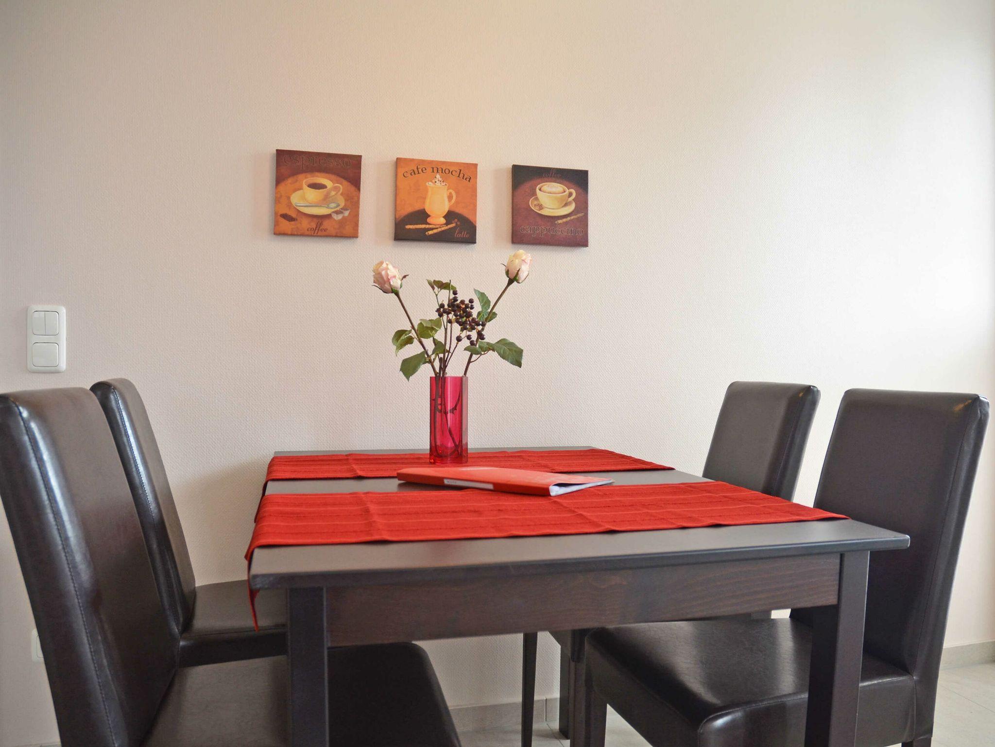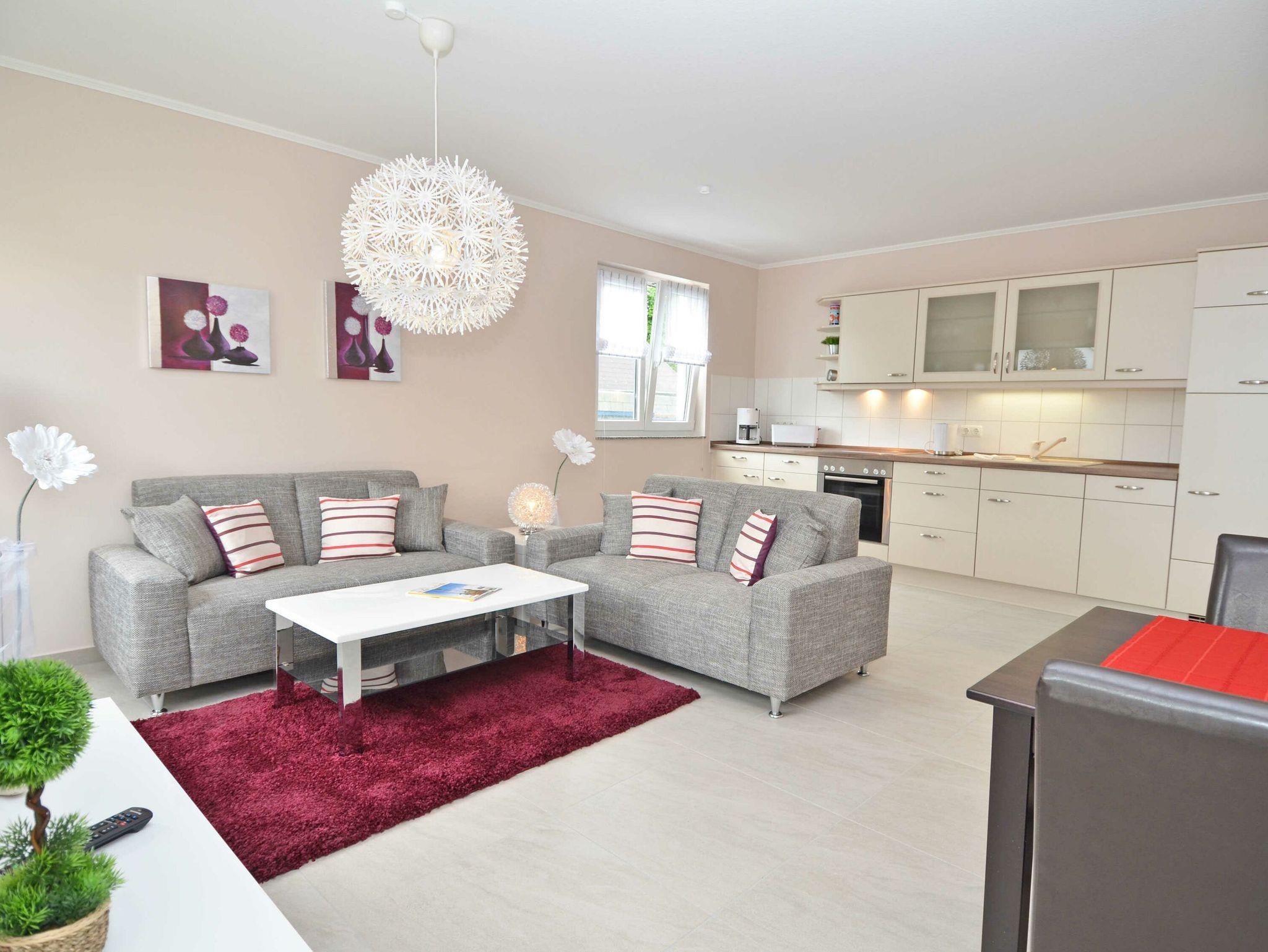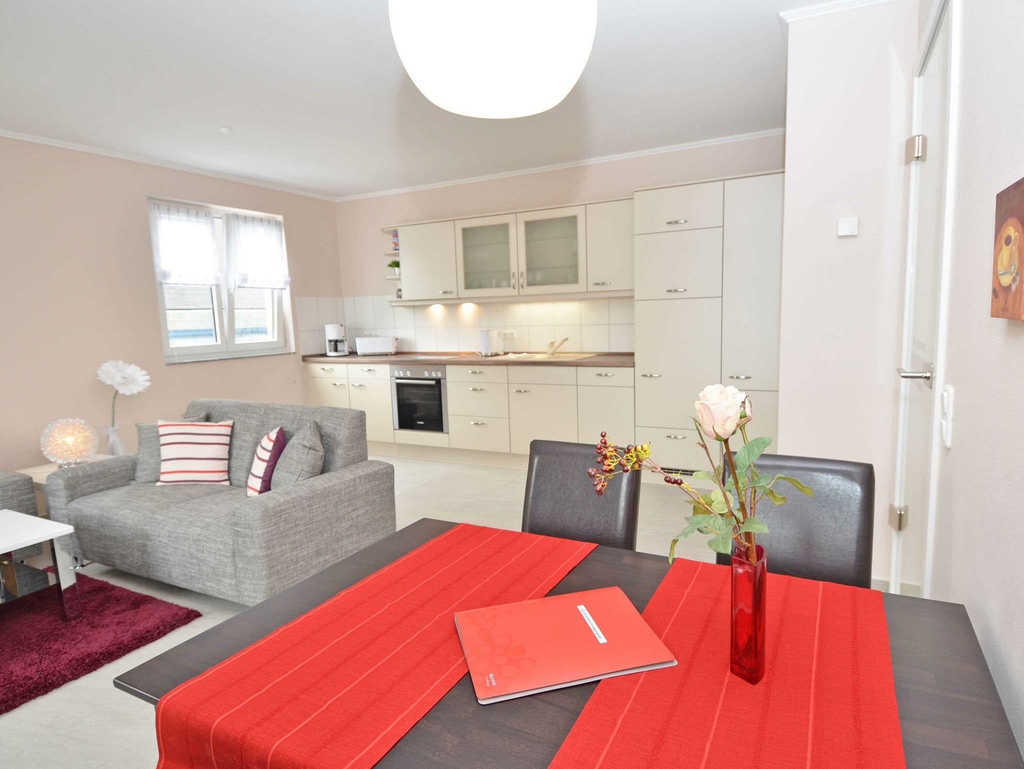 Vom Eingangsbereich aus betreten Sie den modern und sehr gemütlich ausgestatteten Wohnbereich, der mit zwei Couches, einem Flachbildfernseher und einem I-Pod-/Radio-Gerät zum Verweilen nach einem anregenden Tag einlädt. Die harmonisch im Wohnbereich[nbsp] integrierte Küchenzeile mit einem Herd mit Backofen, Spülmaschine, Mikrowelle, Kaffeemaschine, Toaster und diversem Kleininventar sowie ein Esstisch mit 4 Stühlen ermöglichen es Ihnen, Ihren Tag gemütlich bei Kaffee/Tee und Brötchen zu beginnen. Der nächste Bäcker ist ca. 5 Gehminuten entfernt!
