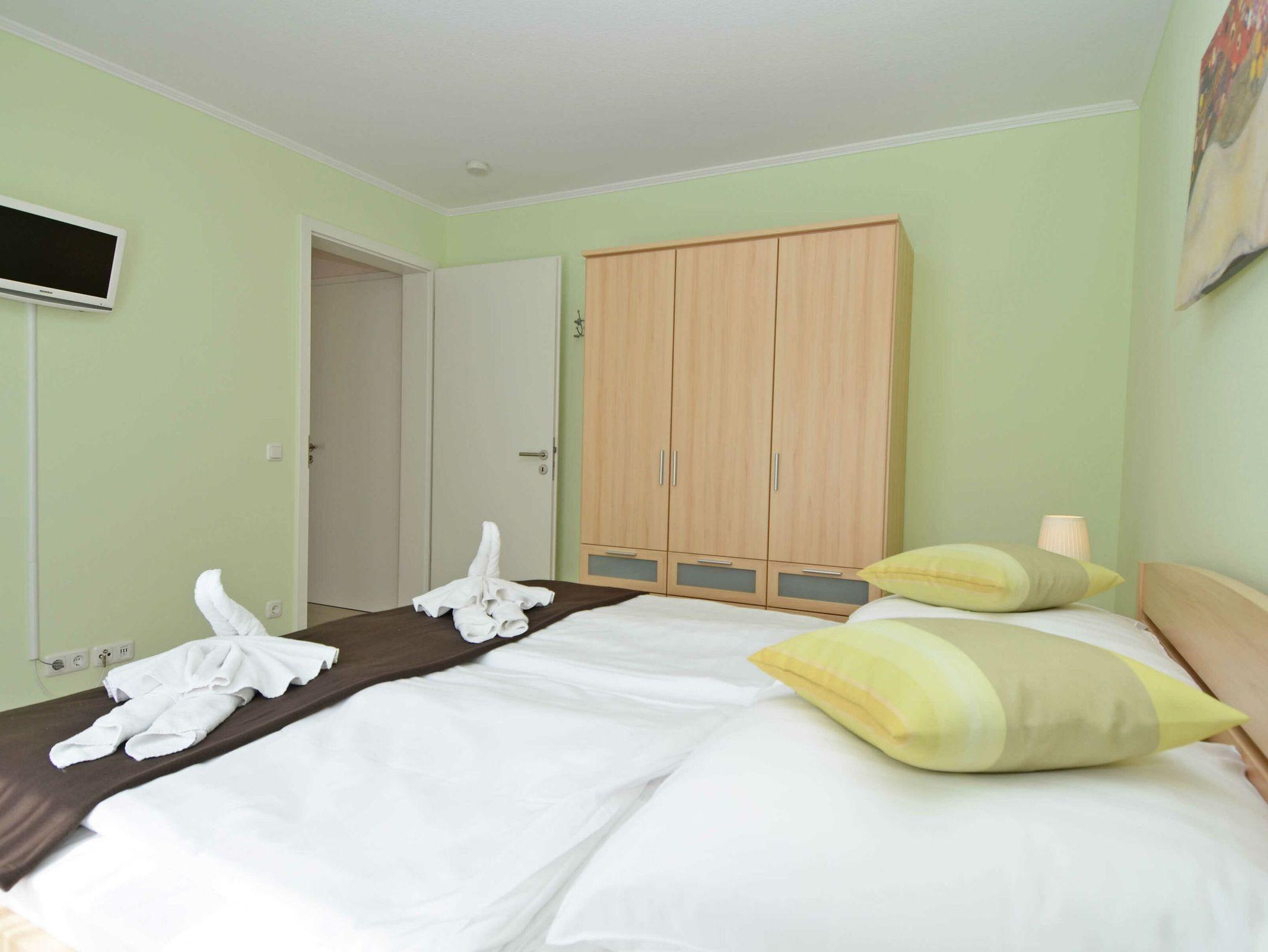 Das große Schlafzimmer ist mit einem Doppelbett, Schrank sowie Flachbildfernseher mit integriertem DVD-Player ausgestattet. Das kleinere Schlafzimmer verfügt über 2 getrennt stehende Betten (Polsterliegen mit Komfortfederkernpolsterung, je 80x200). Die Betten sind allergikerfreundlich.