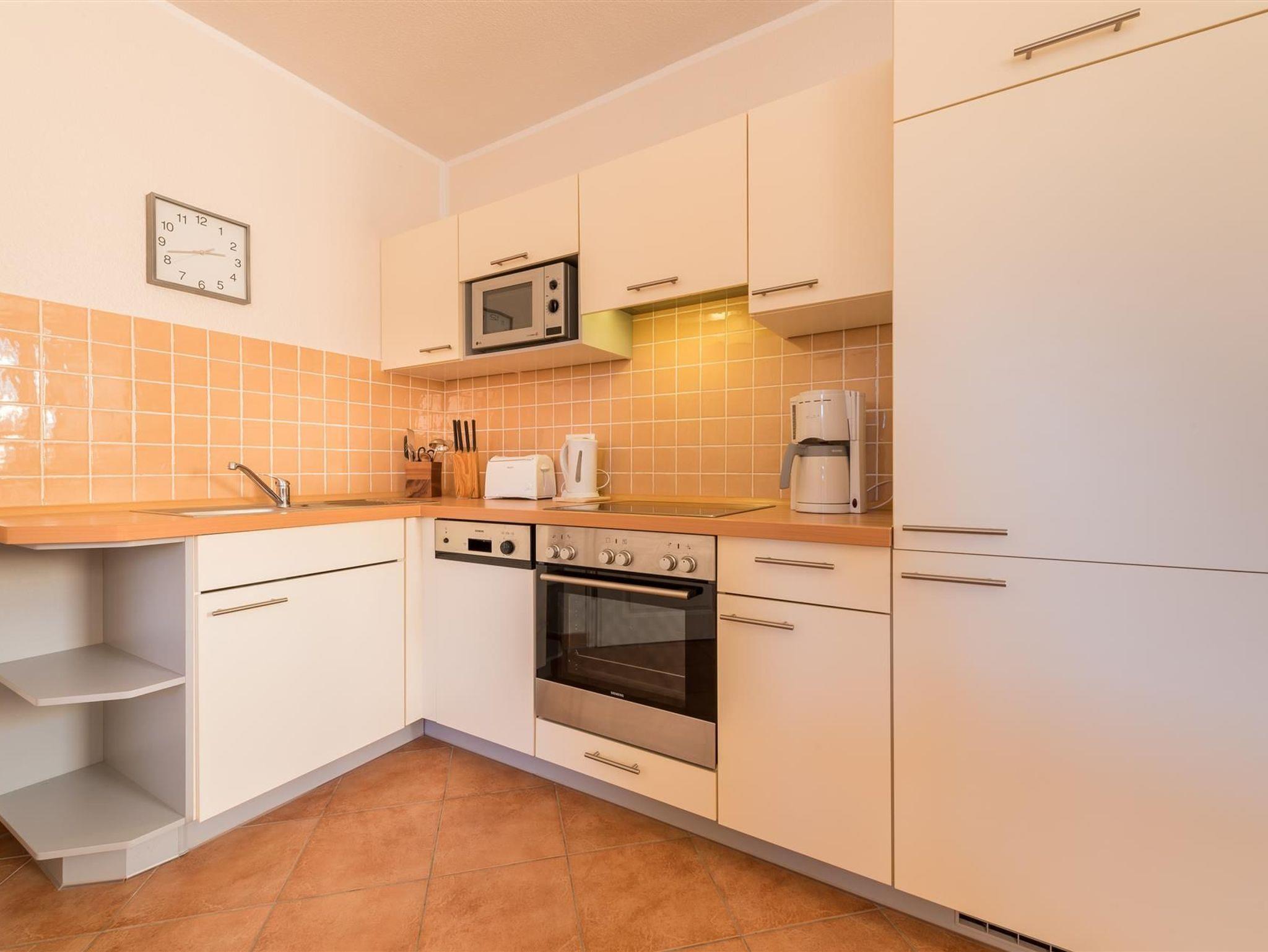 Wohn-/Esszimmer mit hochwertiger Einbauküche (4 Ceranfelder, Kühlschrank mit Eisfach, Herd, Geschirrspüler, Mikrowelle, Wasserkocher, Kaffeemaschine und Toaster) und Essplatz für 4 Personen