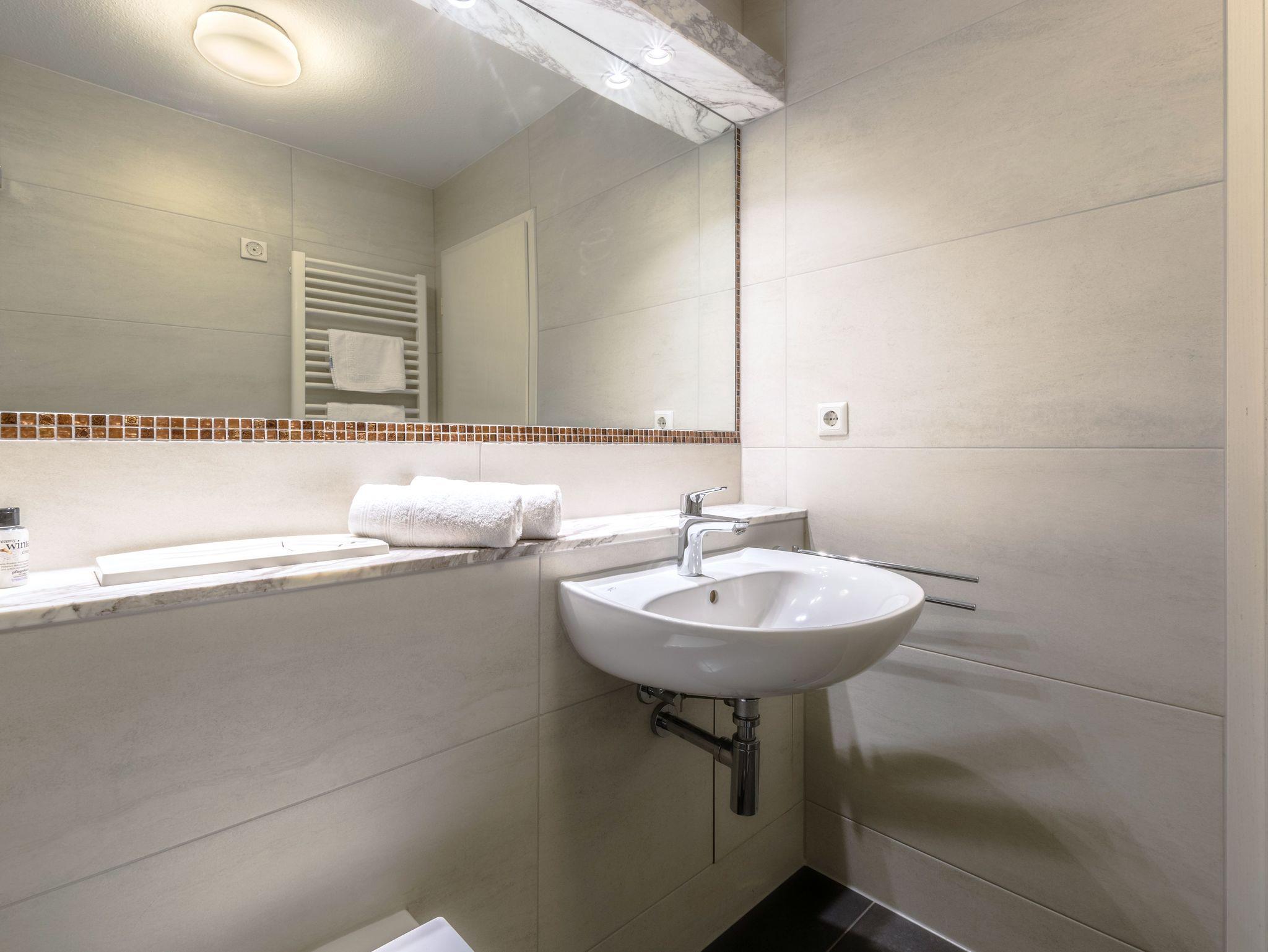 Das helle Badezimmer verfügt über eine Dusche und ein Fön ist ebenfalls vorhanden.