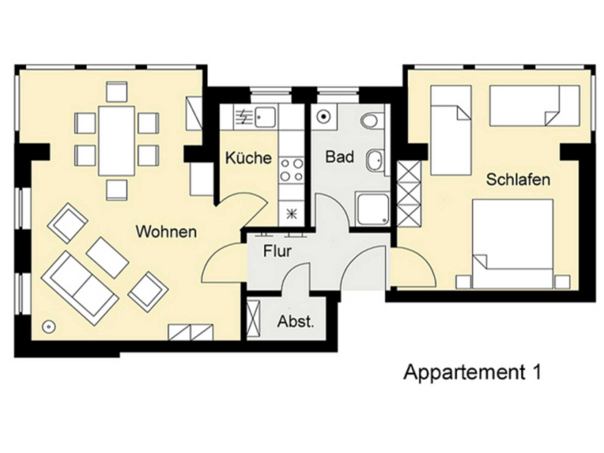 2-Raum Komfort-Appartement in der Villa Jagdschloss (EG). Das Appartement ist mit einem separaten Schlafzimmer, Badezimmer, Wohnzimmer sowie Küche ausgestattet.