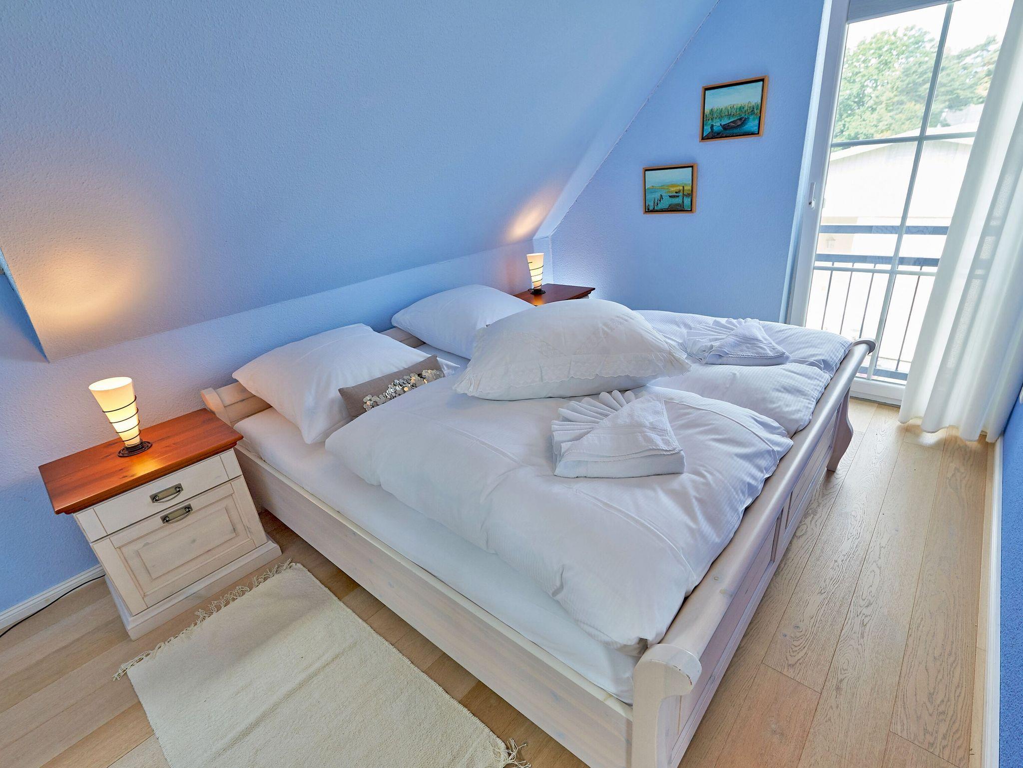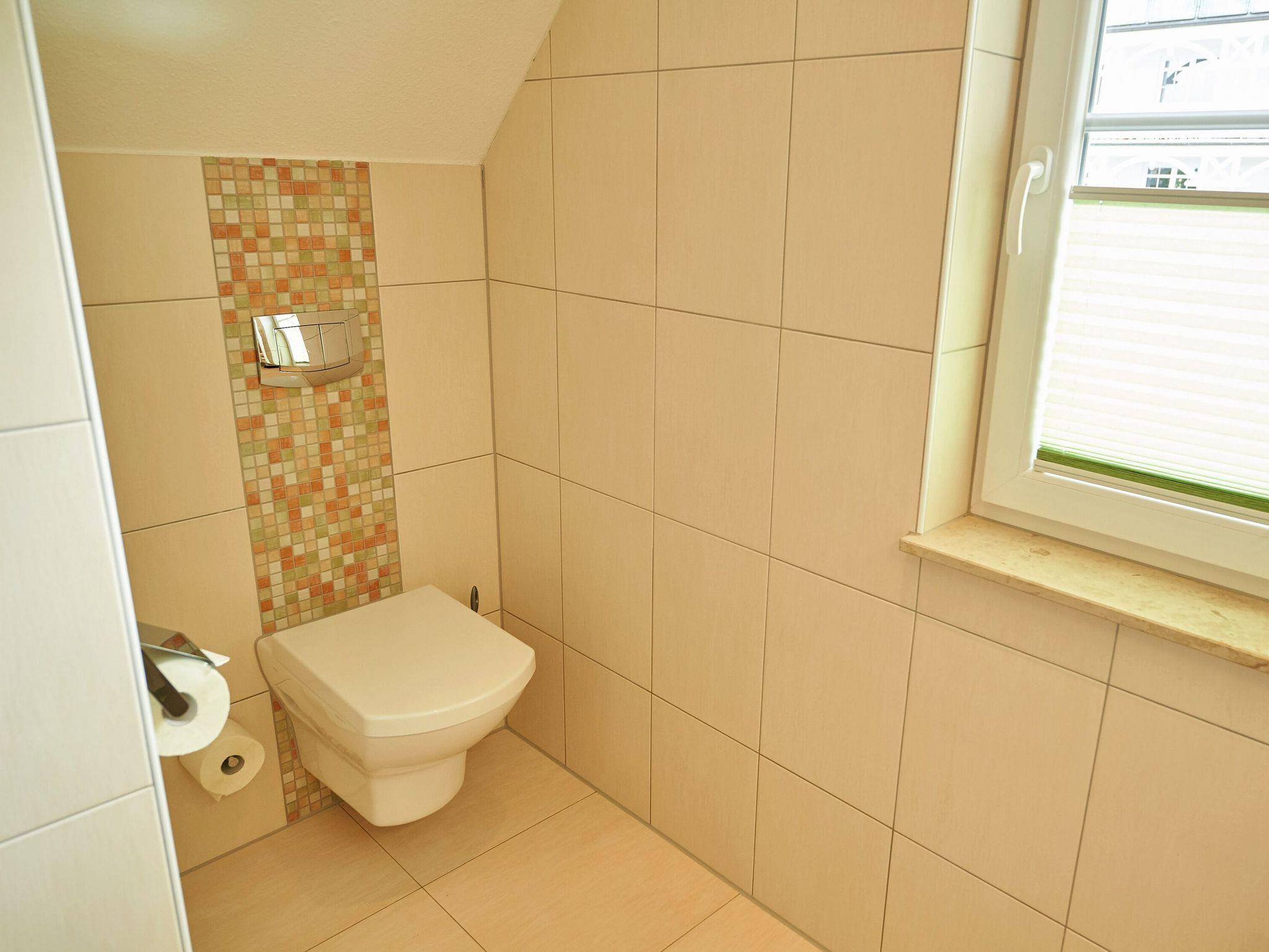 Eine Treppe höher geht es unter halbhoch ansetzenden Dachschrägen ebenfalls sehr gemütlich und komfortabel zu. Die beiden größeren Schlafzimmer sind jeweils mit einem kuscheligen Doppelbett in 1,80 x 2,00 m Größe ausgestattet, das dritte Schlafzimmer bietet zwei Einzelbetten. Genügend Platz für ein Baby-Reisebettchen und Ihre Urlaubsgarderobe ist natürlich auch vorhanden. Der Komfort des zweiten Badezimmers auf dieser Etage ist besonders dann angenehm, wenn man hier im Ferienhaus Klünderberg seinen Urlaub mit der ganzen Familie verlebt.