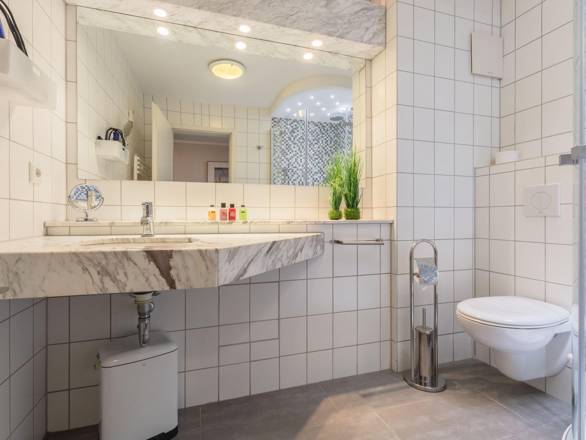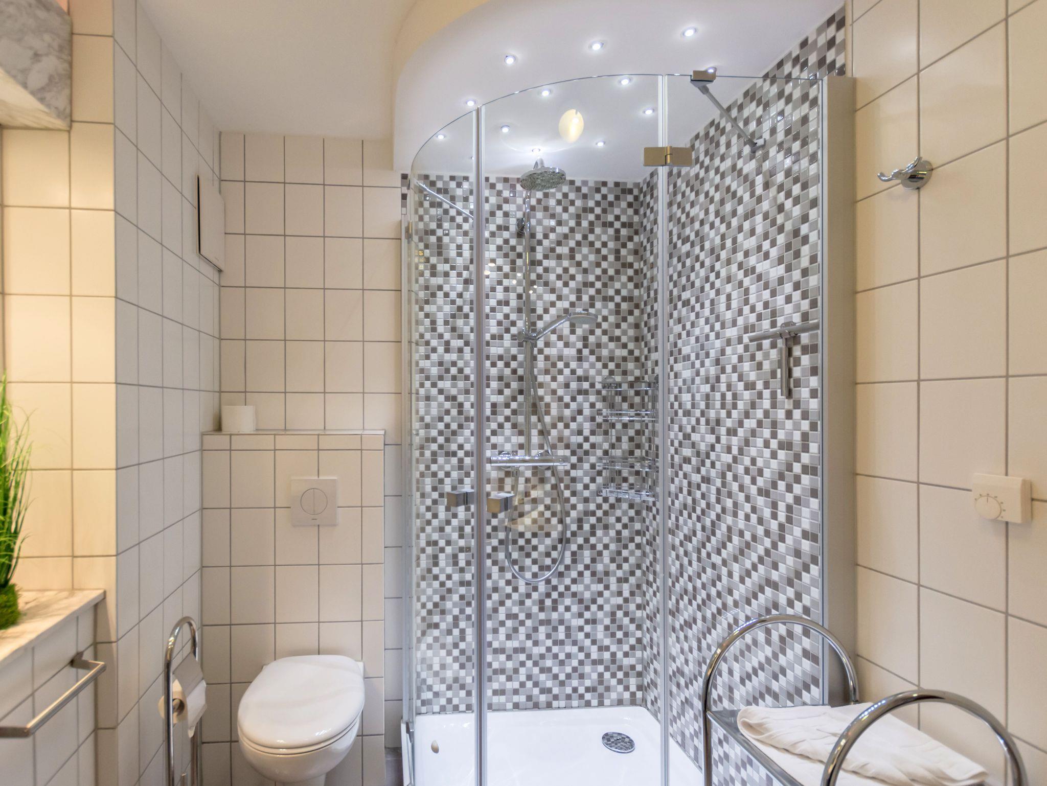 Das Badezimmer ist mit einer Dusche ausgestattet, und ein Föhn steht ebenfalls bereit. Zusätzlich gibt es ein separates Gäste-WC im Apartment.