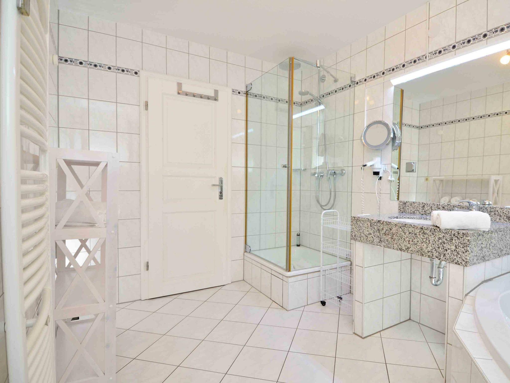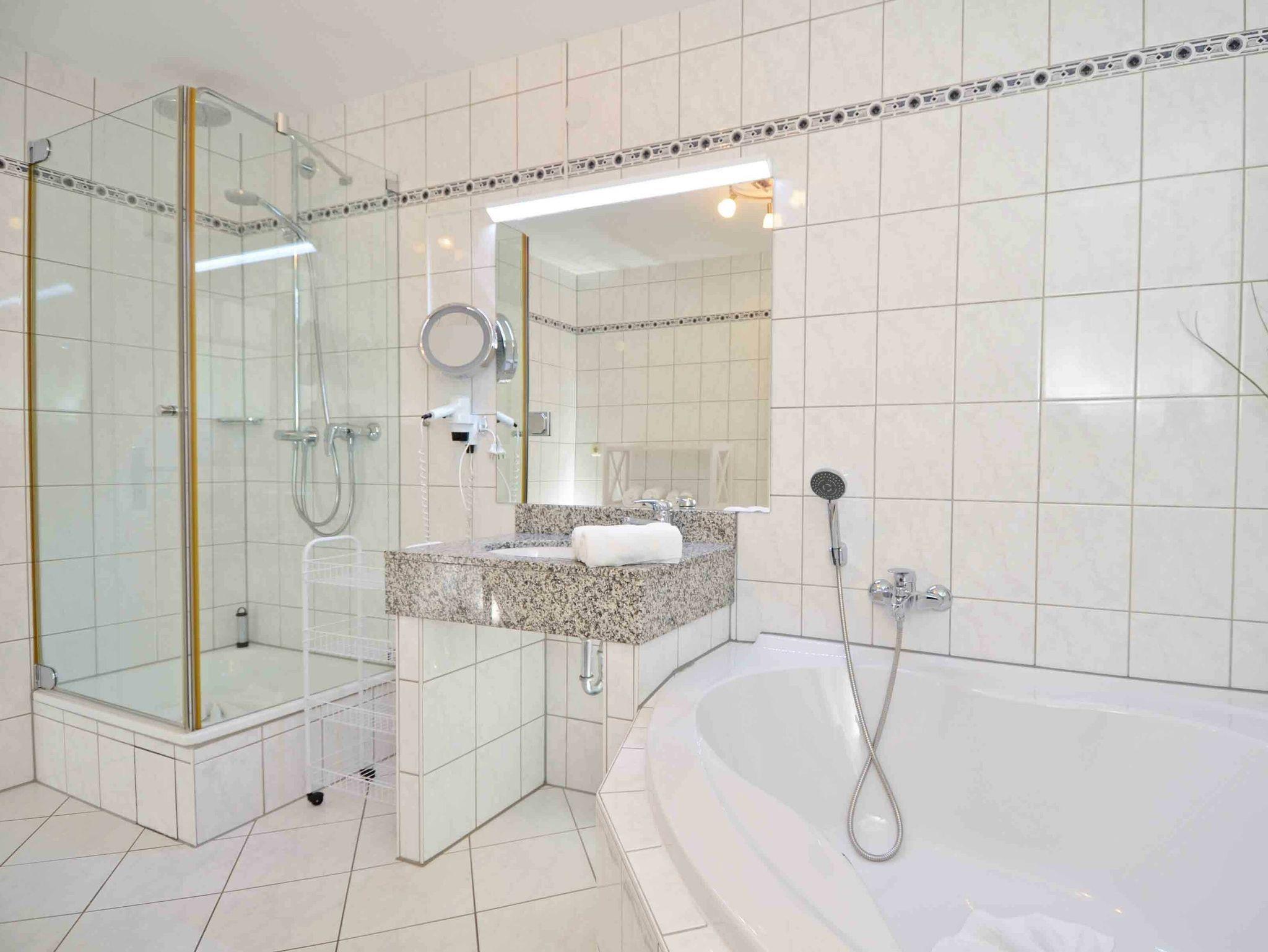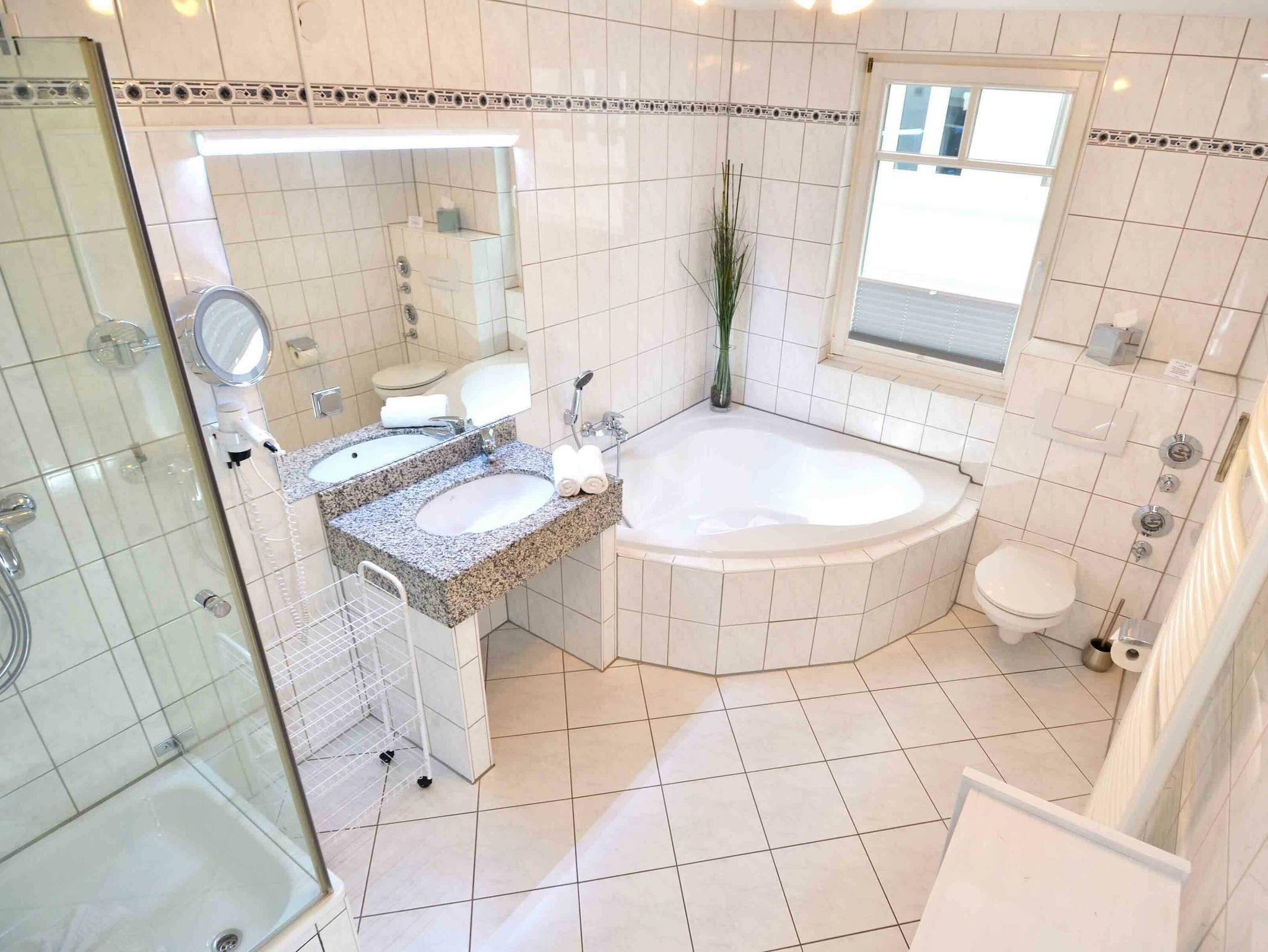 Das Appartement verfügt über ein großes Badezimmer mit Eckbadewanne, Dusche, WC, Fön sowie einen Granit-Waschtisch.