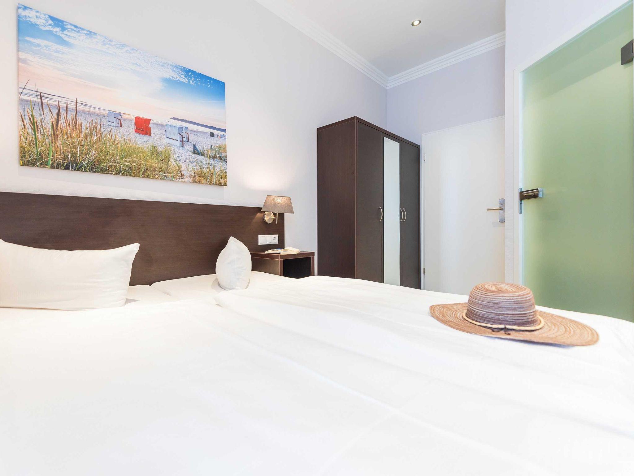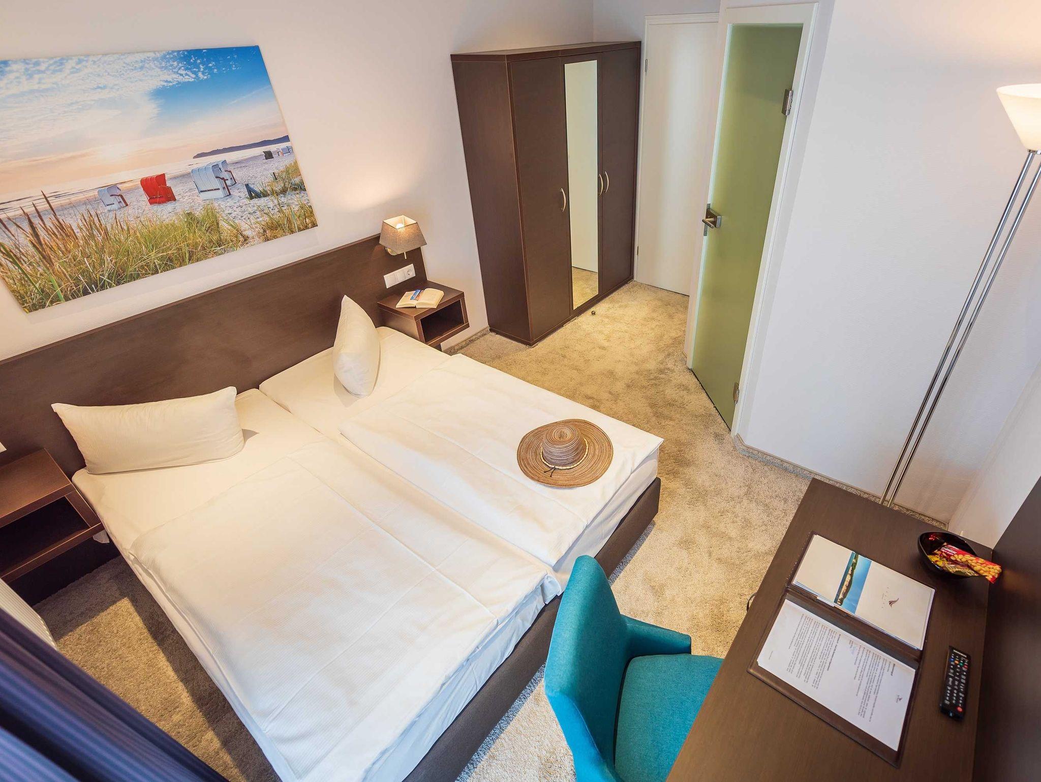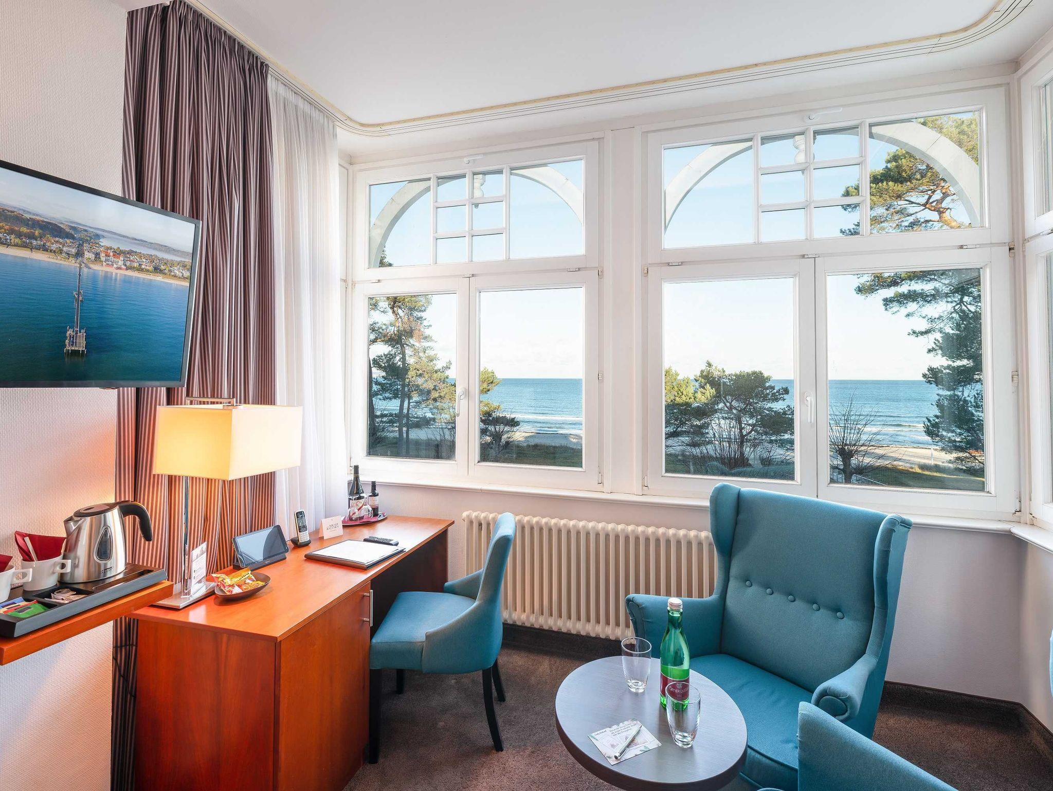 Alle unsere Zimmer sind liebevoll eingerichtet und bestechen mit einmaligem Komfort. Die modernen Bäder sind kleine Wohlfühl-Oasen mit viel Raum zur freien Entfaltung, alle Räumlichkeiten sind mit TV, Telefon, Zimmersafe und einer Minibar ausgestattet. Unsere mondänen Suiten verfügen außerdem über einen vollausgestatteten Küchenbereich sowie eine einladende Badewanne ? zum Träumen und Genießen. Besonders eindrucksvoll: Aus vielen unserer Doppelzimmer und Juniorsuiten haben Sie einen unvergesslichen Panoramablick auf die Ostsee.