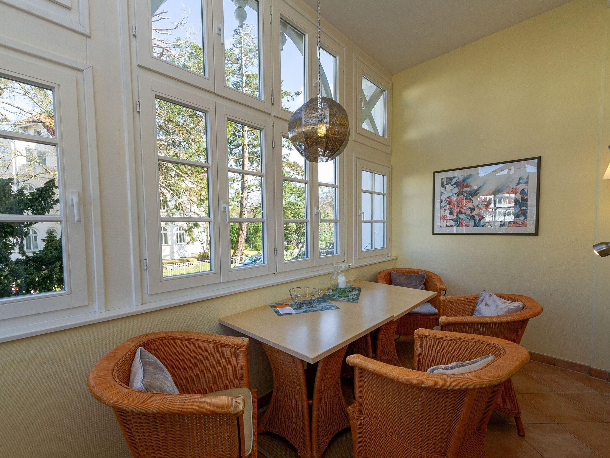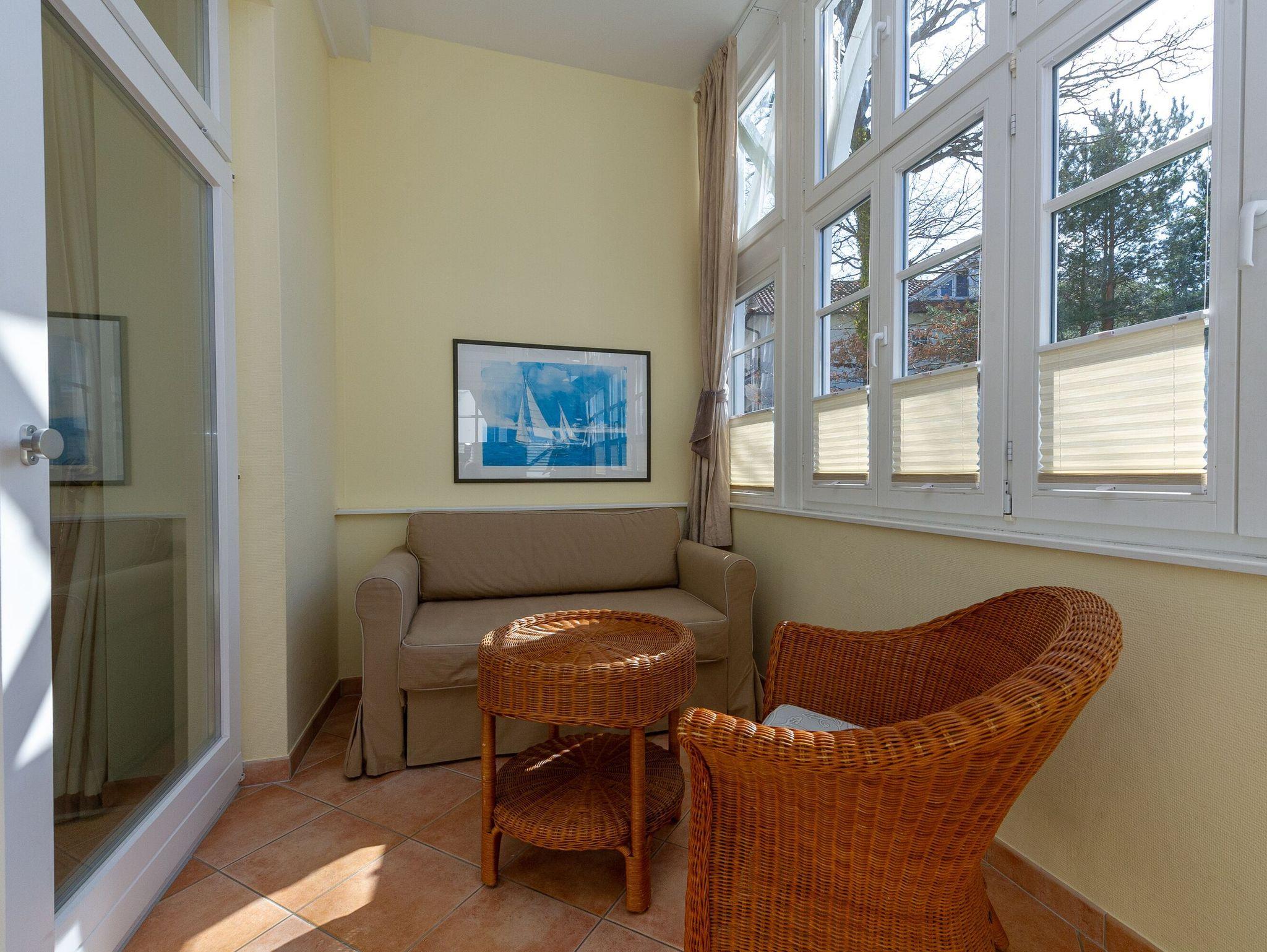 Die Wohnung 03 ist ein rund 56 m² großes 2-Raum Appartement im Erdgeschoss der Villa Malepartus und bezaubert neben ihrer wunderbar zentralen und strandnahen Lage mit gleich zwei verglasten Wintergärten und einer komfortablen Einrichtung.
