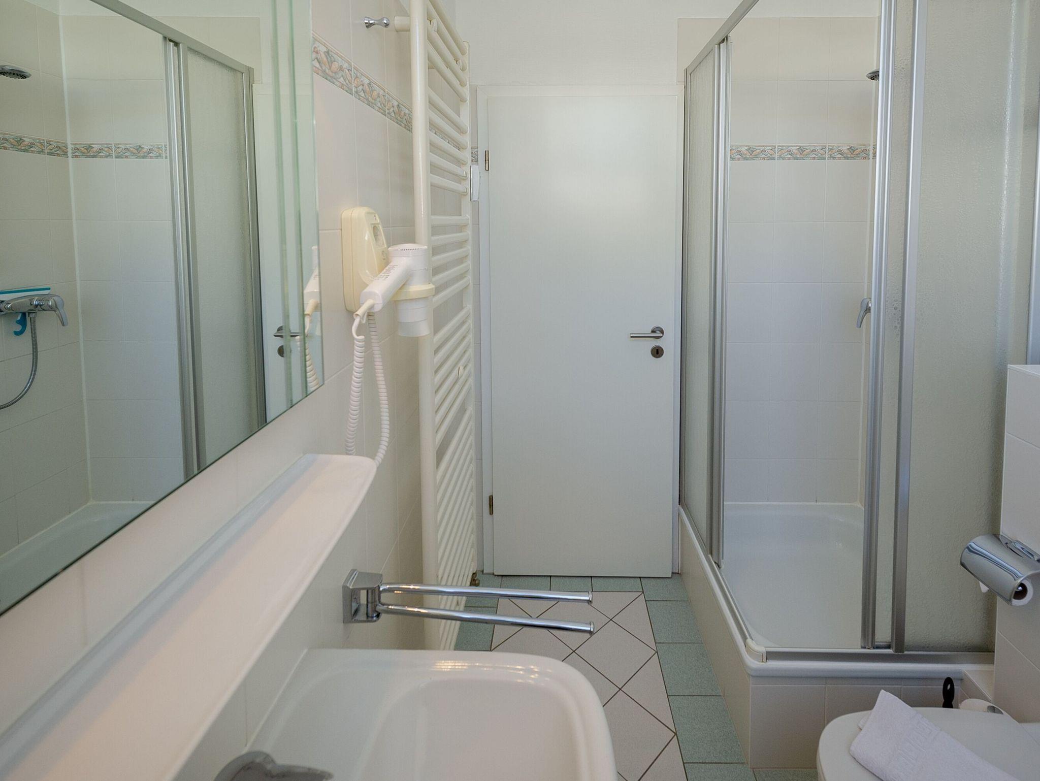Das Tageslichtbad ist mit Dusche/WC, einem Waschtisch mit Fön und Spiegel sowie einem Handtuchwärmer ausgestattet.