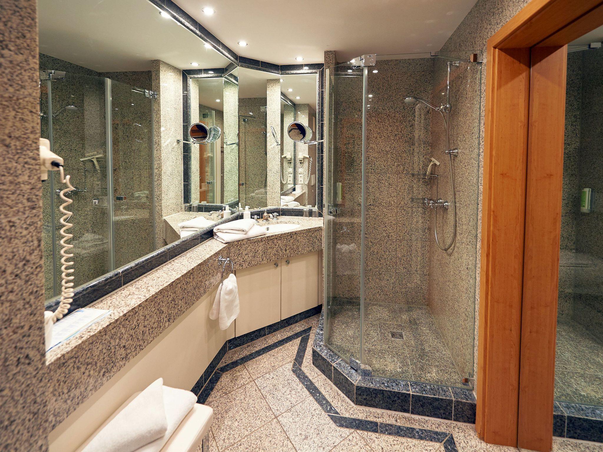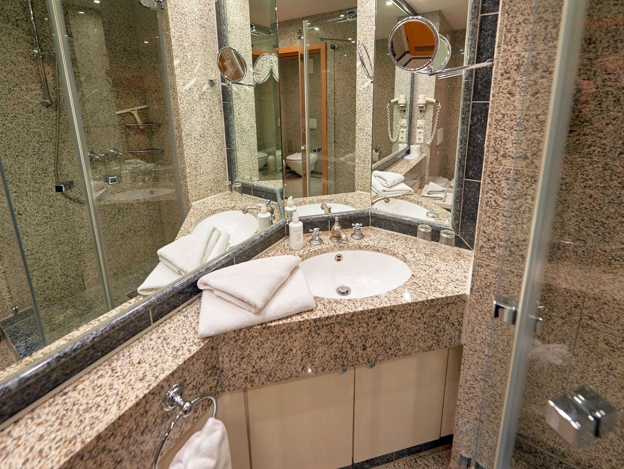 Das mit Granitfliesen, großen Spiegelflächen und viel Licht aufwändig inszenierte Badezimmer verfügt über Dusche/WC, einen beleuchteten Waschtisch inkl. Kosmetikspiegel und Fön sowie einen beheizbaren Handtuchtrockner.