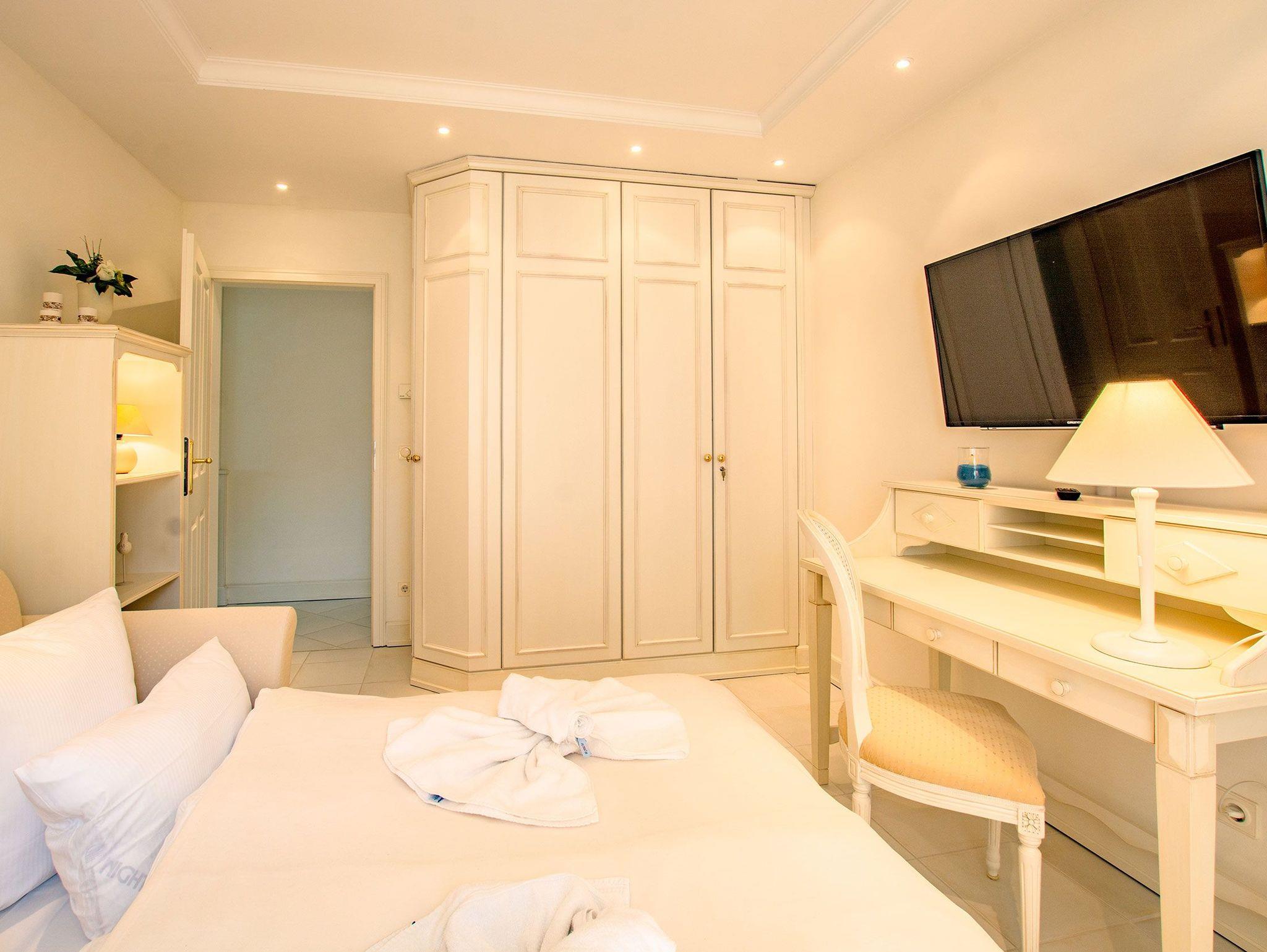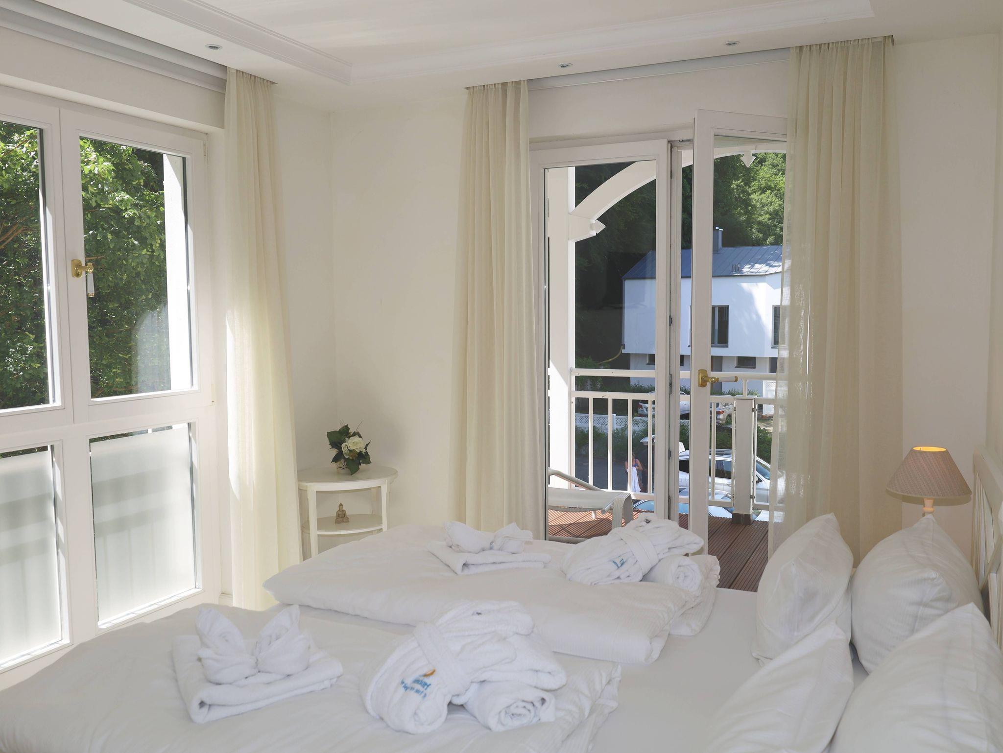 Die beiden Schlafzimmer liegen ruhig zur Waldseite. Das Hauptschlafzimmer bietet ein komfortables Doppelbett, Flachbild-TV, ein BOSE Wave-Music-System und Zugang zu einem weiteren Balkon mit Blick auf den Buchenwald der Granitz sowie seitlichem Ostseeblick. Das zweite Schlafzimmer ist mit einer Schlafcouch und einem Fernseher ausgestattet.