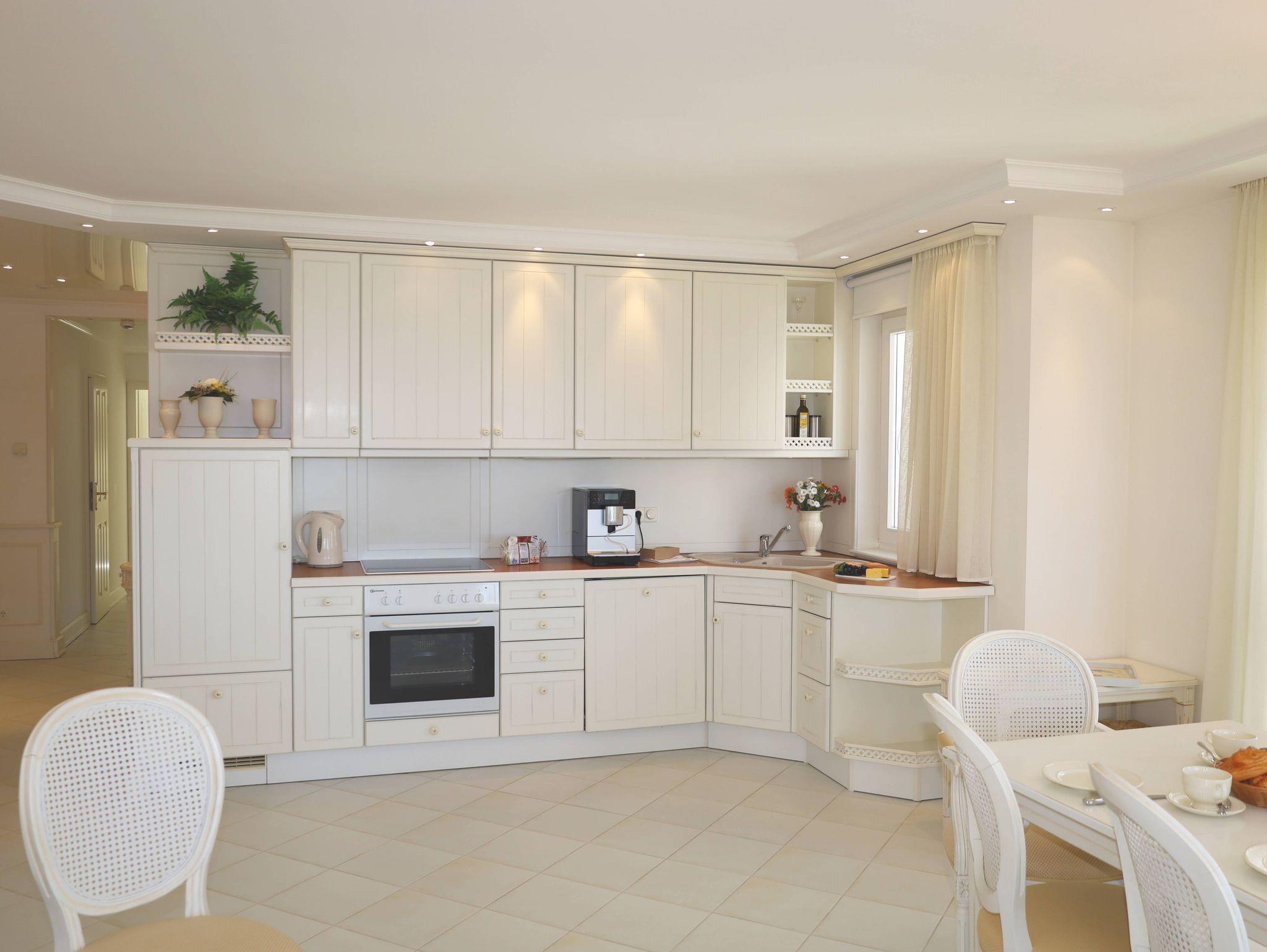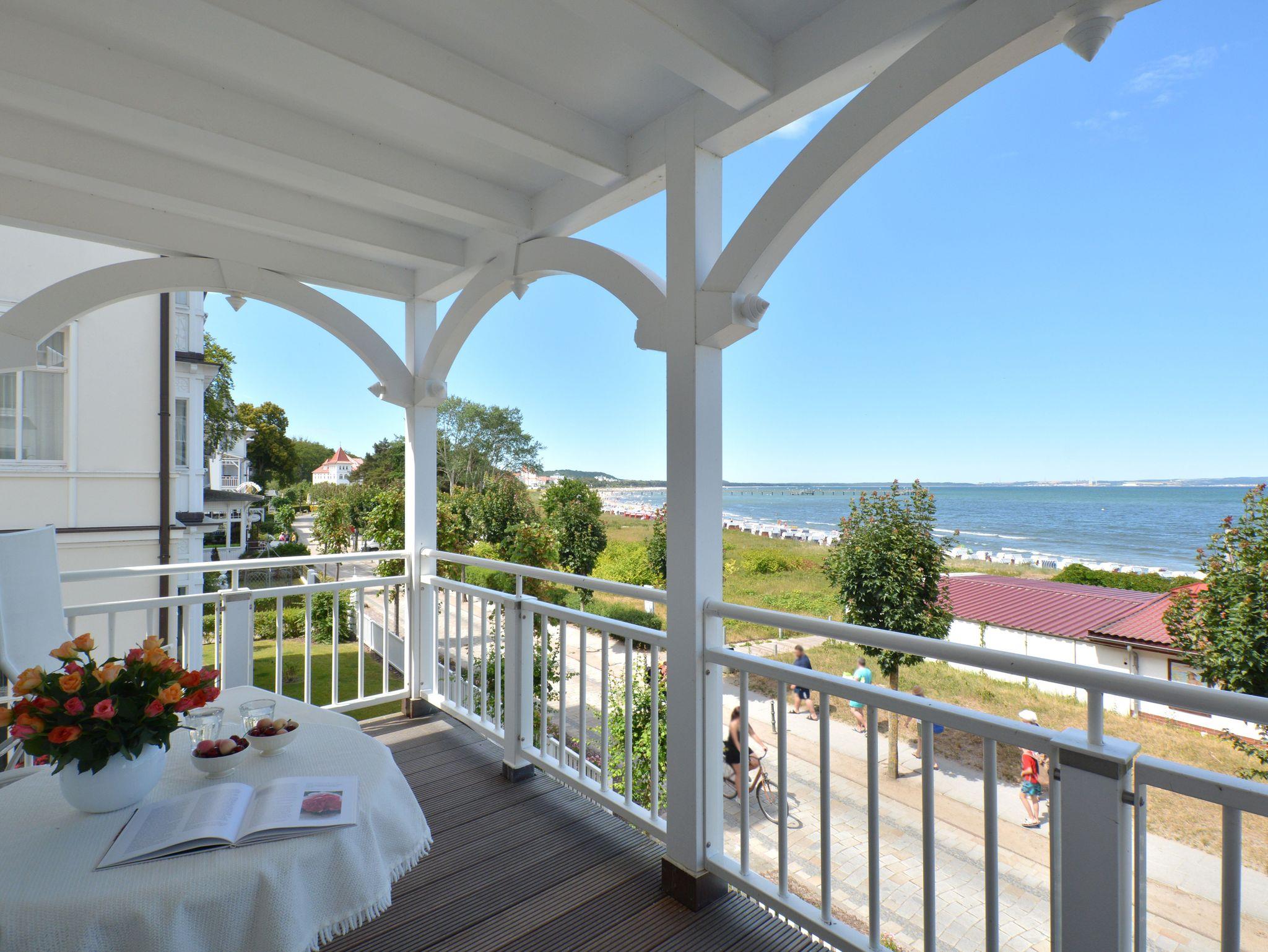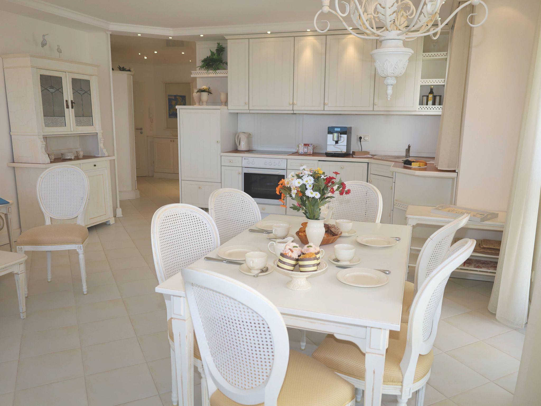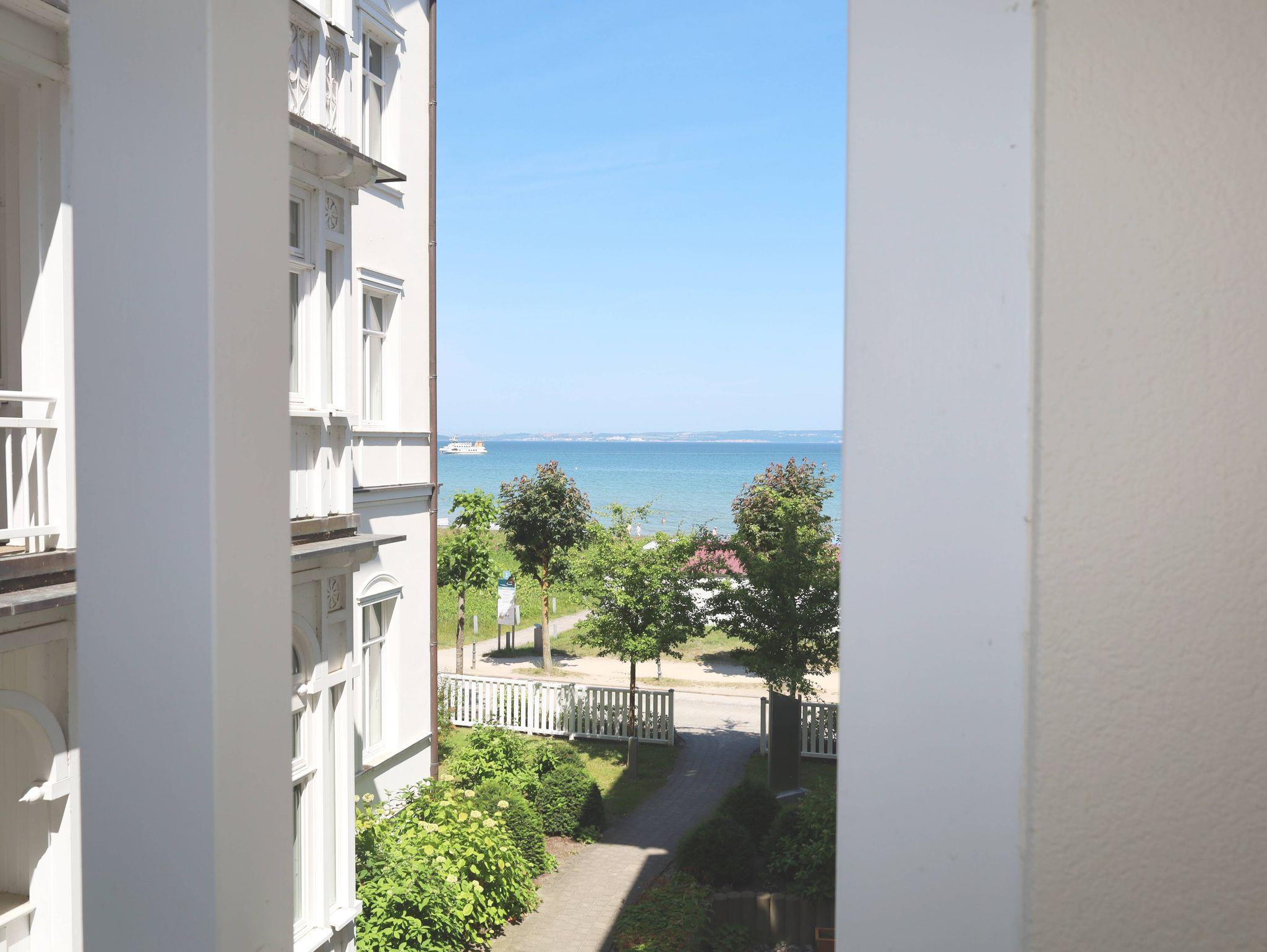 Der helle, großzügige Wohnbereich mit offener Küche öffnet sich zu einem großen Balkon mit traumhaftem Blick auf die Ostsee ? von der Seebrücke bis zu den Kreidefelsen. Bodentiefe Fenster sorgen für lichtdurchflutete Räume, die individuell designte schwedische Landhausküche und die hochwertige Couch schaffen eine besondere Wohlfühlatmosphäre. Zur Ausstattung gehören ein Flachbild-TV, ein Samsung Blu-ray-Player, ein CD-Player sowie ein BOSE-Soundsystem. Die Küche ist komplett ausgestattet mit Geschirrspüler, Ceran-Back-Herd und praktischen Extras wie Kaffeemaschine, Toaster und Wasserkocher.
