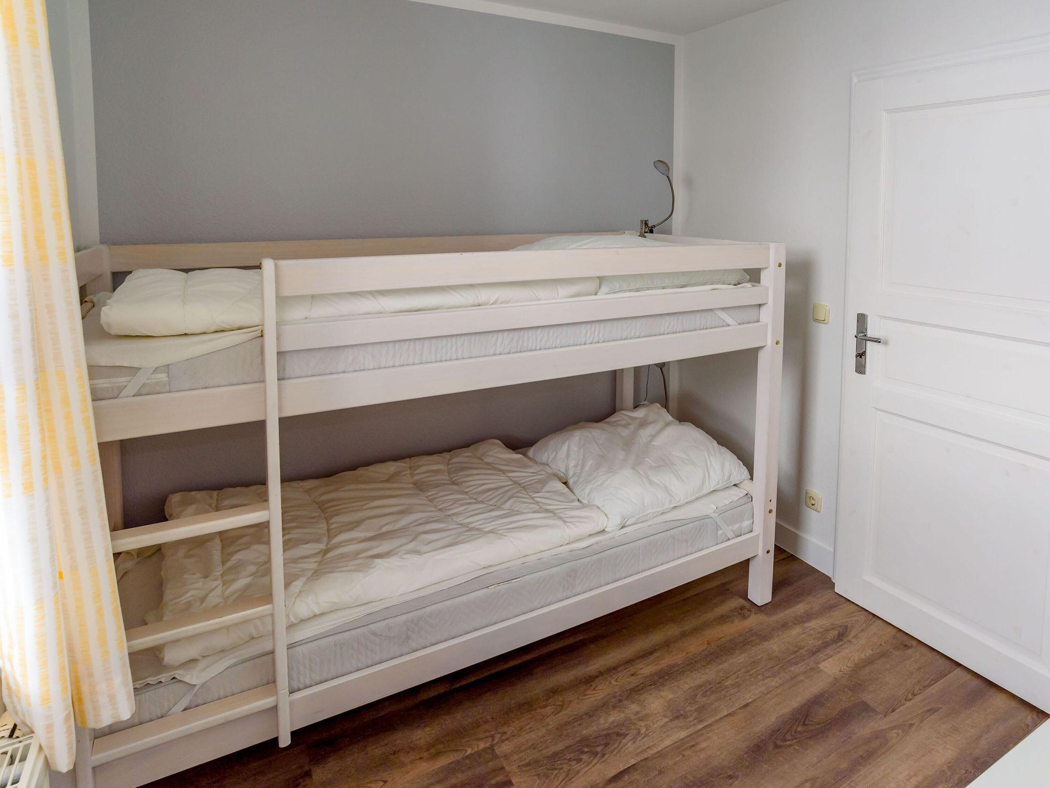 Die Wohnung verfügt über zwei Schlafzimmer. Das größere Schlafzimmer ist mit einem Doppelbett (1,80 x 2,00 m) mit hochwertigen Matratzen sowie Kleiderschrank eingerichtet. Das kleine (Kinder-)Schlafzimmer verfügt über ein Etagenbett, einen kleinen Schrank sowie einen Schreibtisch.