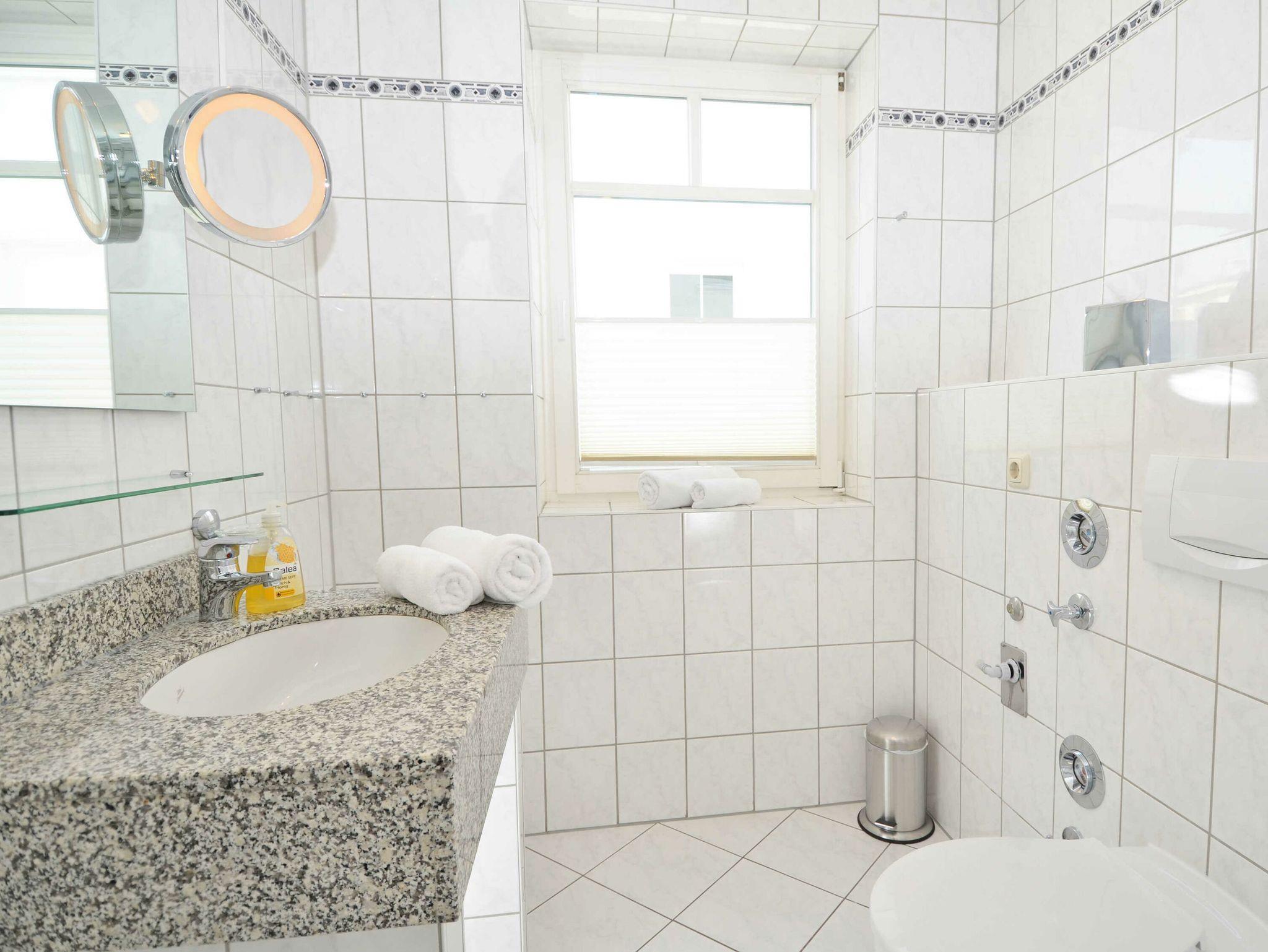 Das Appartement verfügt über ein modernes Duschbad mit WC, einen Fön sowie einen Granit-Waschtisch.