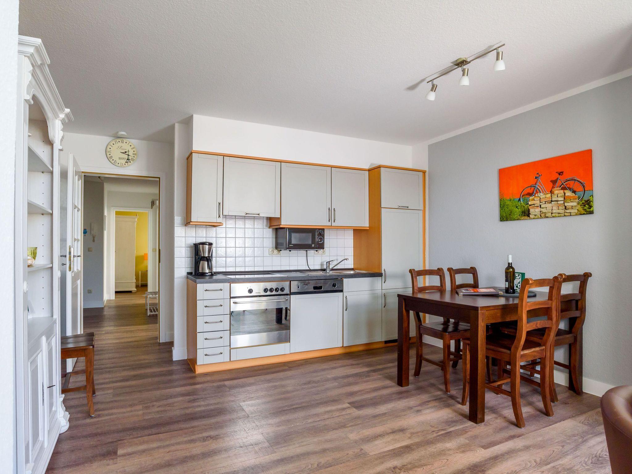 Die im Wohnraum integrierte große Küchenzeile ist mit Backofen, Ceran-Kochfeld, Geschirrspüler. Mikrowelle, Toaster, Wasserkocher, Kaffeemaschine sowie diversem Kleininventar bestens ausgestattet. Der Esstisch bietet ausreichend Platz.
