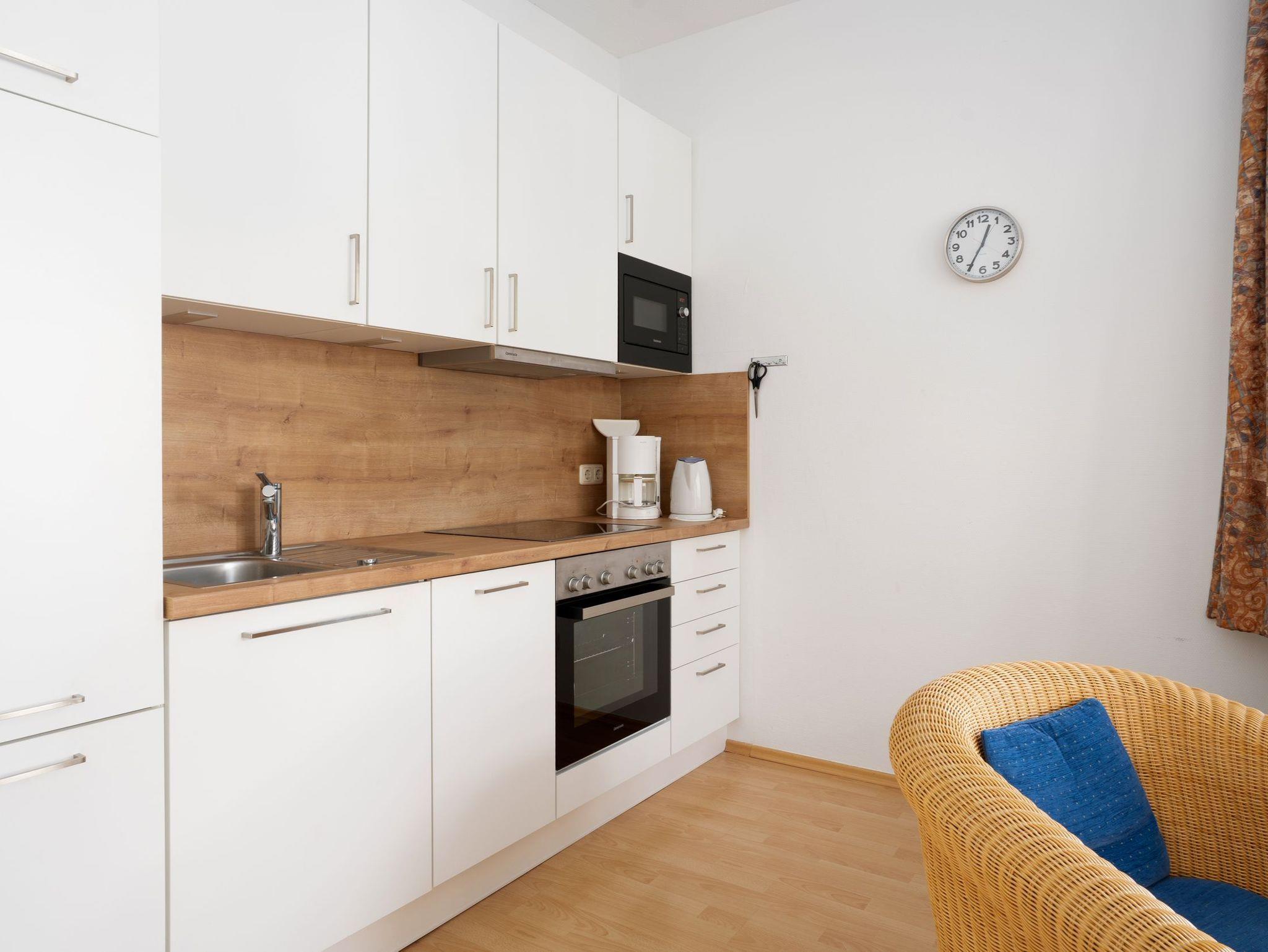 Unser 2- Raum Apartment 5 bietet auf 50 qm Platz für bis zu 4 Personen. Im Wohn/Essbereich ist eine umfangreich ausgestattete Küchenzeile integriert.
