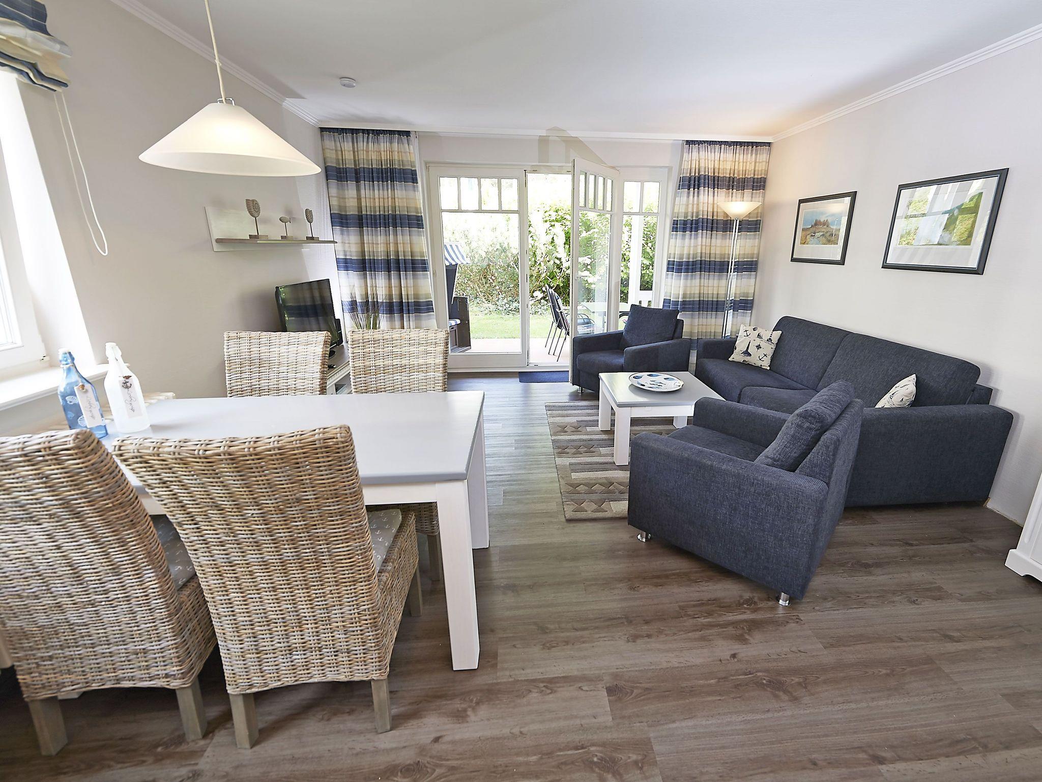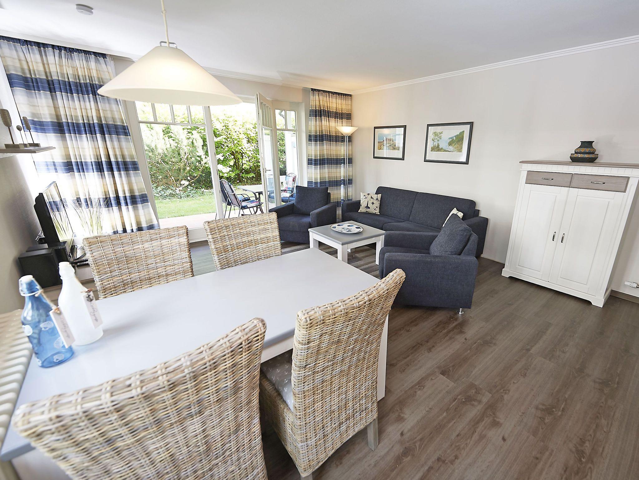 Vom komfortabel und gemütlich gestalteten Wohnbereich gelangen Sie auf die schöne Terrasse mit eigenem Strandkorb. Die Wohnung ist nicht zuletzt deshalb optimal für Hundebesitzer, weil vor und neben der Terrasse Rasen zum Aufhalten und Spielen gegeben ist. Der Hundestrand ist in ca. 300 m Fußweg durch den Dünenwald erreichbar.