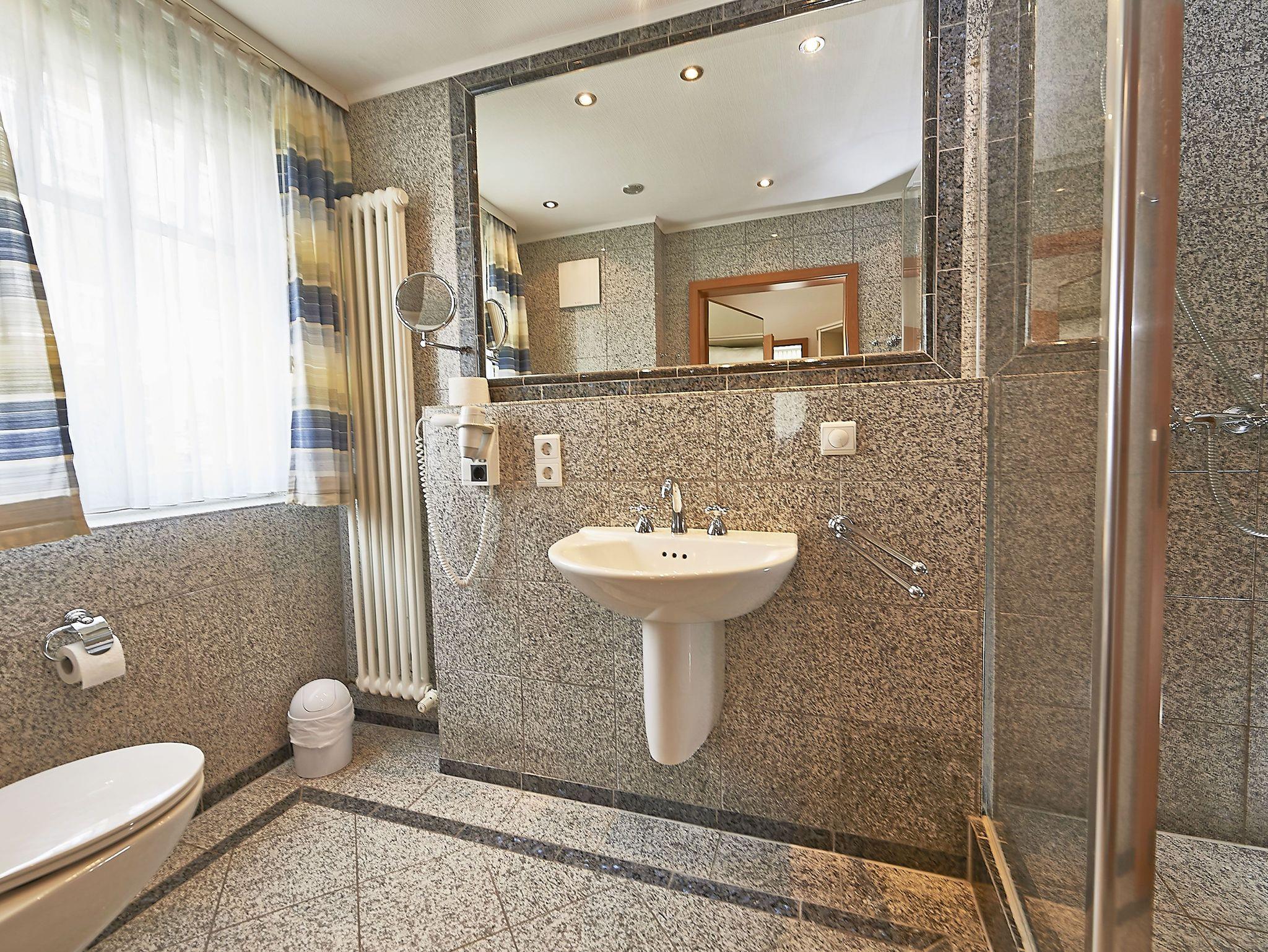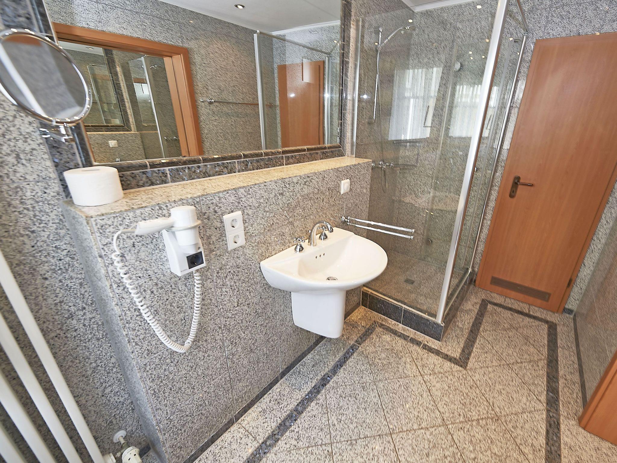Die Wohnung verfügt darüber hinaus über ein modern gefliestes Duschbad mit Granitfliesen, viel Tageslicht sowie einem Kosmetikspiegel und Haartrockner.
