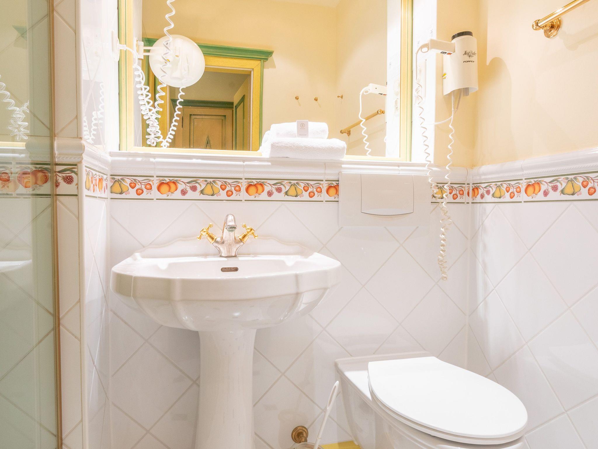 Alle Zimmer und Suiten mit Dusche bzw. Badewanne/WC, Fön, Bademäntel, Farb-TV, Durchwahltelefon, Minibar und Safe.
