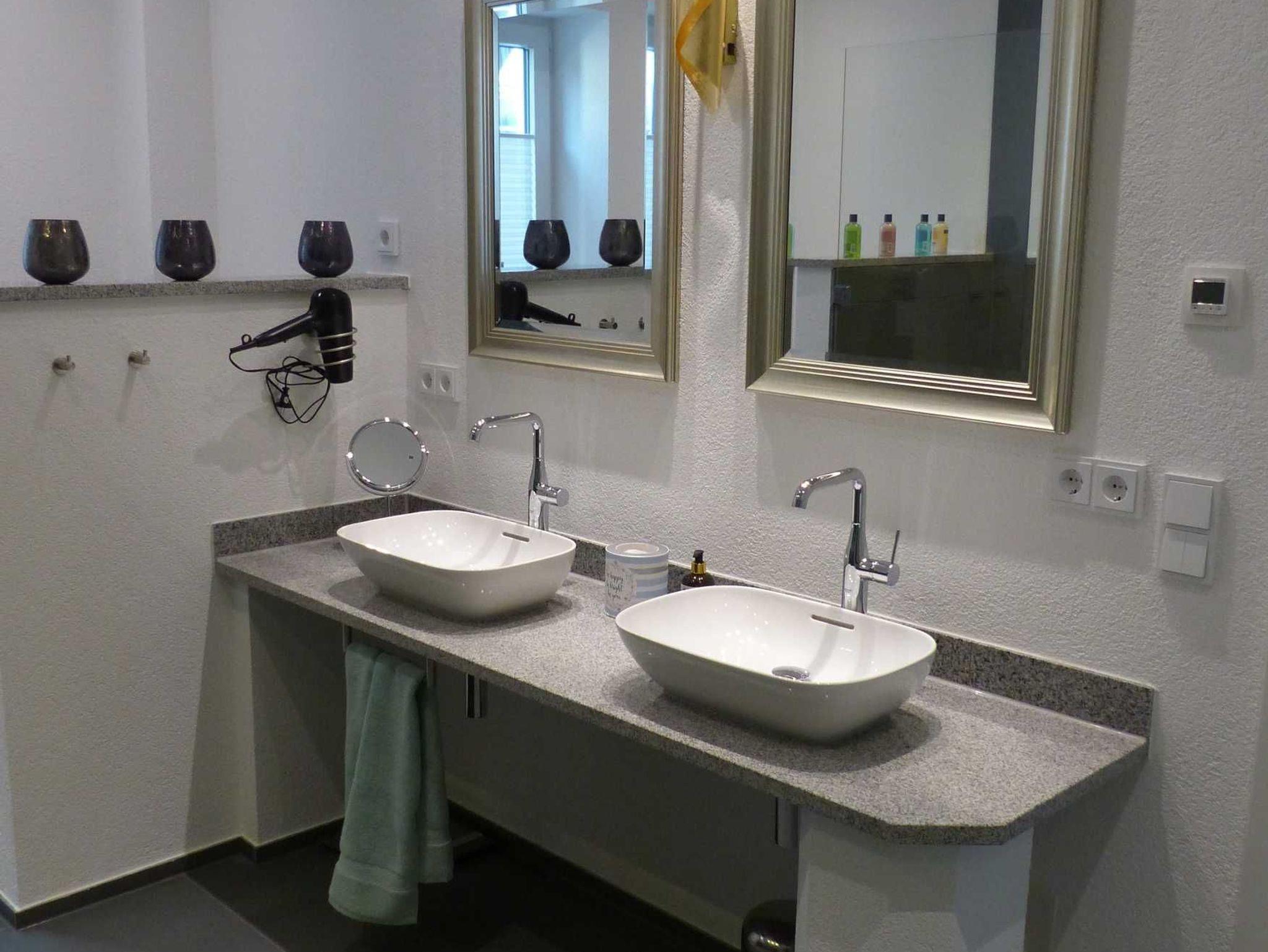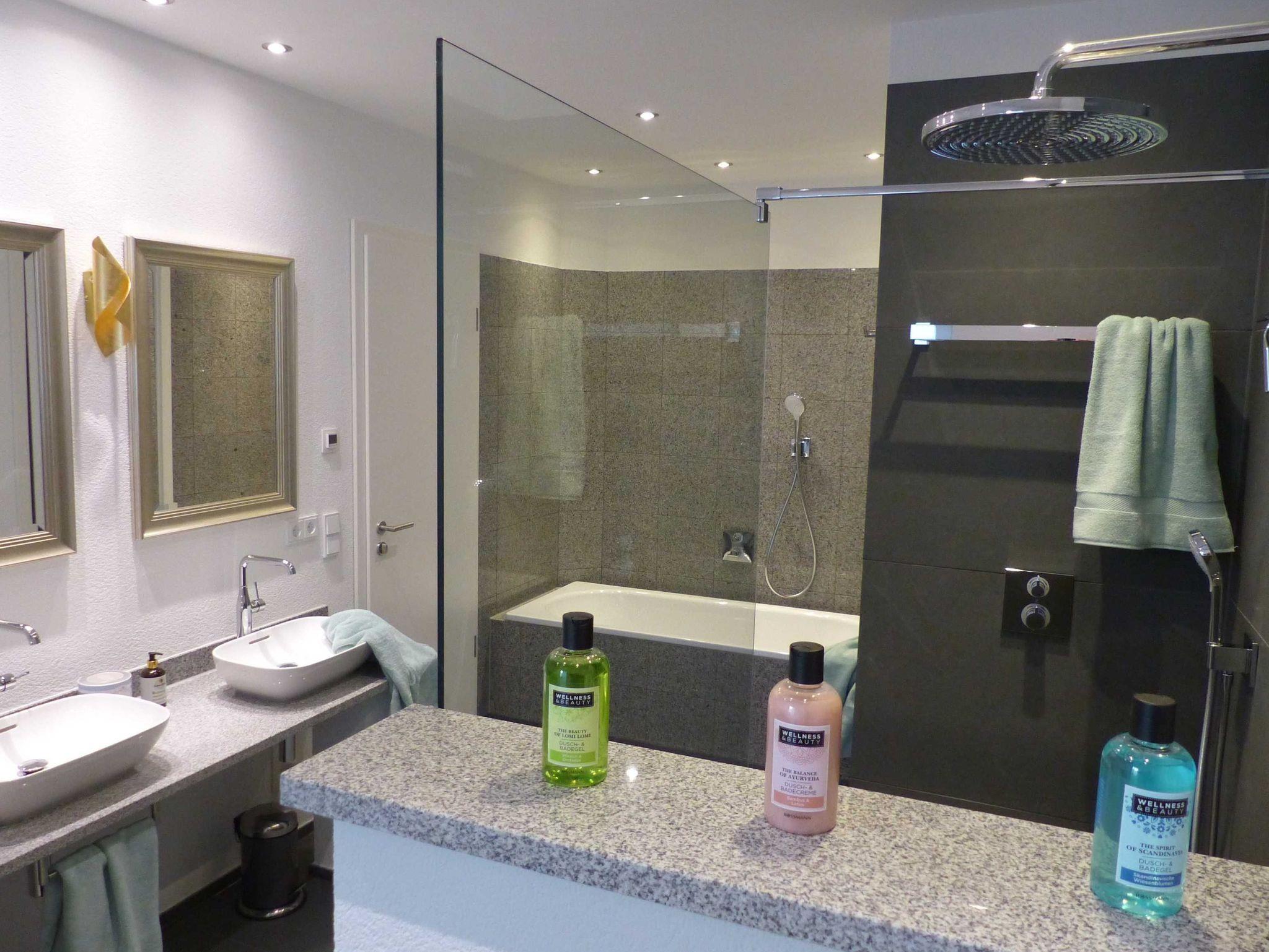Der Tag startet und endet bekanntlich im Badezimmer, so dass hier besonderer Wert auf Eleganz und Exklusivität gelegt wurde. Diese Wohlfühloase wird Sie mit einer bodengleichen Walk-in-Dusche, einer Badewanne und einem Waschtisch aus Granit mit zwei Aufsatzwaschbecken, sowie hochwertigen Armaturen begeistern. Die Beleuchtung ist für ein romantisches Bad dimmbar. Die Wandfliesen aus Granit und Bodenfliesen aus Schieferplatten mit verbauter Fußbodenheizung spiegeln den Anspruch nach dem Besonderen wieder.
