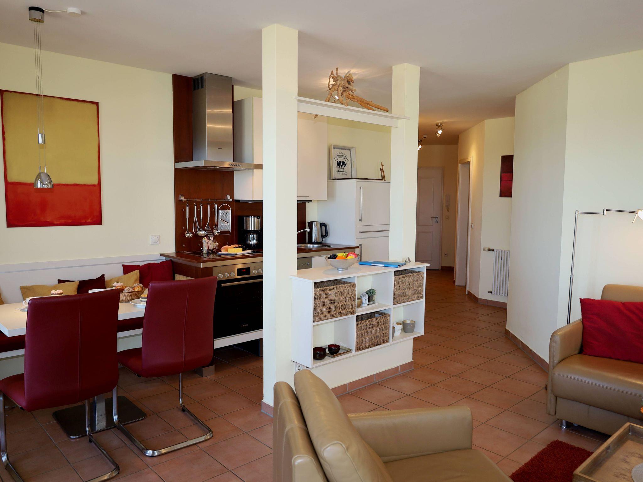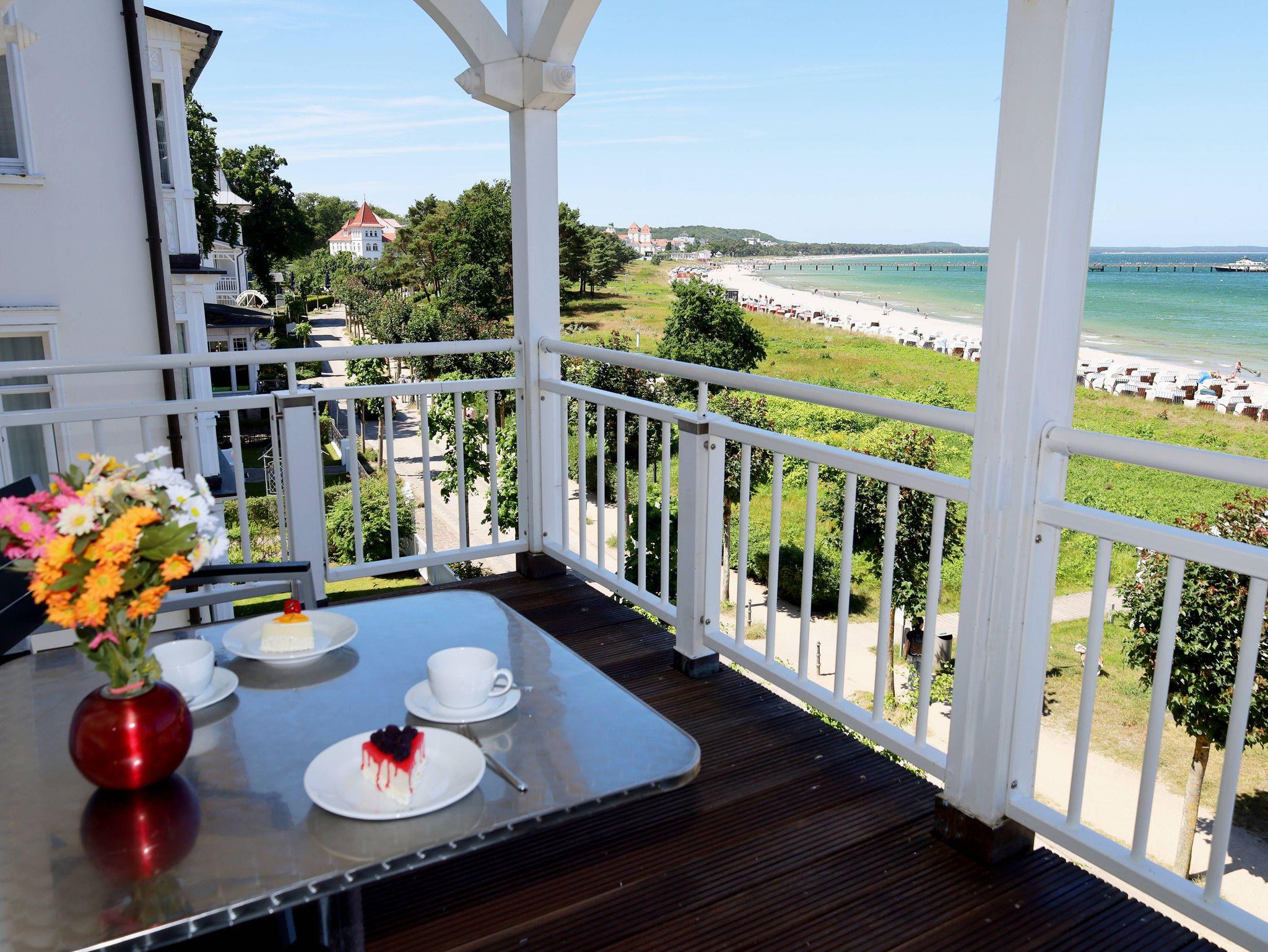 Das 2-Raum-Apartment befindet sich im 2. Obergeschoss und ist ca. 49 m² gross. Haustiere nur auf Anfrage. Die Wohnung verfügt über einen grossen möbilierten Balkon mit frontalem Ostseeblick. Das große und modern eingerichtete Wohnzimmer verfügt über einen Flachbild-TV, Stereoanlage mit CD-Player sowie ein hochwertiges Ledersofa mit Schlaffunktion. Vom Wohnzimmer aus, können Sie einen Panorama-Ostseeblick auf die Binzer Seebrücke und die Kreidefelsen bei Sassnitz genießen.