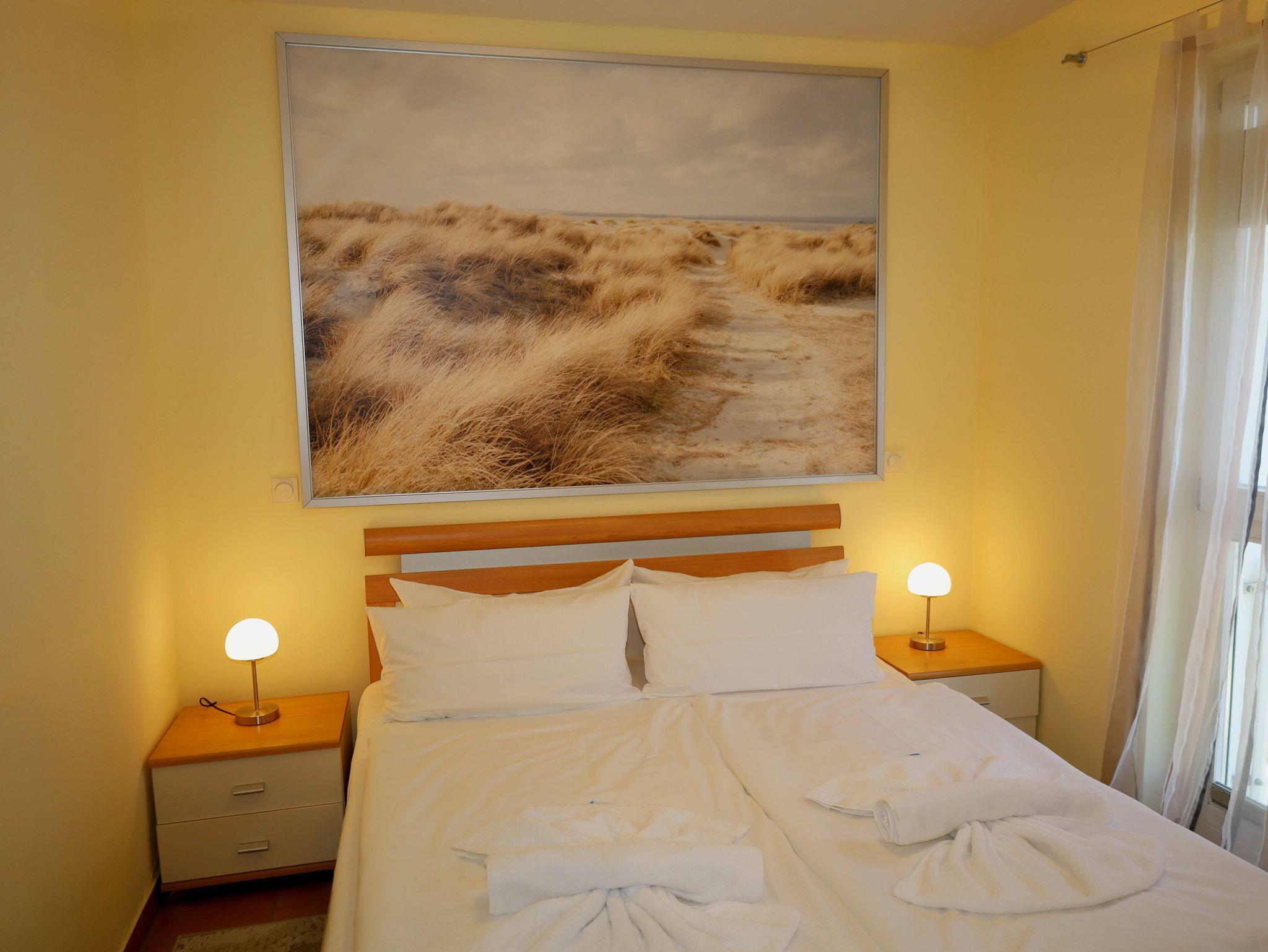 Das 2-Raum-Apartment befindet sich im 2. Obergeschoss und ist für bis zu 4 Personen geeignet. Das Apartment verfügt über einen Balkon mit frontalem Meerblick.