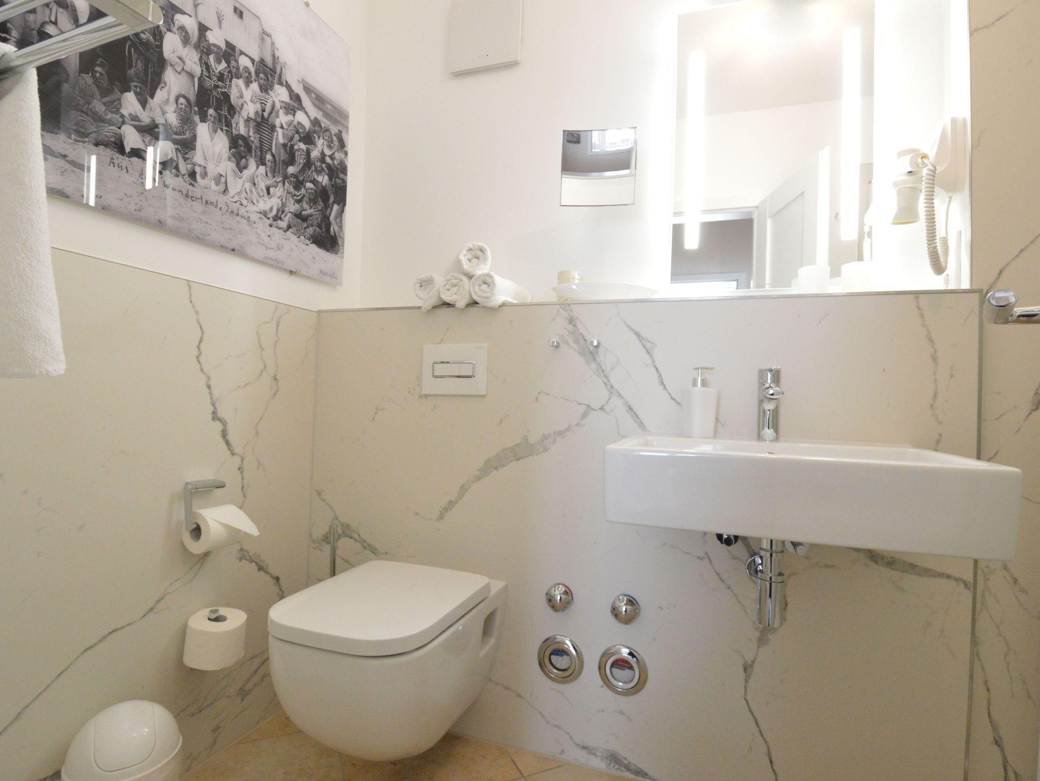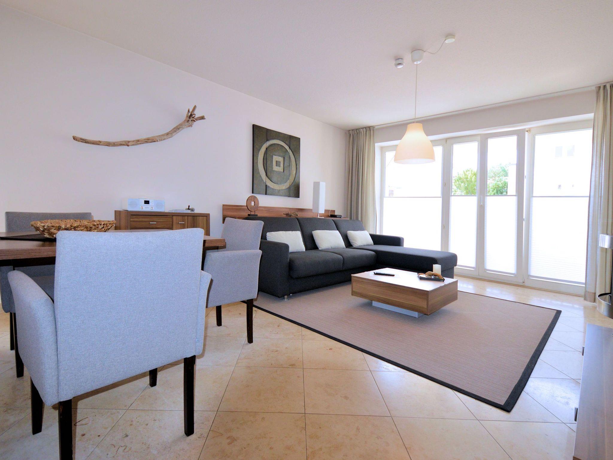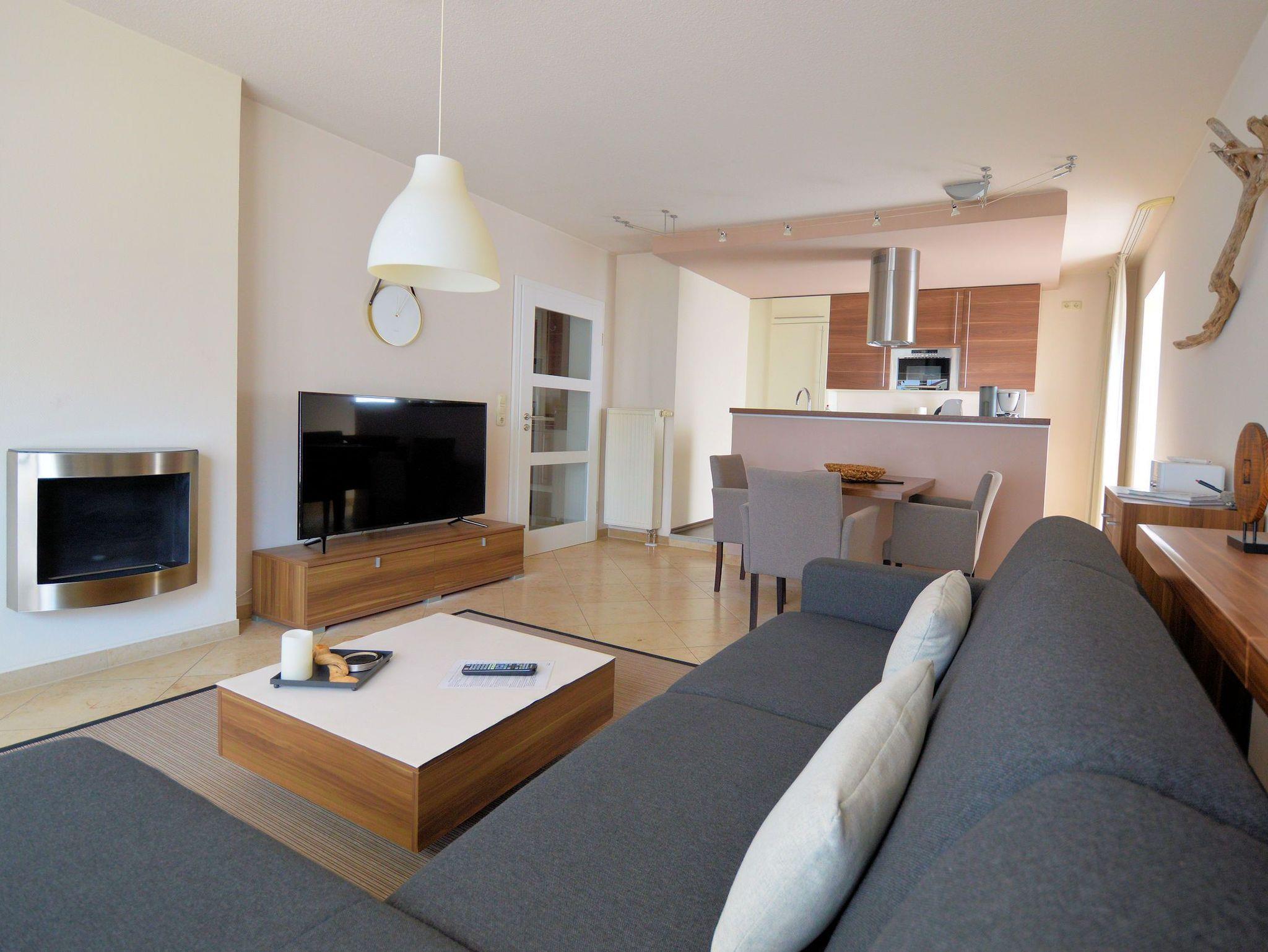 Das Strandappartment ist 52m² groß und befindet sich in Hochpaterre. Auf dem Schlafsofa ist eine Aufbettung für eine Person möglich. Der Kamin im Wohnzimmer wird mit Flüssigbrennstoff als Dekokamin betrieben. Freuen Sie sich auch auf einen Fernseher und eine Musikanlage im Apartment! Ihr Schlafzimmer ist mit einem Doppelbett ausgestattet, das eine großzügige Liegefläche von 180×200 cm bietet. Die Küchenzeile ist komplett ausgestattet mit 4-Platten-Cerankochfeld, Mikrowelle mit Backfunktion, Geschirrspüler, Kühlschrank, Kaffeemaschine, Wasserkocher und Toaster. Das Schlafzimmer in edler Ausstattung hat ein zweites TV-Gerät. Ein komfortables Duschbad mit WC und Haartrockner ist ebenfalls vorhanden.