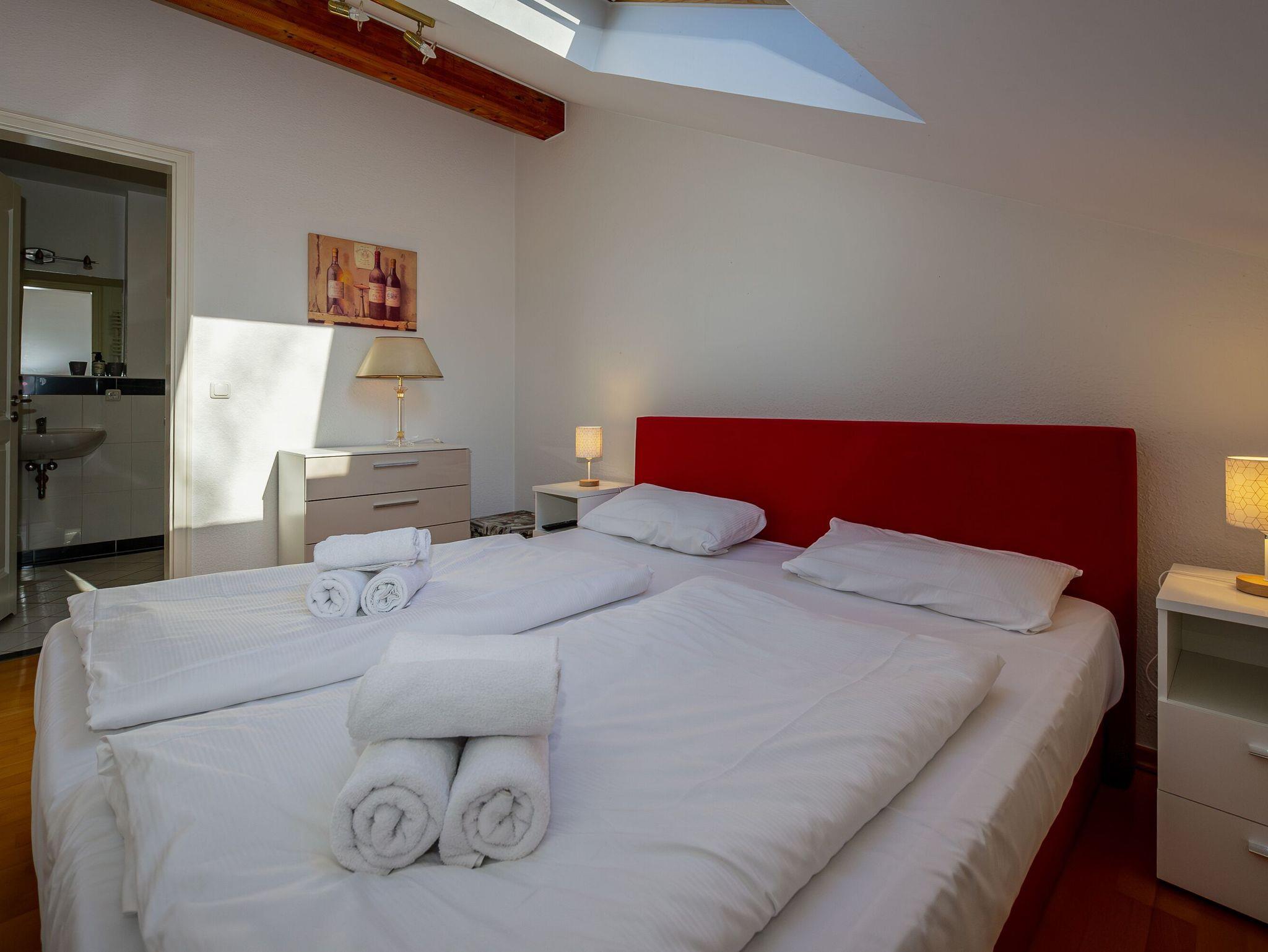 Im Schlafzimmer verspricht ein herrlich bequemes Boxspring-Doppelbett süße Träume. Besonderer Clou dabei: Durch das hoch gelegene Dachfenster können Sie vor dem Einschlafen ganz romantisch den Sternenhimmel beobachten. Ein zusätzlicher Fernseher ist ebenfalls vorhanden. Platz für Ihre Urlaubsgarderobe ist im separaten Schrankzimmer gleich neben dem Eingangsflur.