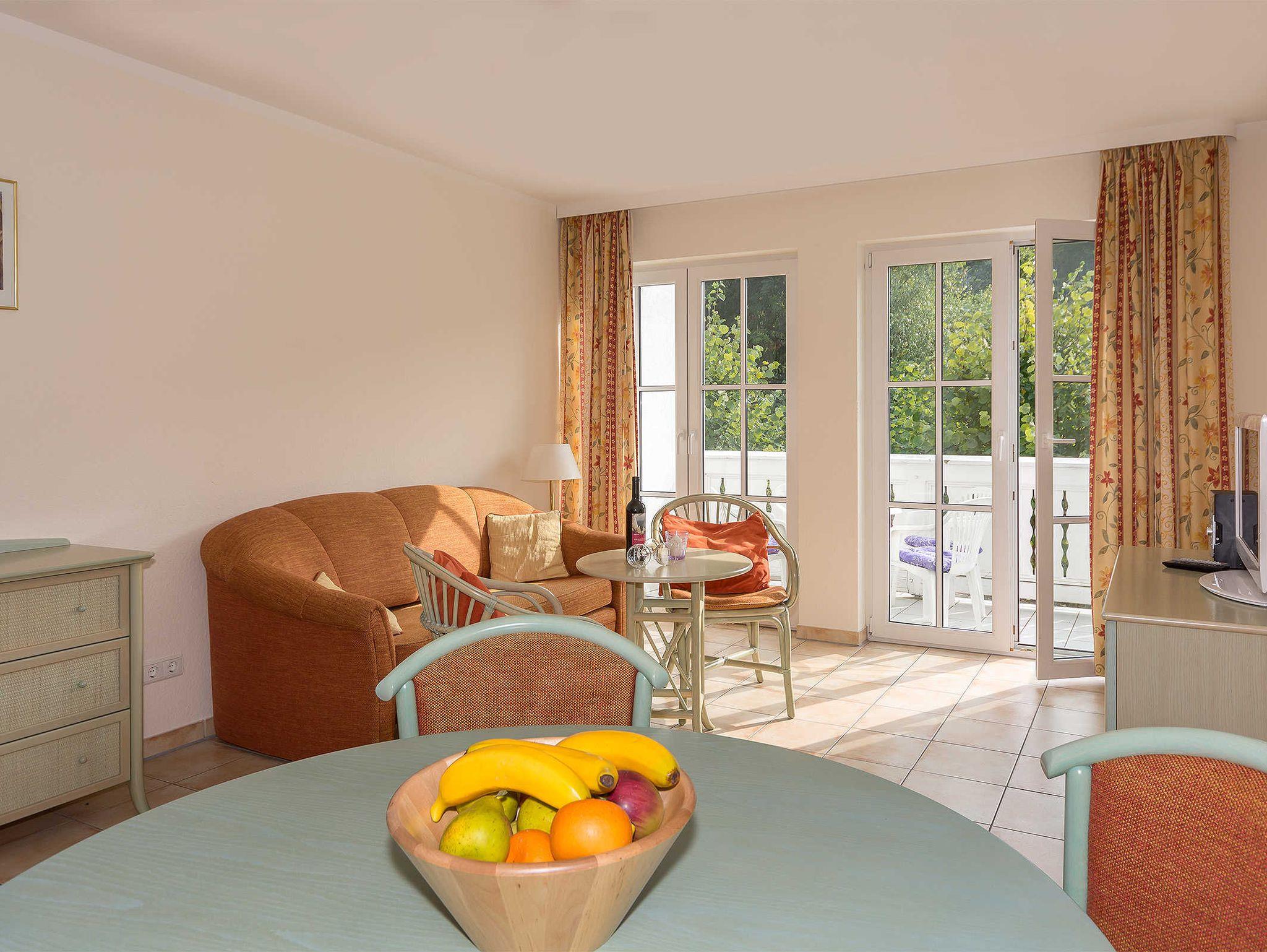 Mediterran eingerichtete Zweiraumwohnung ( Erdgeschoß, Balkon) mit Rattanmöbeln in warmen Farben.