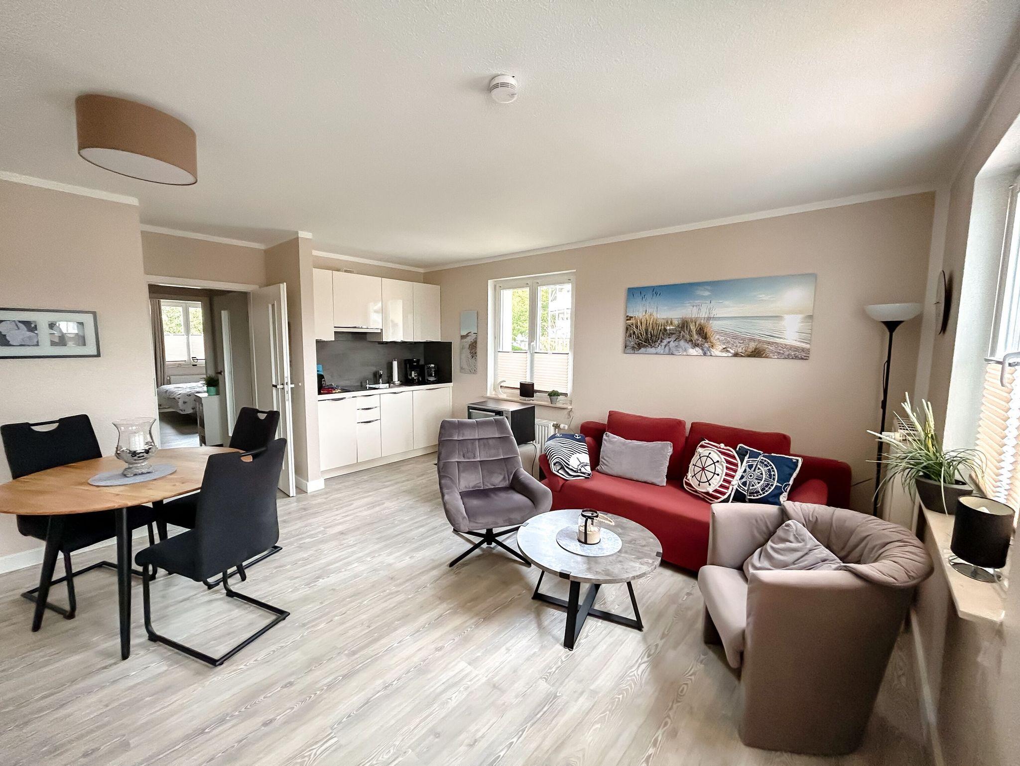 Die in den Wohnbereich integrierte Küchenzeile überzeugt mit ihrer umfangreichen Ausstattung, u.a. einem 2-Zonen-Ceranfeld, einer Spülmaschine, einem Kühlschrank mit Gefrierfach sowie einer Filterkaffeemaschine und einer Tassimo-Kapselmaschine. Selbstverständlich stehen Ihnen auch ein Wasserkocher, Eierkocher, ein Toaster sowie das nötige Küchenequipment für ein leckeres Frühstück oder warme Speisen zur Verfügung, sodass Sie sich bequem selbst versorgen können. Hierzu können Sie Ihr gemütliches Frühstück oder Abendessen wahlweise drinnen am Esstisch einnehmen oder Sie genießen bei schönem Wetter draußen auf dem möblierten Balkon die frische Ostseeluft.