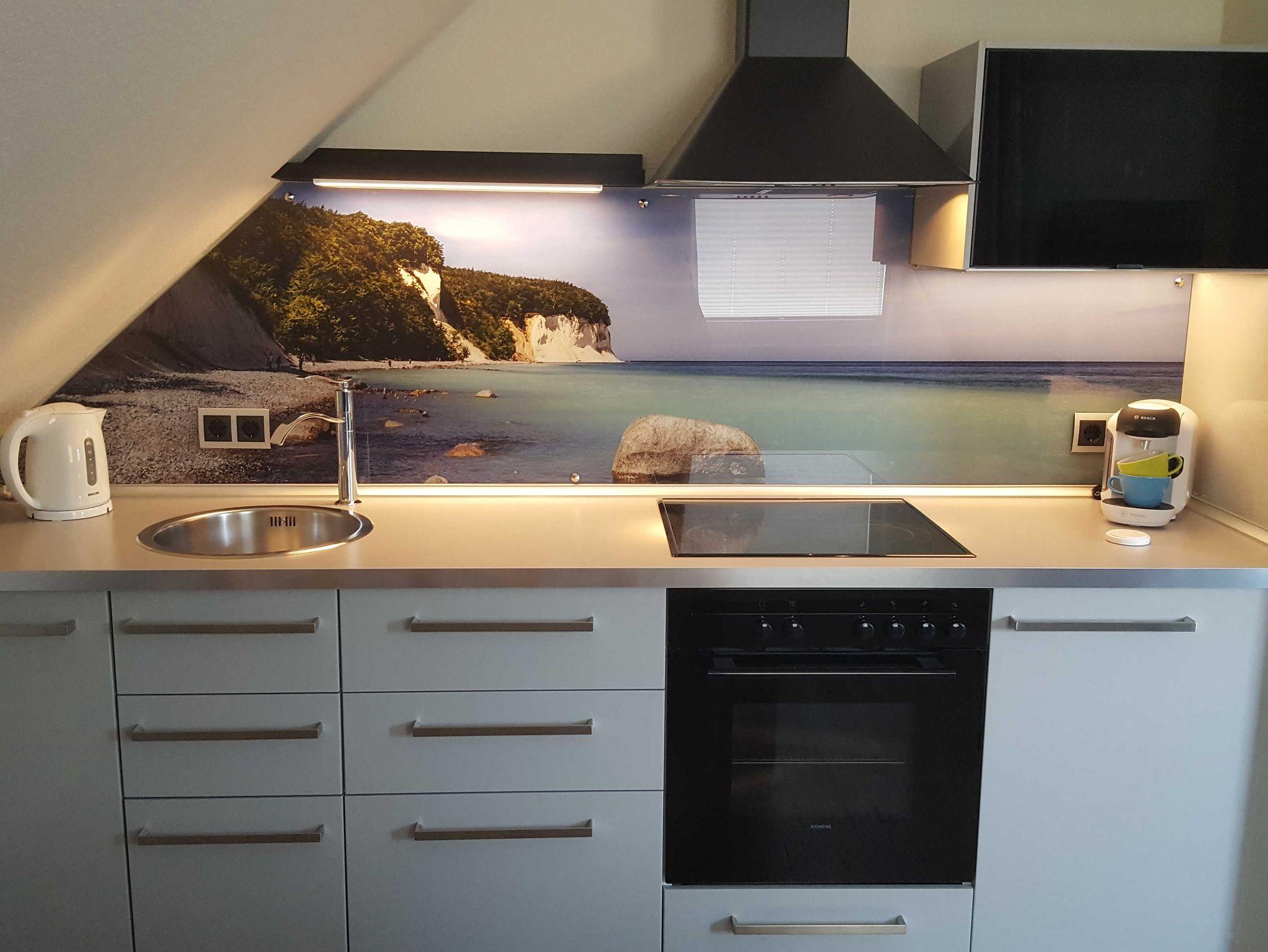 -Wohnzimmer mit Schlafcouch für 1 weitere Personen und gut ausgestattete moderne Küchenzeile mit separatem Essbereich, 1 Schlafzimmer mit Doppelbett (180x200) für 2 Personen und hochwertig ausgestattetes Bad mit Glasdusche