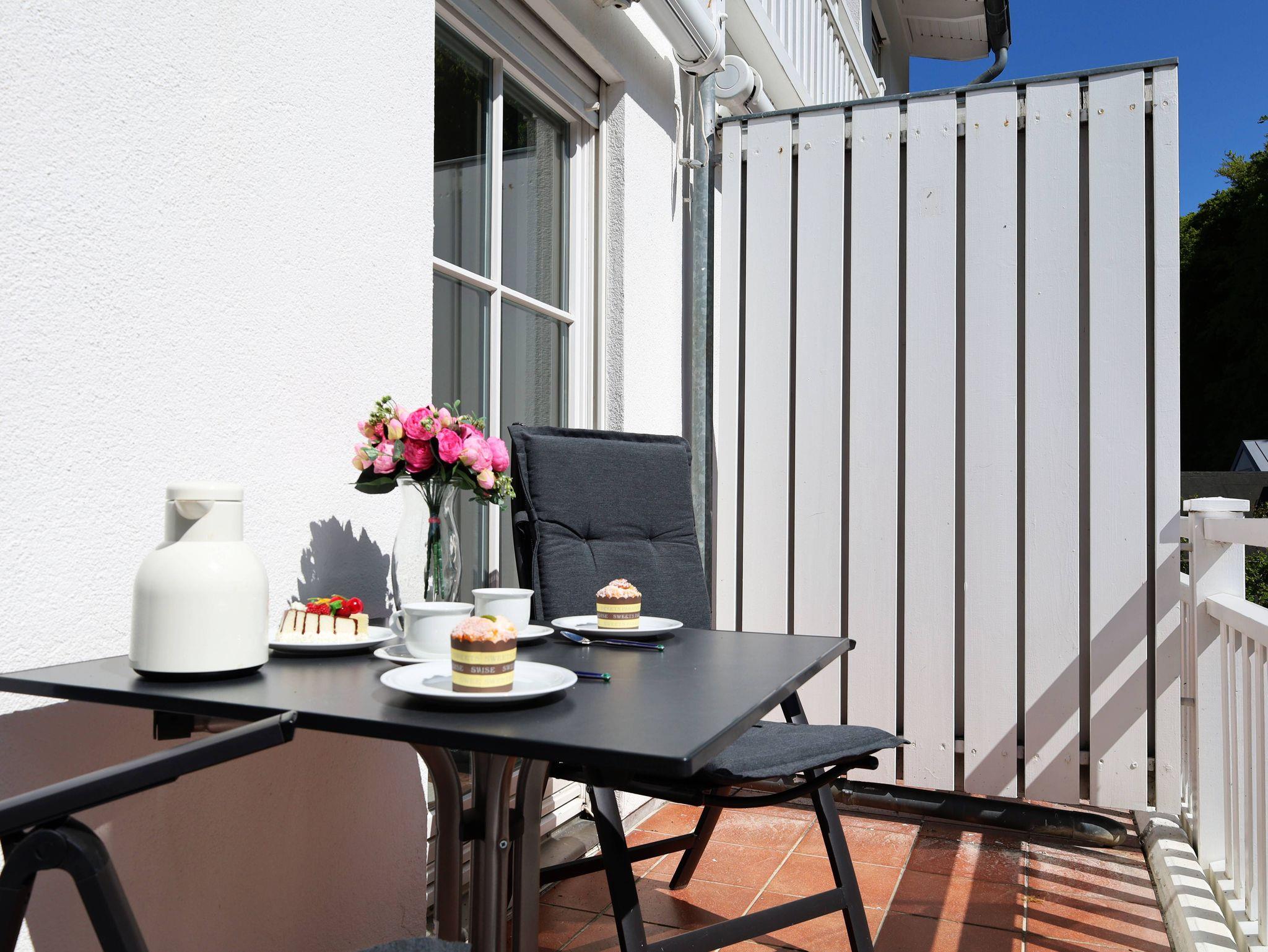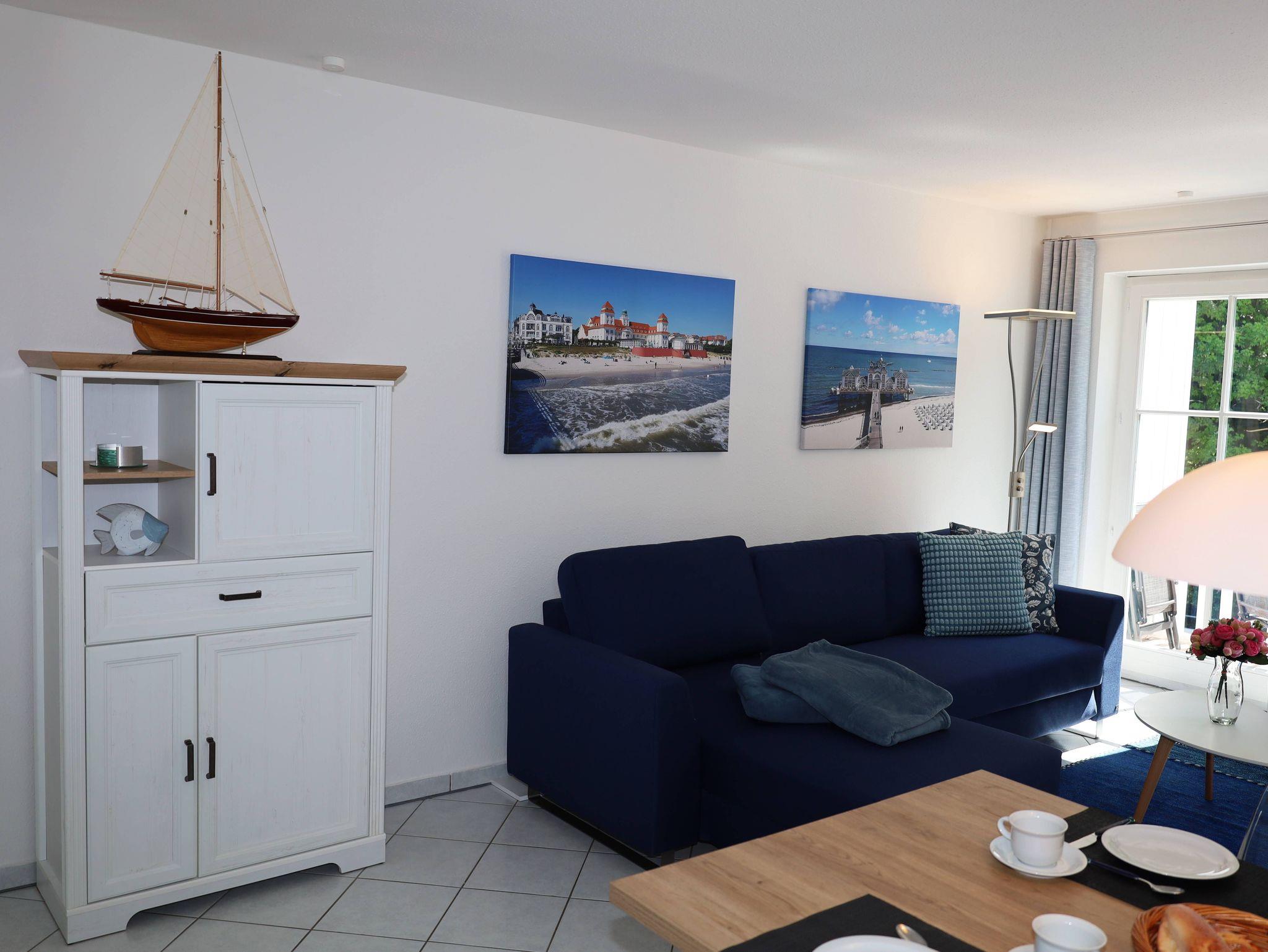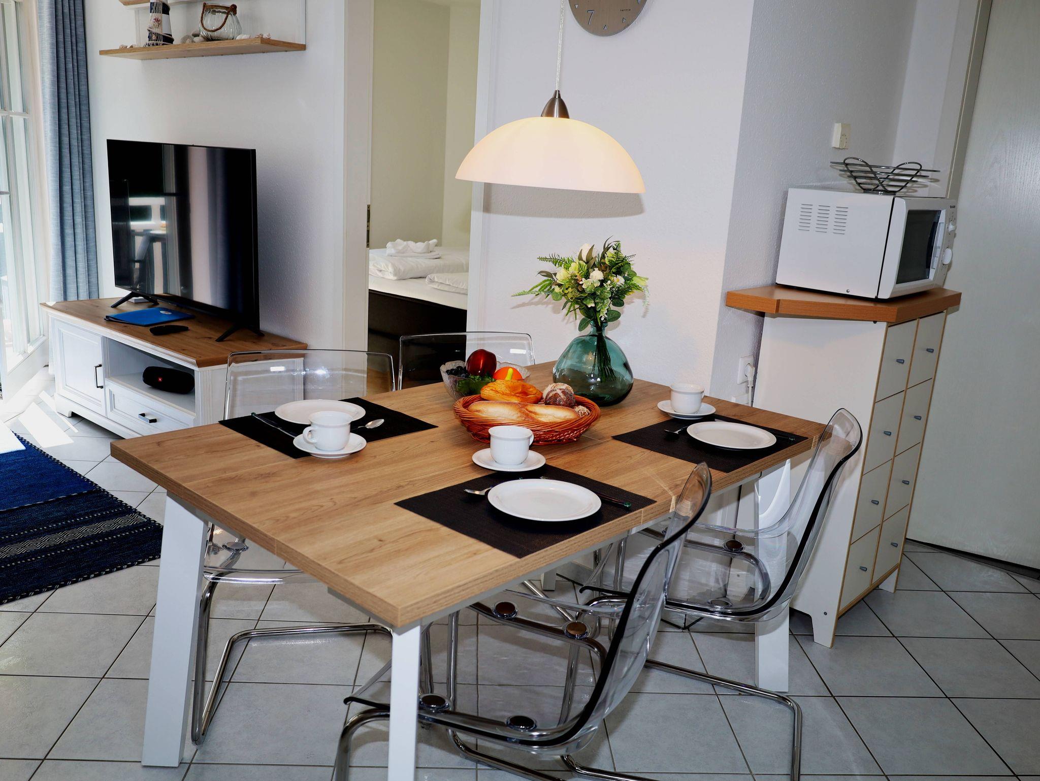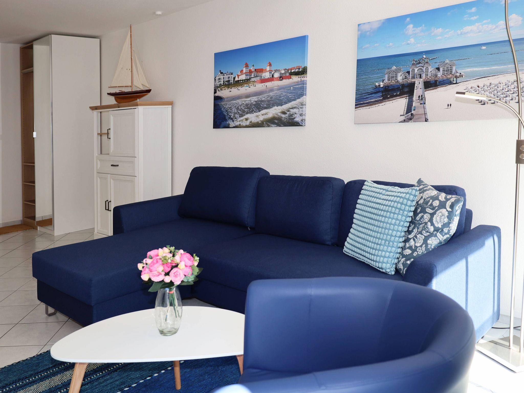 Der helle Wohnbereich lädt mit einer gemütlichen Sitzgruppe zum Entspannen ein. Für Unterhaltung sorgt ein 55-Zoll-Flachbildfernseher, und ein mobiler Bluetooth-Lautsprecher bringt bei Bedarf Ihre Lieblingsmusik ins Urlaubsambiente. Das moderne Schlafsofa kann bei Bedarf als komfortable Aufbettung für eine dritte Person genutzt werden. Vom Wohnzimmer wie auch vom Schlafzimmer gelangen Sie direkt auf den sonnigen Südbalkon ? der ideale Platz für ein Frühstück an der frischen Luft oder einen entspannten Abend.