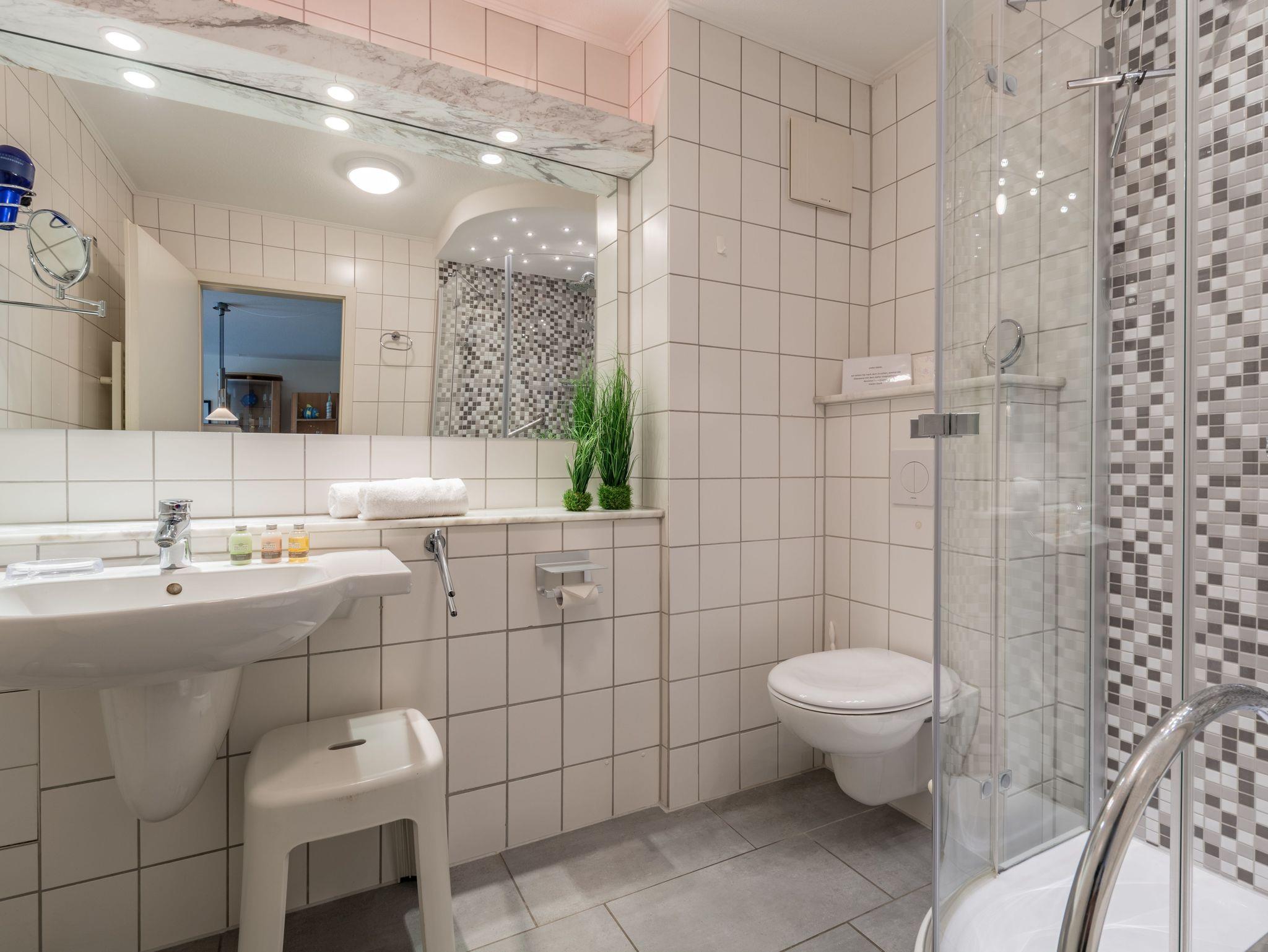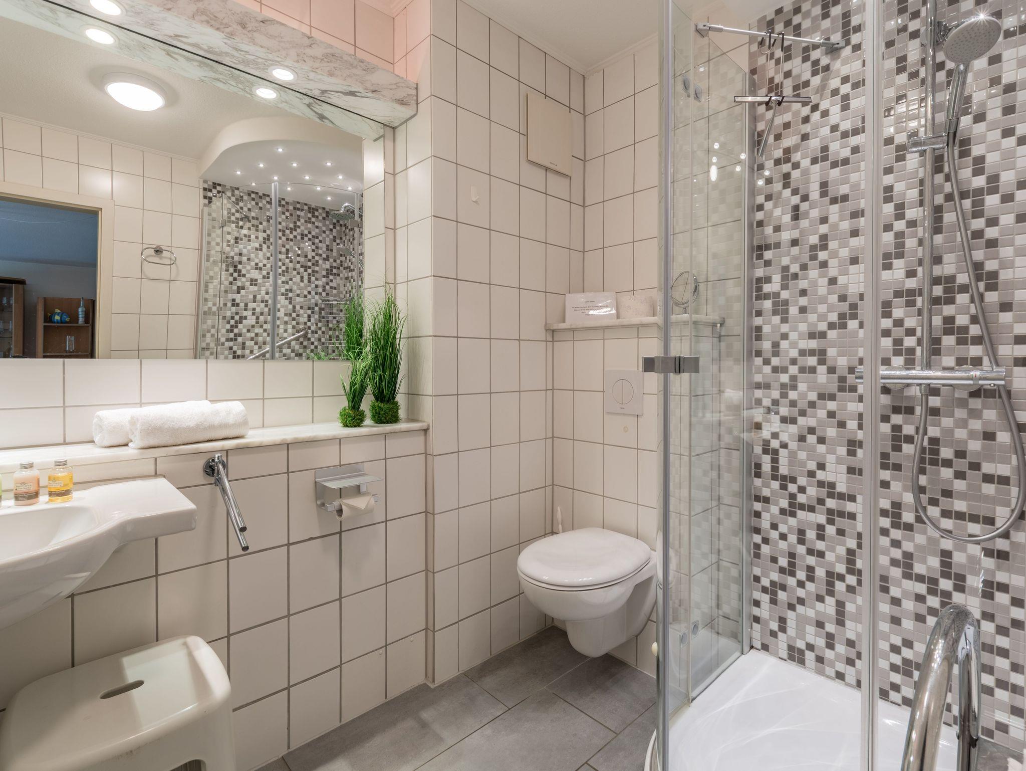 Das lichtdurchflutete Bad ist mit Dusche und WC, einem beleuchteten Waschtisch, Föhn sowie einem beheizbaren Handtuchtrockner ausgestattet. In allen Räumen sorgt eine Fußbodenheizung ganzjährig für angenehme Wärme.