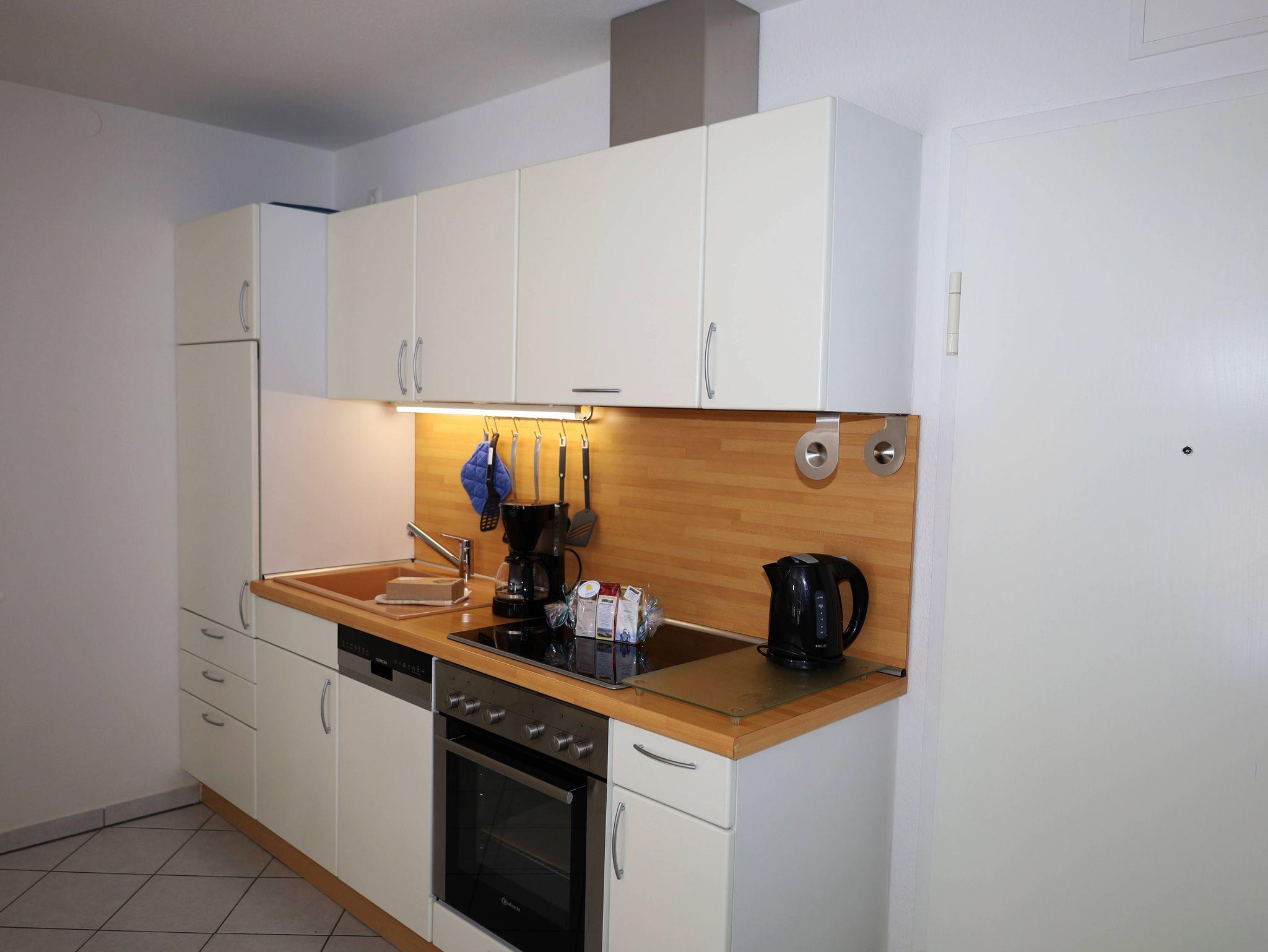 Im Schlafzimmer erwartet Sie ein großzügiges Boxspringbett im Maß 180 × 200 cm, das für erholsame Nächte sorgt, sowie ein geräumiger Kleiderschrank. Die voll ausgestattete Küchenzeile verfügt über einen Kühlschrank mit Gefrierfach, Mikrowelle, Cerankochfeld mit Backofen sowie weitere praktische Geräte wie Wasserkocher, Kaffeemaschine und Toaster ? perfekt für gemütliche Mahlzeiten in Ihrer Ferienwohnung.