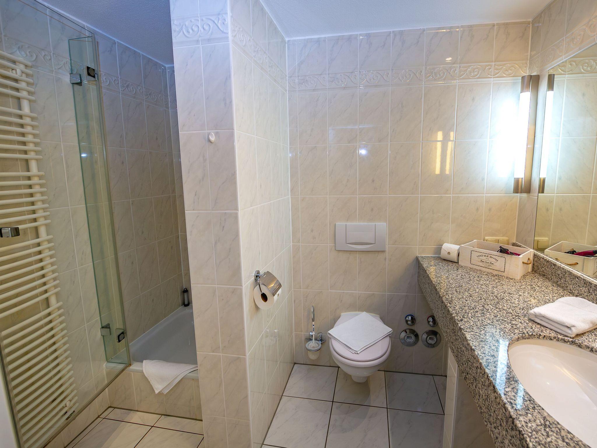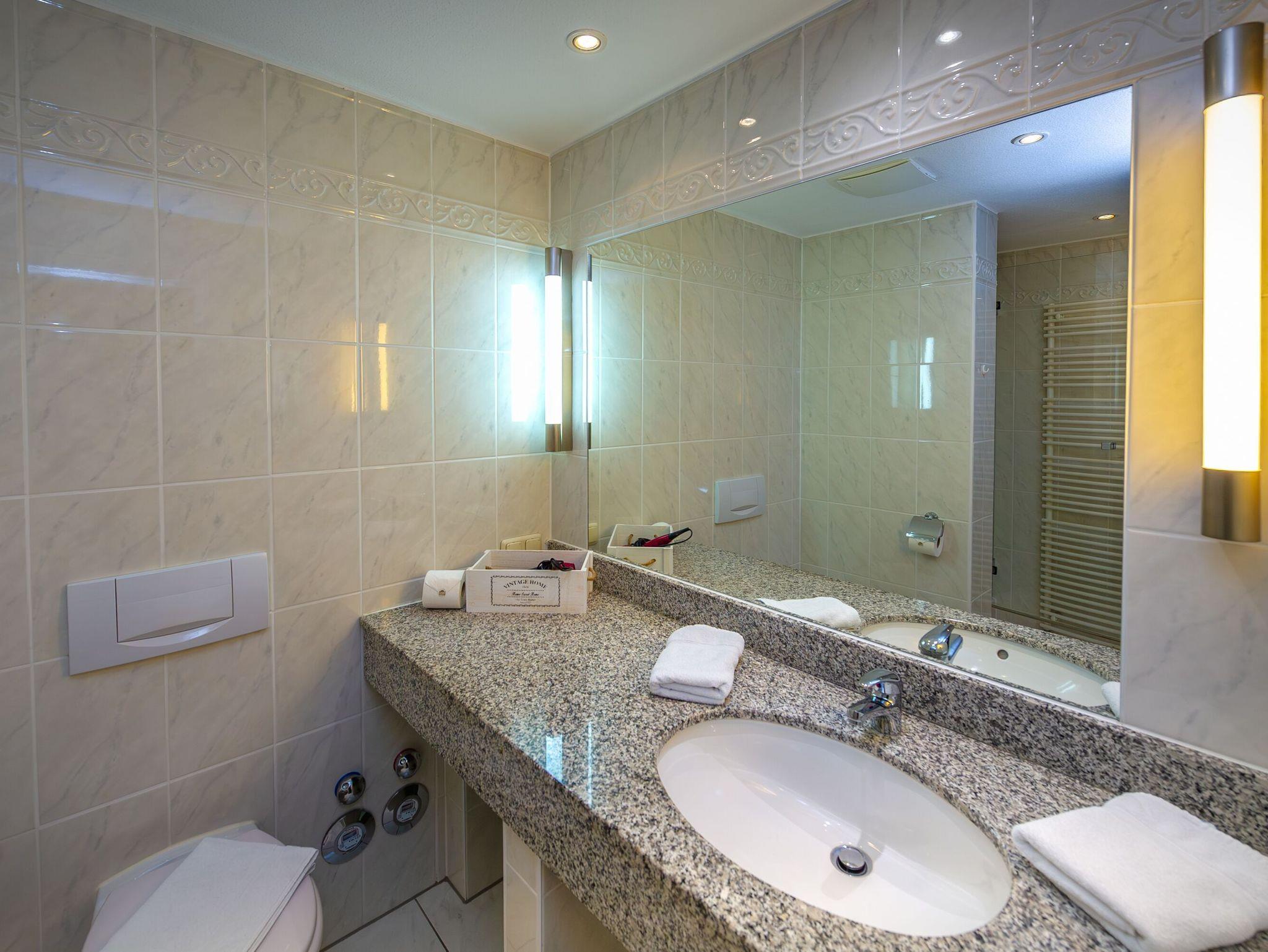 Dusche/WC, ein beleuchteter Waschtisch mit genügend Ablageflächen, einem großen Spiegel und einem Haartrockner sowie ein beheizbarer Handtuchtrockner gehören zur Ausstattung des innenliegenden Badezimmers.