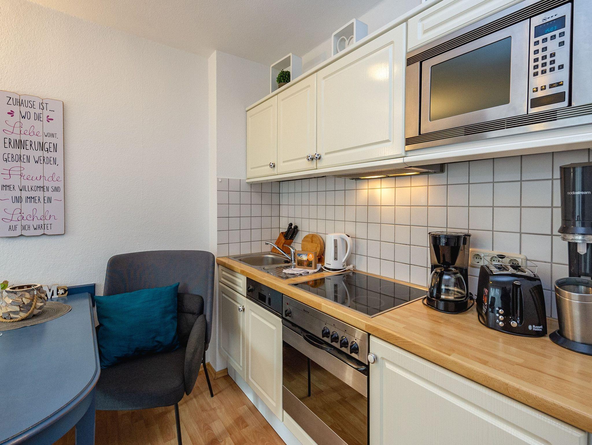 Das Wohnzimmer bietet mit seinem vorgelagerten Balkon mit Blick zum Innenhof, einem gemütlichen Sofa, Sessel, Fernseher, kostenfreiem W-LAN und der integrierten Küchenzeile nebst Esstisch alles zum Wohlfühlen und Entspannen. Die Küchenzeile verfügt über einen Kühlschrank mit Gefrierfach, ein 4-Zonen-Cerankochfeld, einen Backofen, eine Geschirrspülmaschine, eine Mikrowelle, eine DeLonghi-Nespresso-Maschine und eine Filterkaffeemaschine, einen Wasserkocher, einen Toaster und diverses Kleininventar.