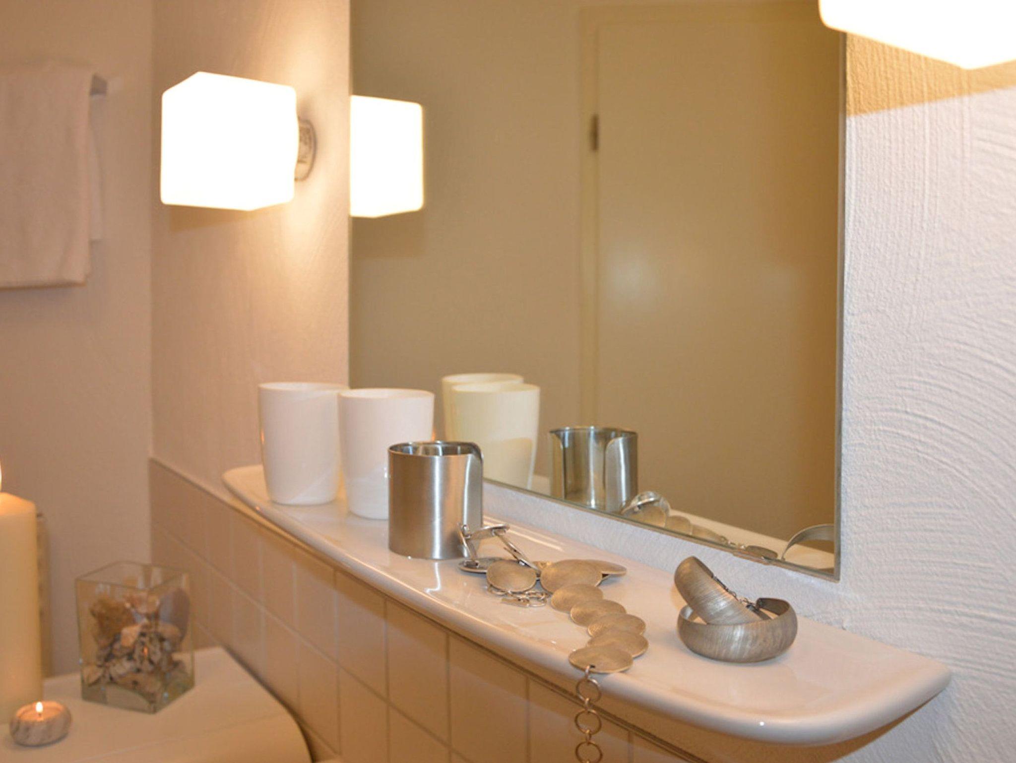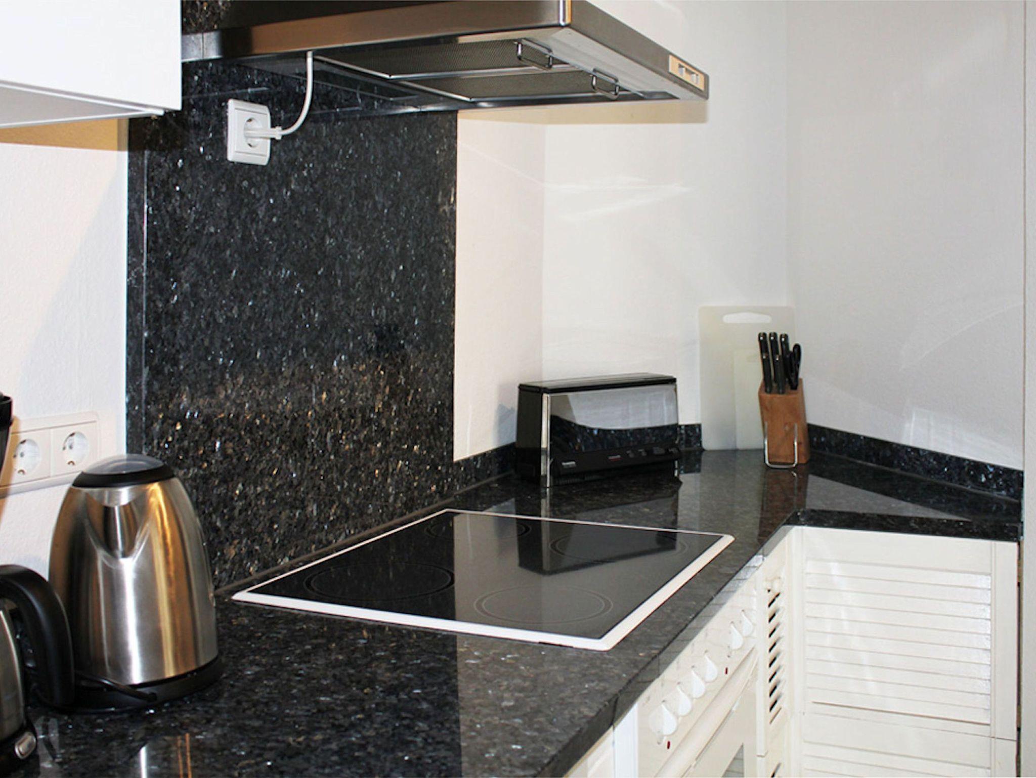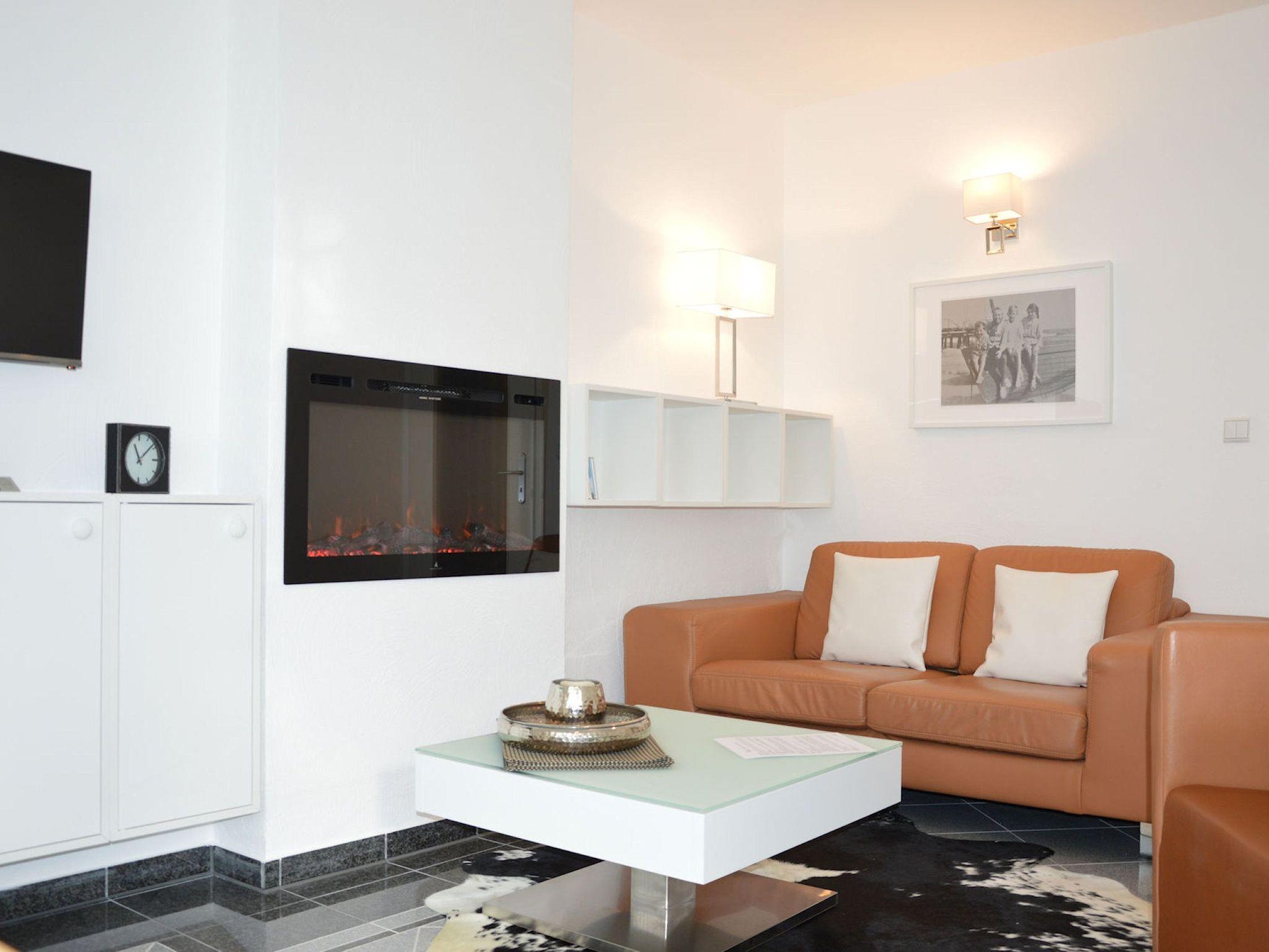 Der helle, großzügig geschnittene Wohn- und Schlafbereich mit 47m² und im Erdgeschoss mit separater Küche, Essplatz, TV und HiFi-Anlage ist elegant möbliert. Der Wohnraum mit Schlaf- und Essbereich ist mit einem Doppelbett ausgestattet, das eine großzügige Liegefläche von 180×200 cm bietet. Auf der Ledercouch mit LED-Kamin (Dekokamin, wärmt nicht) können sie TV oder Musik genießen. Die Wohnung verfügt über einen Schreibtisch, Esstisch und WLAN. Die Küchenzeile ist komplett ausgestattet mit 4-Platten-Cerankochfeld, Backofen, Geschirrspüler, Kühlschrank, Kaffeemaschine, Wasserkocher und Toaster. Ein komfortables Duschbad mit WC und Haartrockner ist ebenfalls vorhanden.