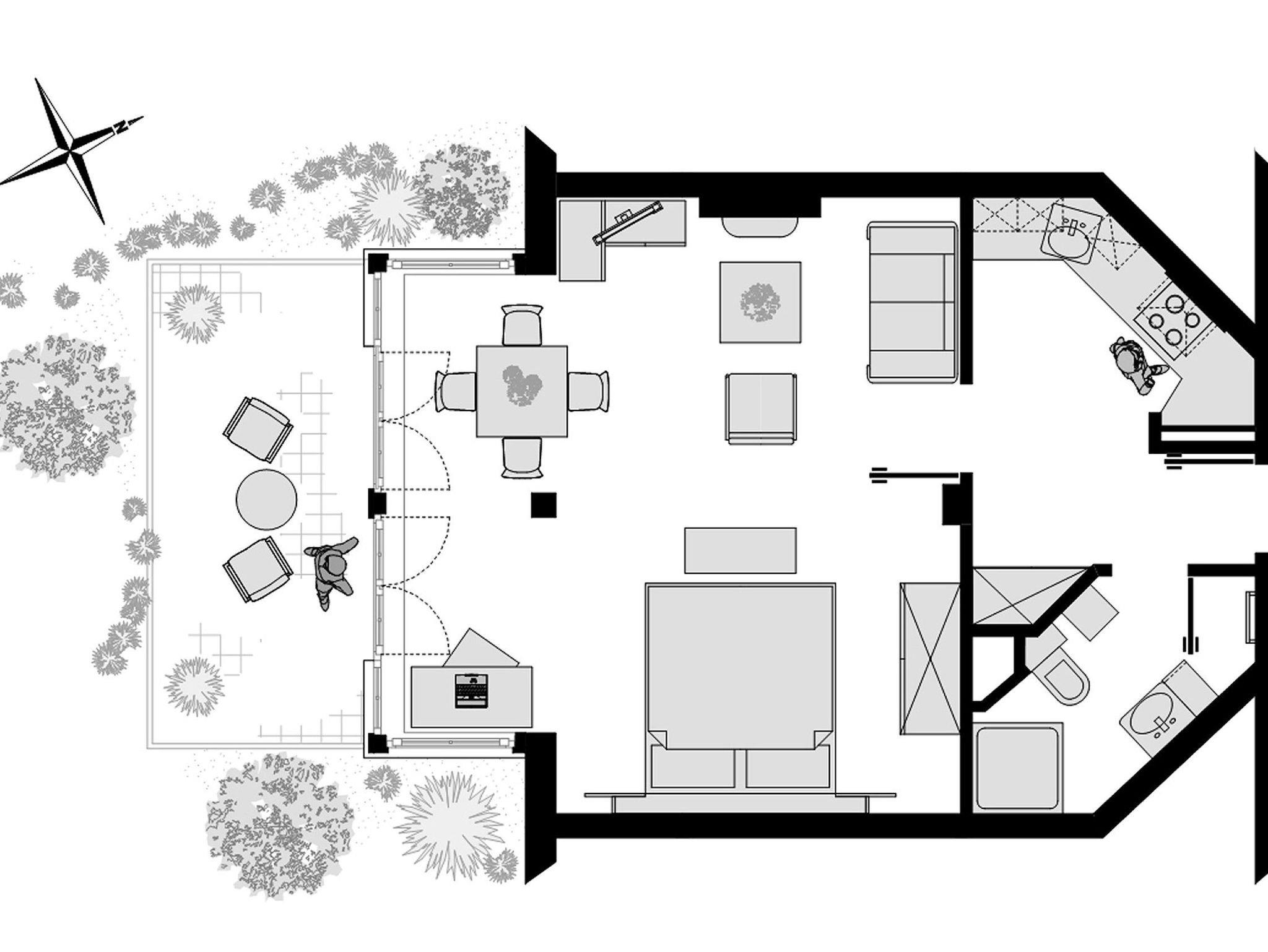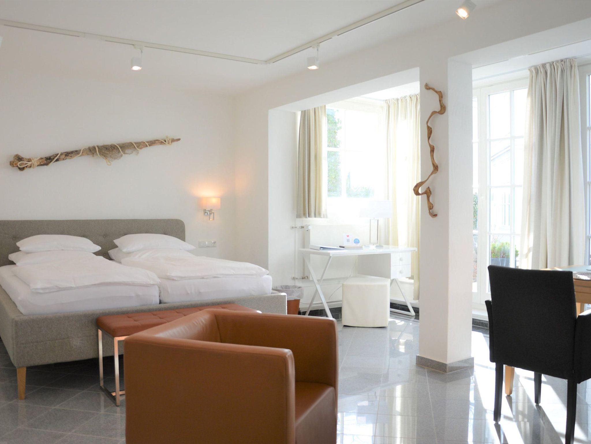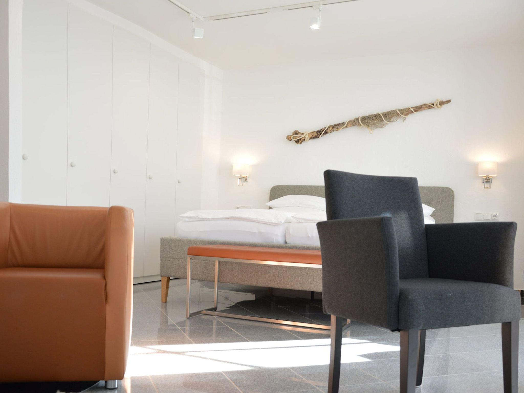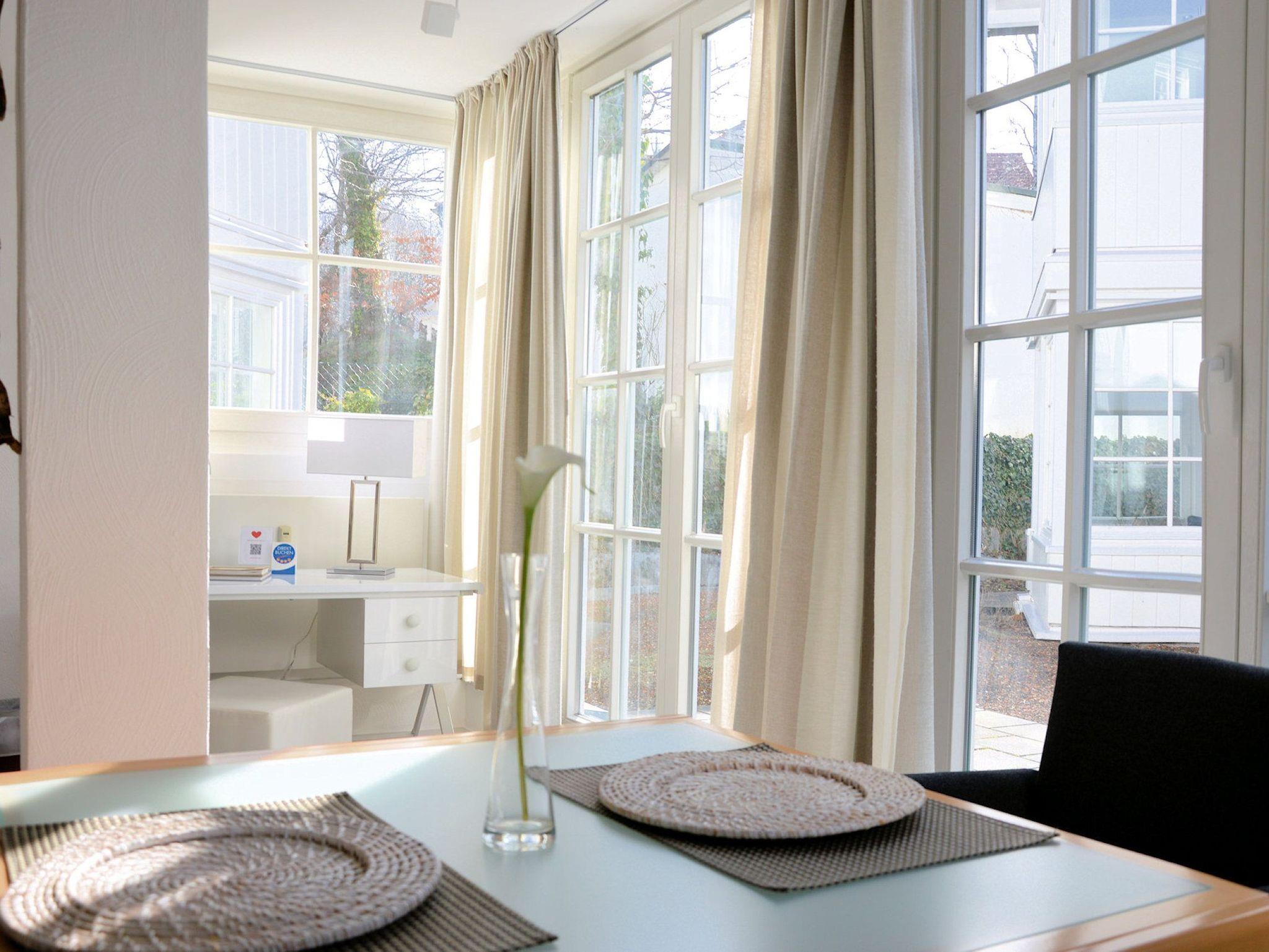Der helle, großzügig geschnittene Wohn- und Schlafbereich mit 47m² und im Erdgeschoss mit separater Küche, Essplatz, TV und HiFi-Anlage ist elegant möbliert. Der Wohnraum mit Schlaf- und Essbereich ist mit einem Doppelbett ausgestattet, das eine großzügige Liegefläche von 180×200 cm bietet. Auf der Ledercouch mit LED-Kamin (Dekokamin, wärmt nicht) können sie TV oder Musik genießen. Die Wohnung verfügt über einen Schreibtisch, Esstisch und WLAN. Die Küchenzeile ist komplett ausgestattet mit 4-Platten-Cerankochfeld, Backofen, Geschirrspüler, Kühlschrank, Kaffeemaschine, Wasserkocher und Toaster. Ein komfortables Duschbad mit WC und Haartrockner ist ebenfalls vorhanden.