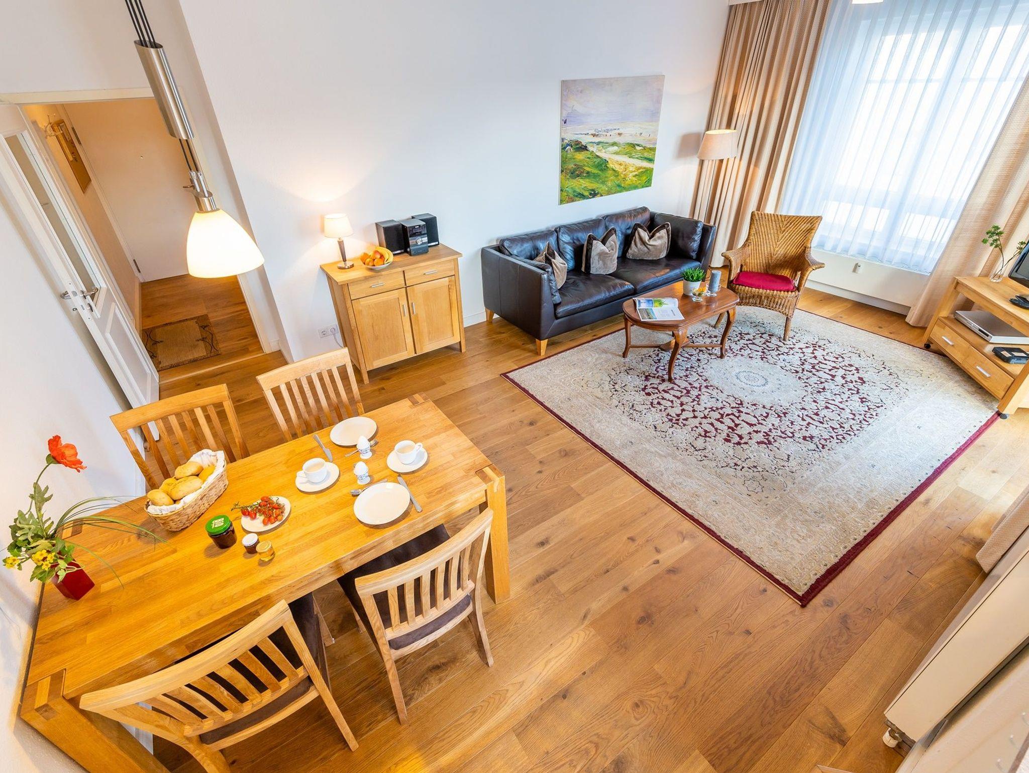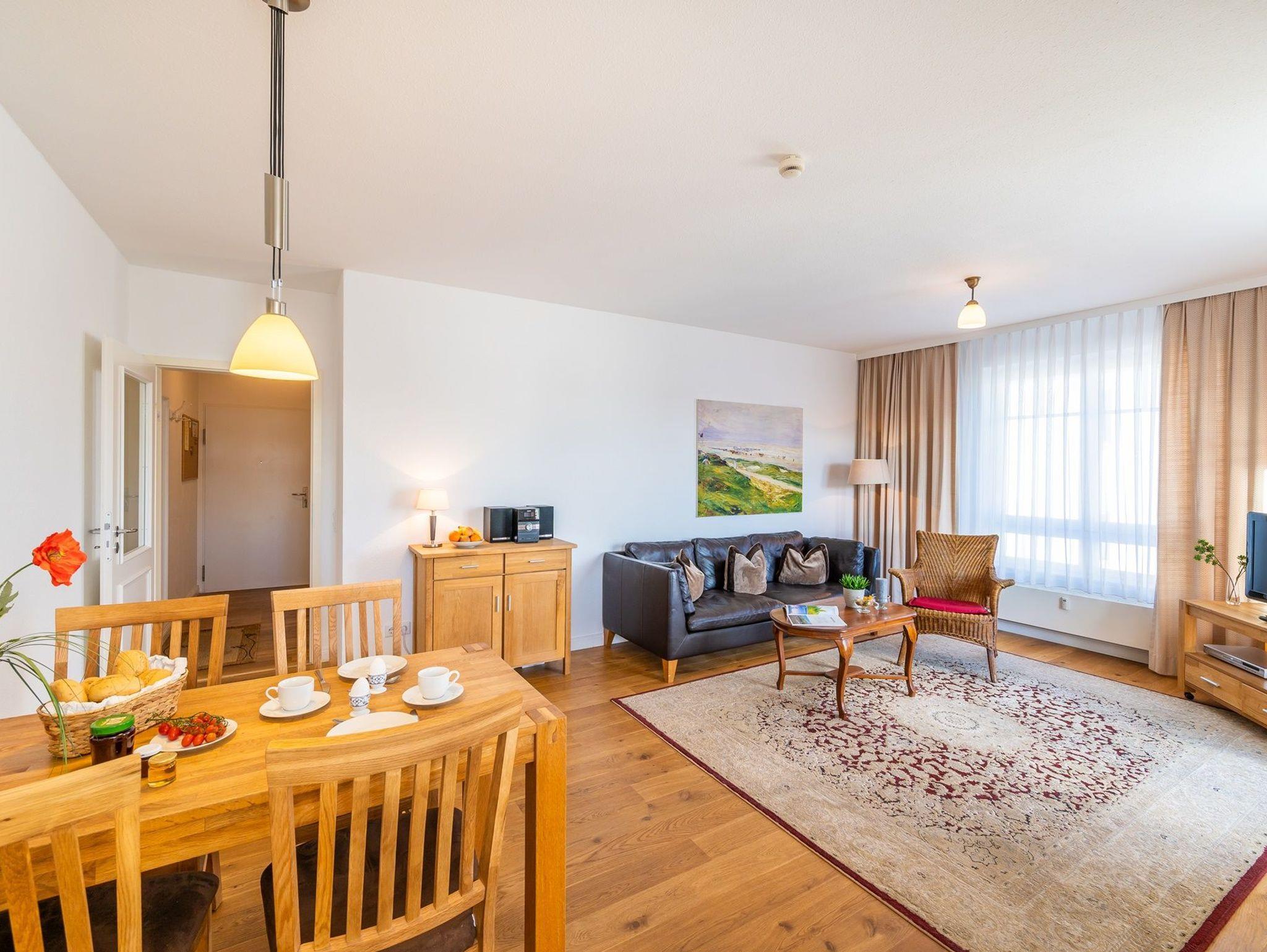 Der offene Wohnraum ist hell und freundlich gestaltet. Eine bequeme Couch, ein Esstisch, ein Flachbild-TV und kostenfreies WLAN sorgen für Komfort. Die integrierte Küchenzeile ist voll ausgestattet: Kochfeld, Backofen, Spülmaschine, Kaffeemaschine, Toaster, Wasserkocher und Kühlschrank mit Gefrierfach stehen zur Verfügung.