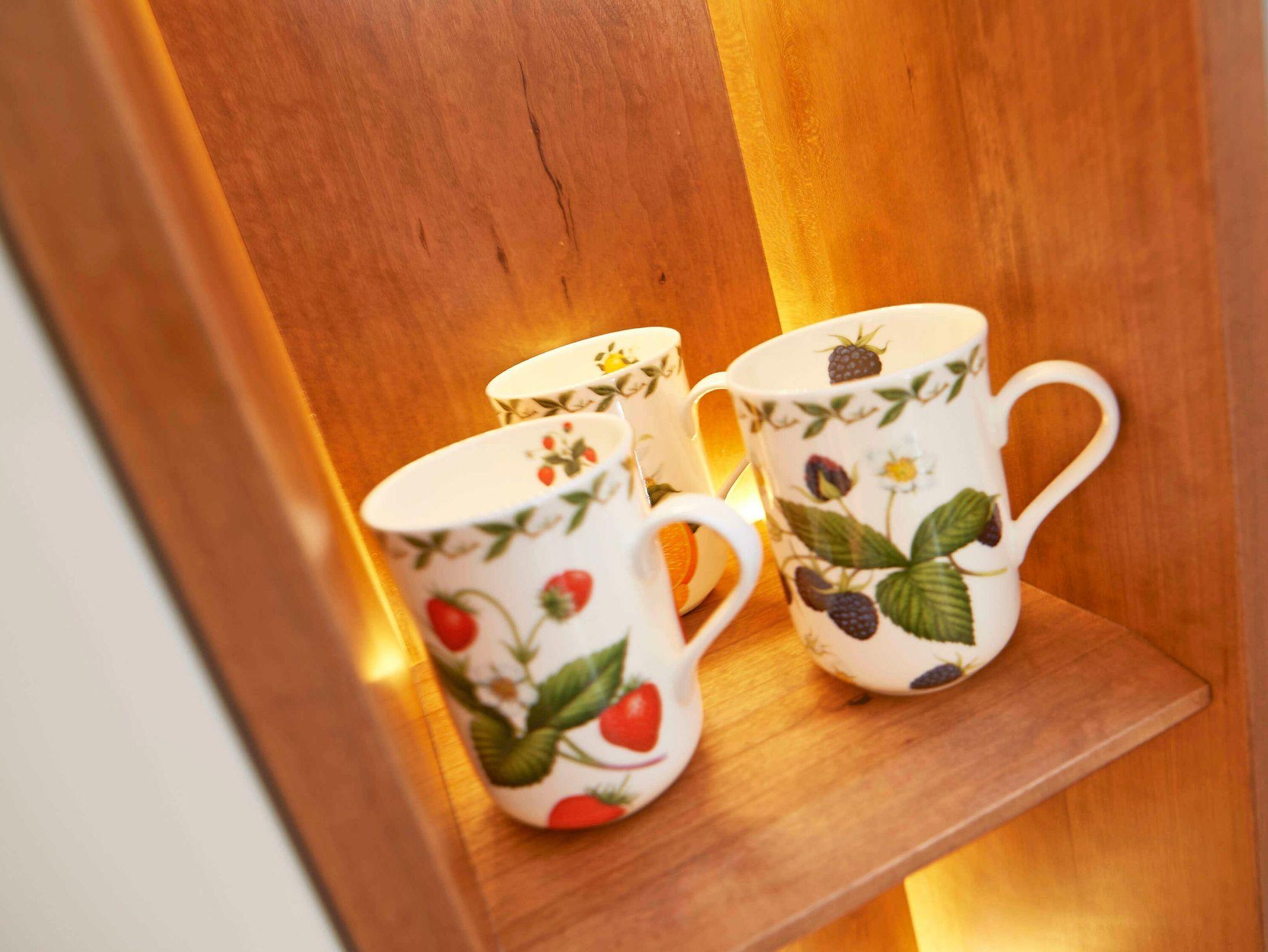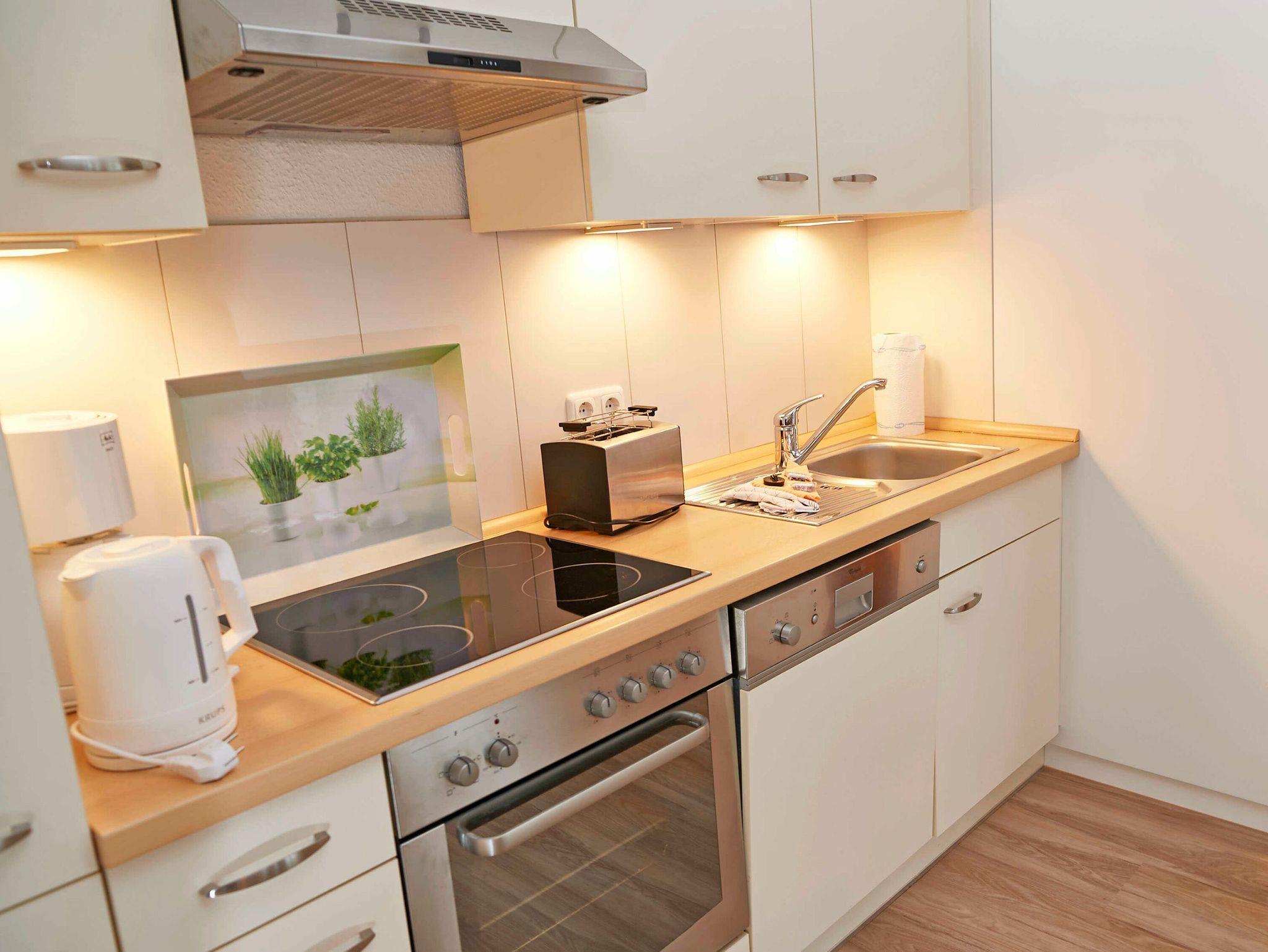 In der Küche finden Sie u.a. ein 4-Zonen-Cerankochfeld, Backofen, Kühlschrank mit Gefrierfach, Spülmaschine, Kaffeemaschine, Toaster, Wasserkocher und diverses Kleininventar, das die Küchenausstattung komplettiert.