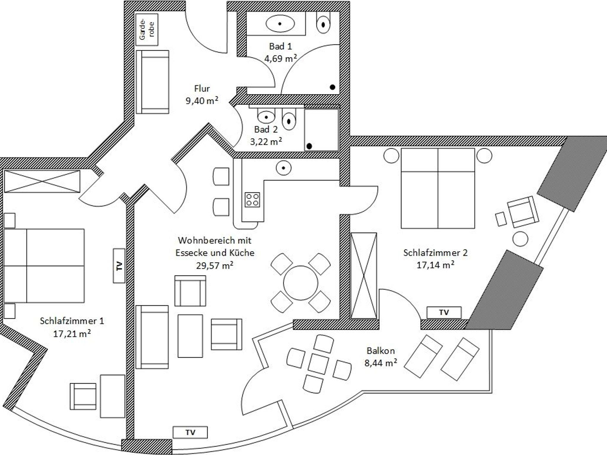 2 Schlafzimmer mit Doppelbetten & Flat-TV