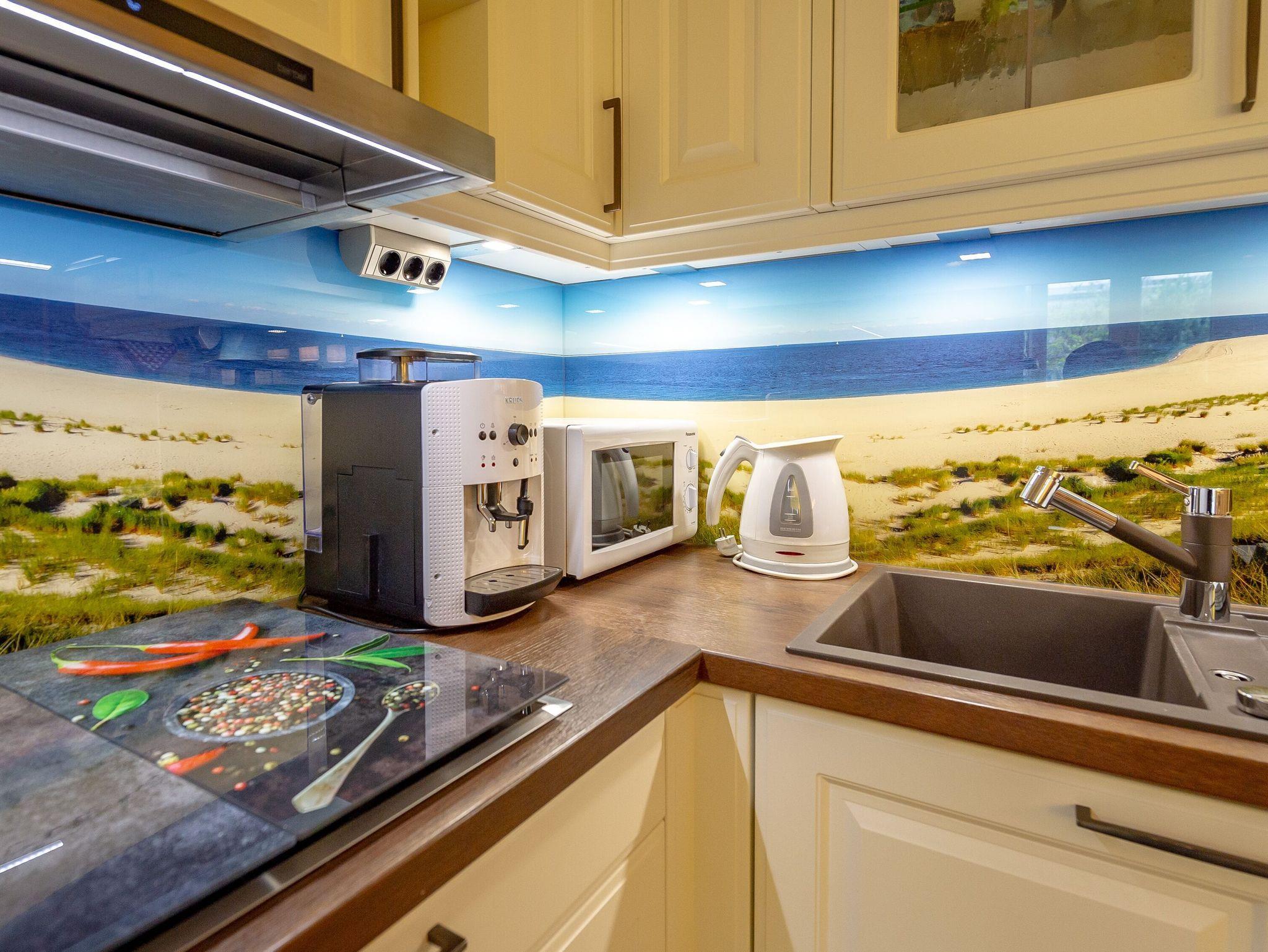 Die harmonisch in den Wohnbereich integrierte Küchenzeile sieht nicht nur chic aus, sondern ist mit einem Kühlschrank mit Gefrierfach, einem Glaskeramik-Kochfeld inkl. Backofen mit Umluftfunktion, einer Spülmaschine, einer Mikrowelle, einem Kaffeeautomaten (Bohnen) sowie Toaster, Handmixer, Eierkocher und diversem Kleininventar bestens ausgestattet. Der Esstisch mit vier Stühlen ermöglichen es Ihnen, Ihren Tag gemütlich bei Kaffee/Tee und Brötchen zu beginnen. Der nächste Bäcker ist übrigens nur ca. 5 Gehminuten entfernt.