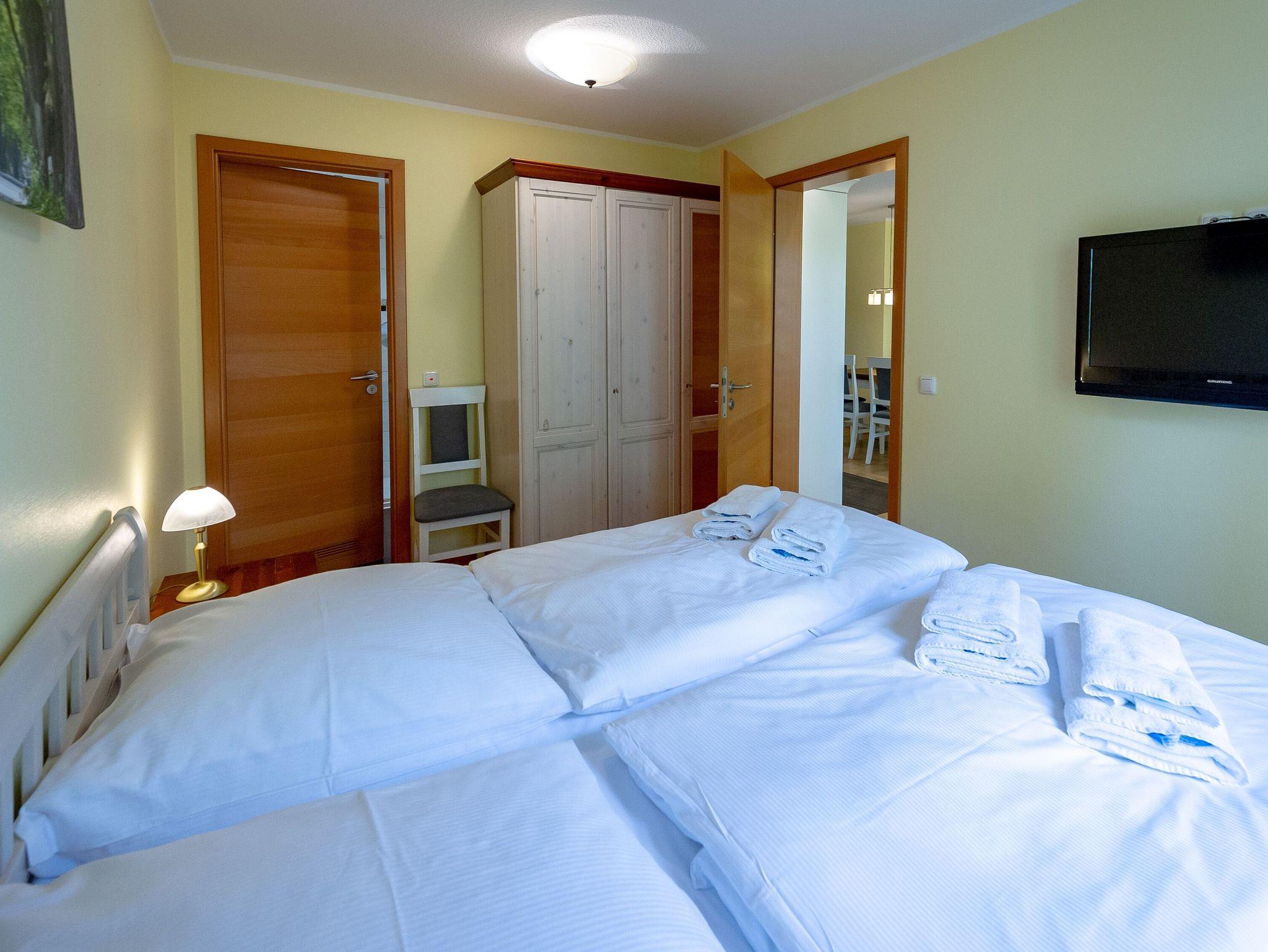 Das größere der beiden Schlafzimmer ist mit einem Doppelbett, einem großen Schrank für Ihre Garderobe sowie einem Flachbildfernseher ausgestattet. Das kleinere Schlafzimmer verfügt ebenfalls über ein Doppelbett sowie einen dreitürigen Kleiderschrank. Die Betten sind allergikerfreundlich.