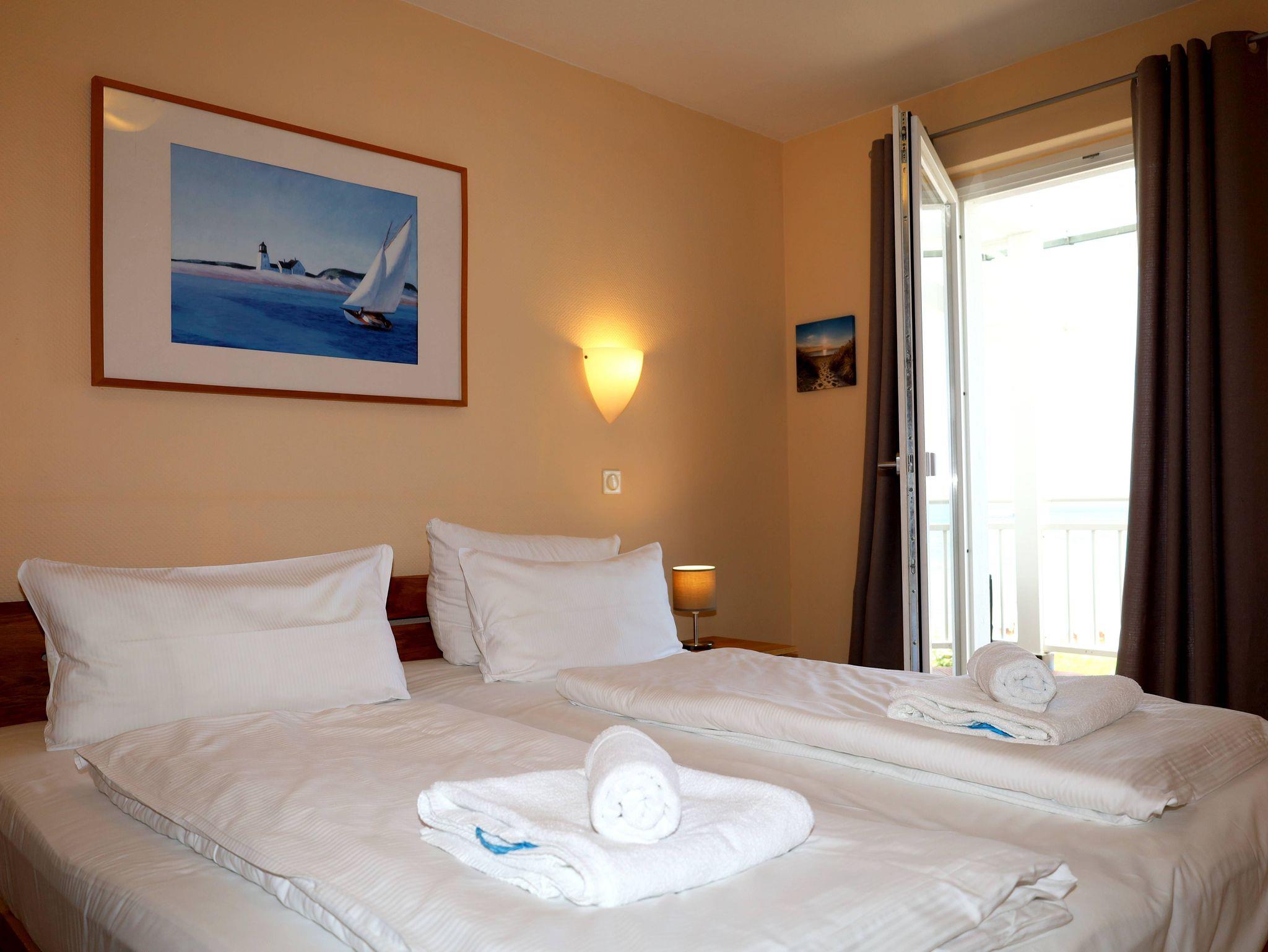 Das 2-Raum-Apartment befindet sich im 2. Obergeschoss und ist für bis zu 4 Personen geeignet. Das Apartment verfügt über einen Balkon mit frontalem Meerblick.