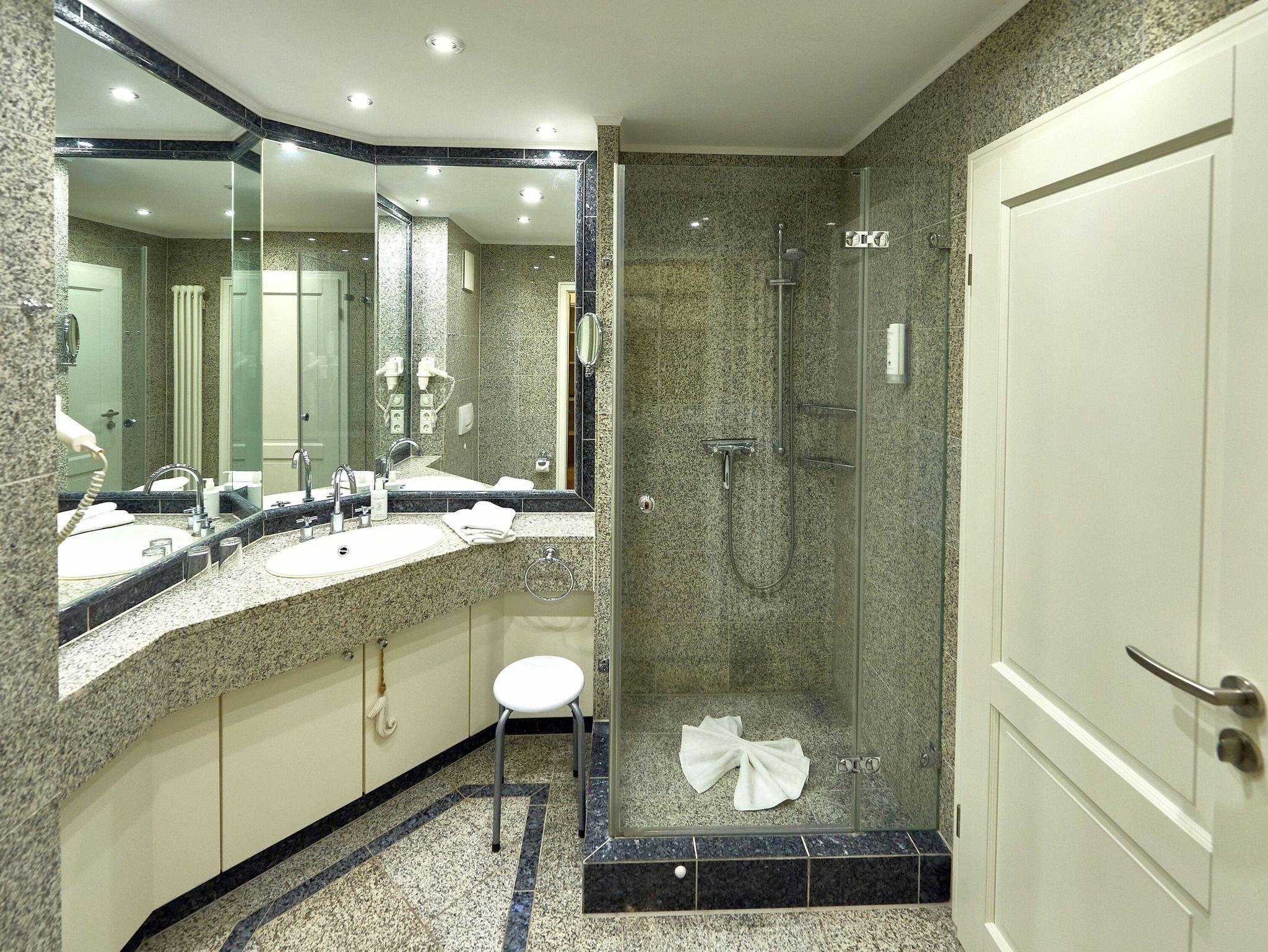 Das Bad ist mit italienischen Granitfliesen, großen Spiegelflächen und einer geräumigen Glasdusche ausgestattet. Ein Wandfön, Badhocker und Kosmetikspiegel sowie ein beheizbarer Handtuchtrockner stehen zur Verfügung.