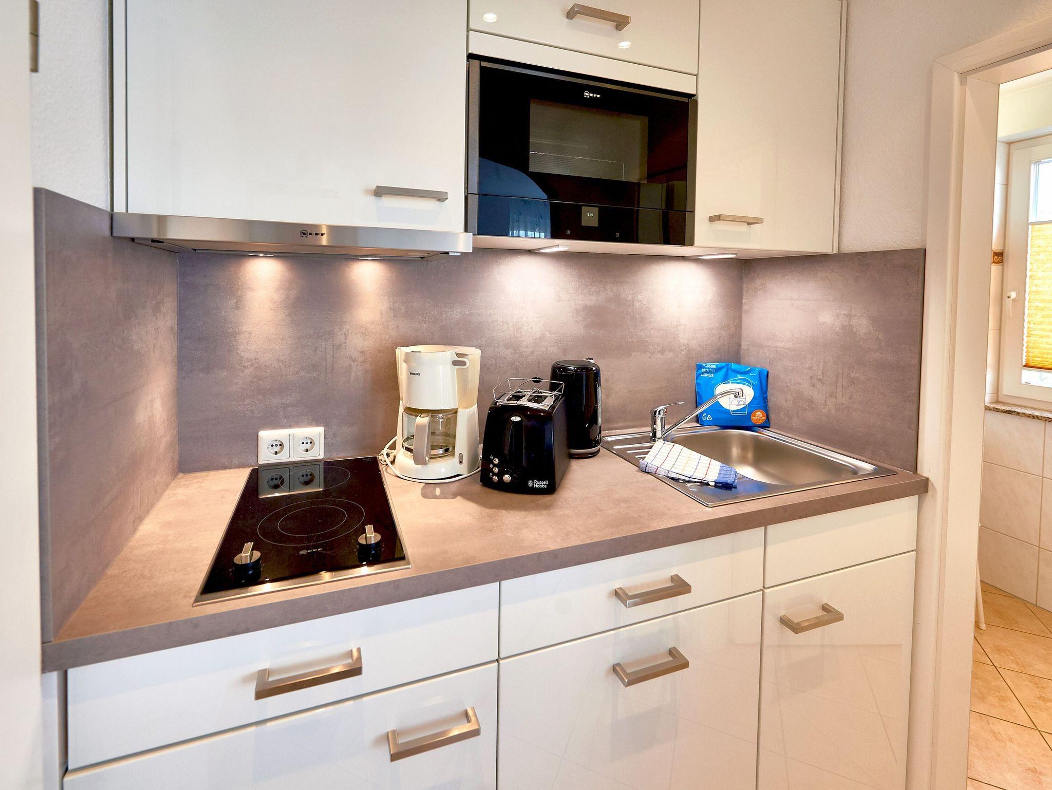 Die integrierte Küchenzeile bietet einen Kühlschrank mit Gefrierfach, eine Spülmaschine, ein 2er-Kochfeld, eine Mikrowelle sowie Kaffeemaschine, Toaster, Eierkocher, Handmixer etc. Selbstverständlich ist auch das nötige Koch- und Essgeschirr vorhanden.