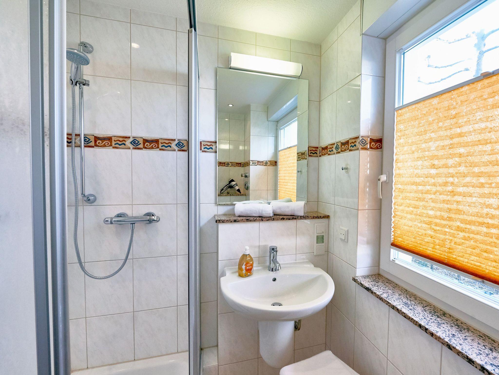 Außerden gibt es ein modernes Duschbad mit WC, Haartrockner und Kosmetikspiegel.