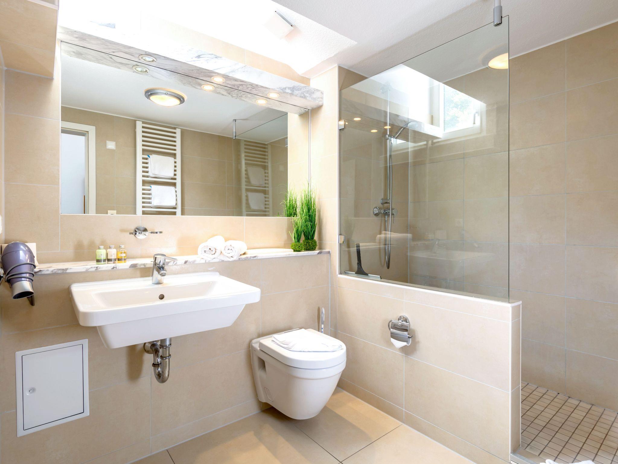 Das moderne Badezimmer verfügt über eine Dusche, Fußbodenheizung, einen beleuchteten Waschtisch sowie einen Föhn.